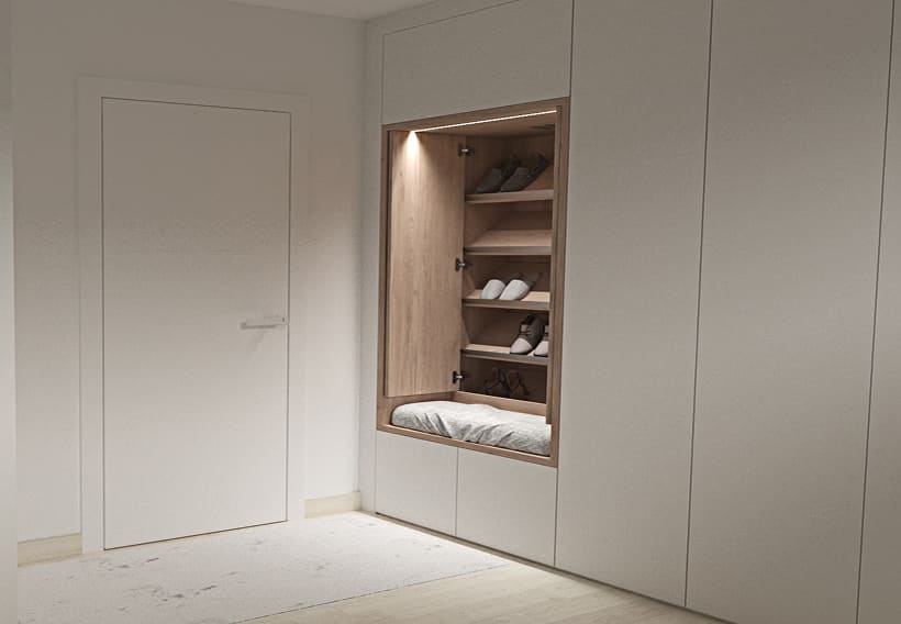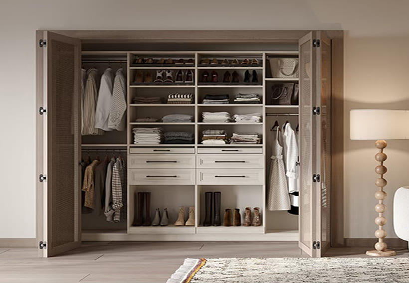 Smart storage solutions combining built-in reach-in closets and European-style wardrobes with doors, drawers, and tailored interior layouts.