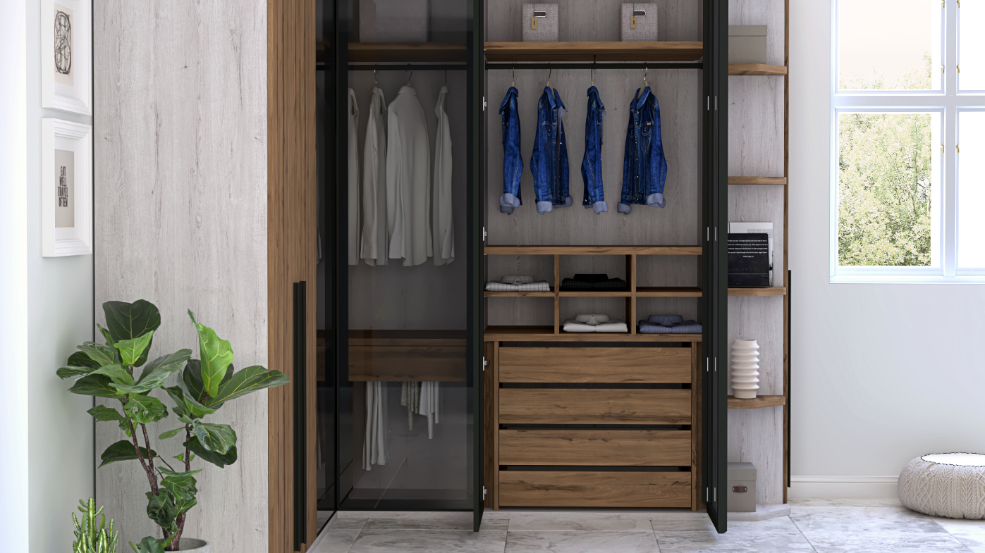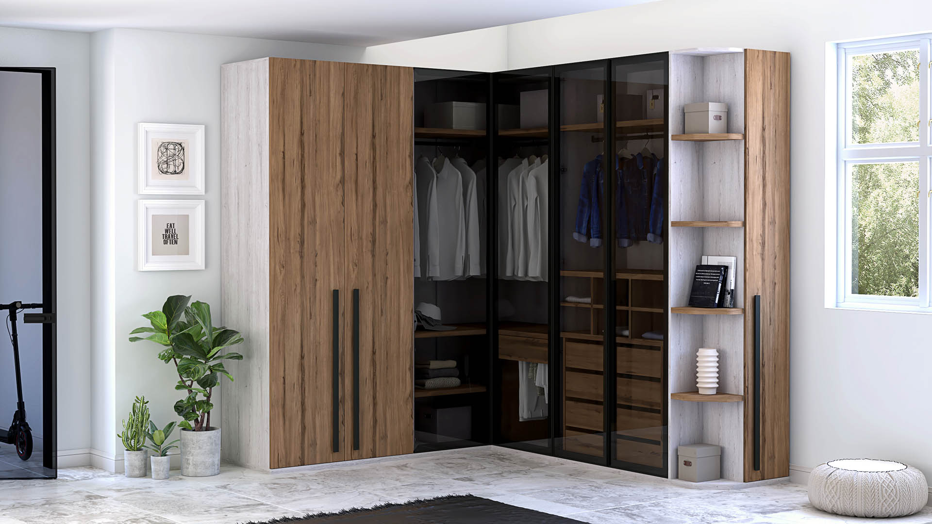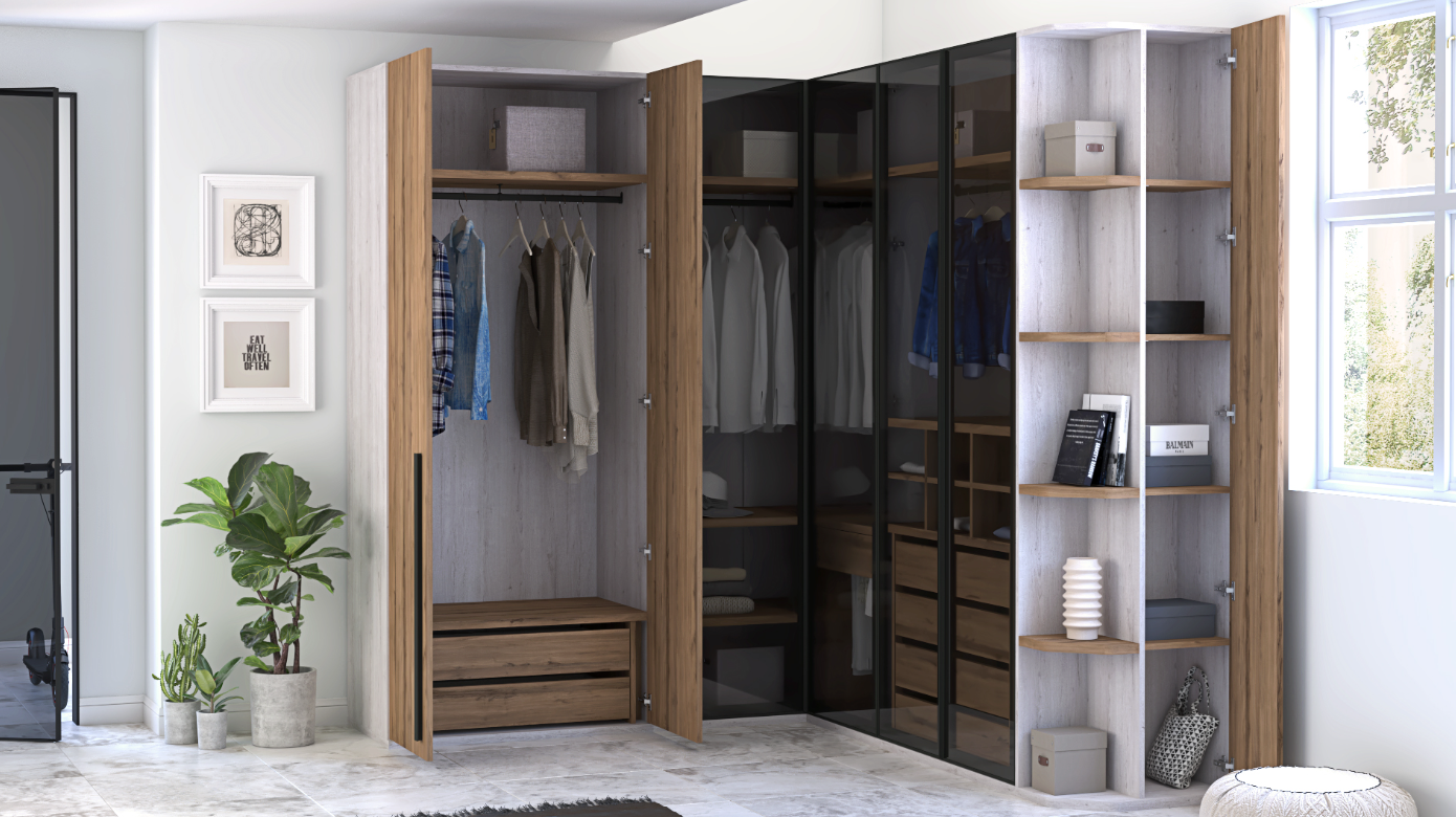 Finished in warm Roble Almo and richly textured Olmo Sabi, the Aínsa Collection delivers a refined, natural aesthetic suited to modern bedrooms and dressing areas. The L-shape configuration optimizes room layout while offering a comprehensive mix of open and closed storage. Tinted glass doors framed in black aluminium profiles add a modern visual accent while subtly showcasing selected items.