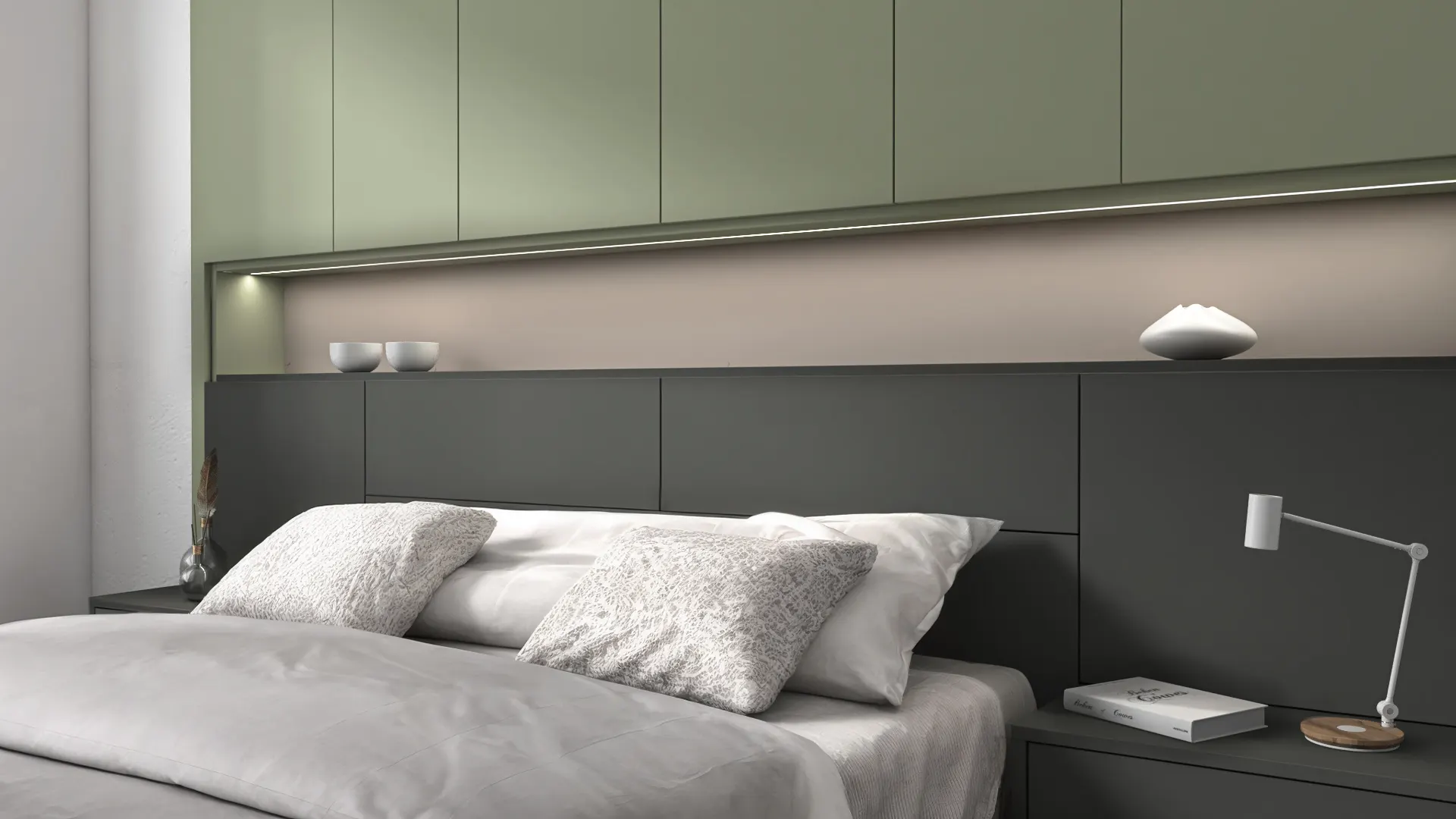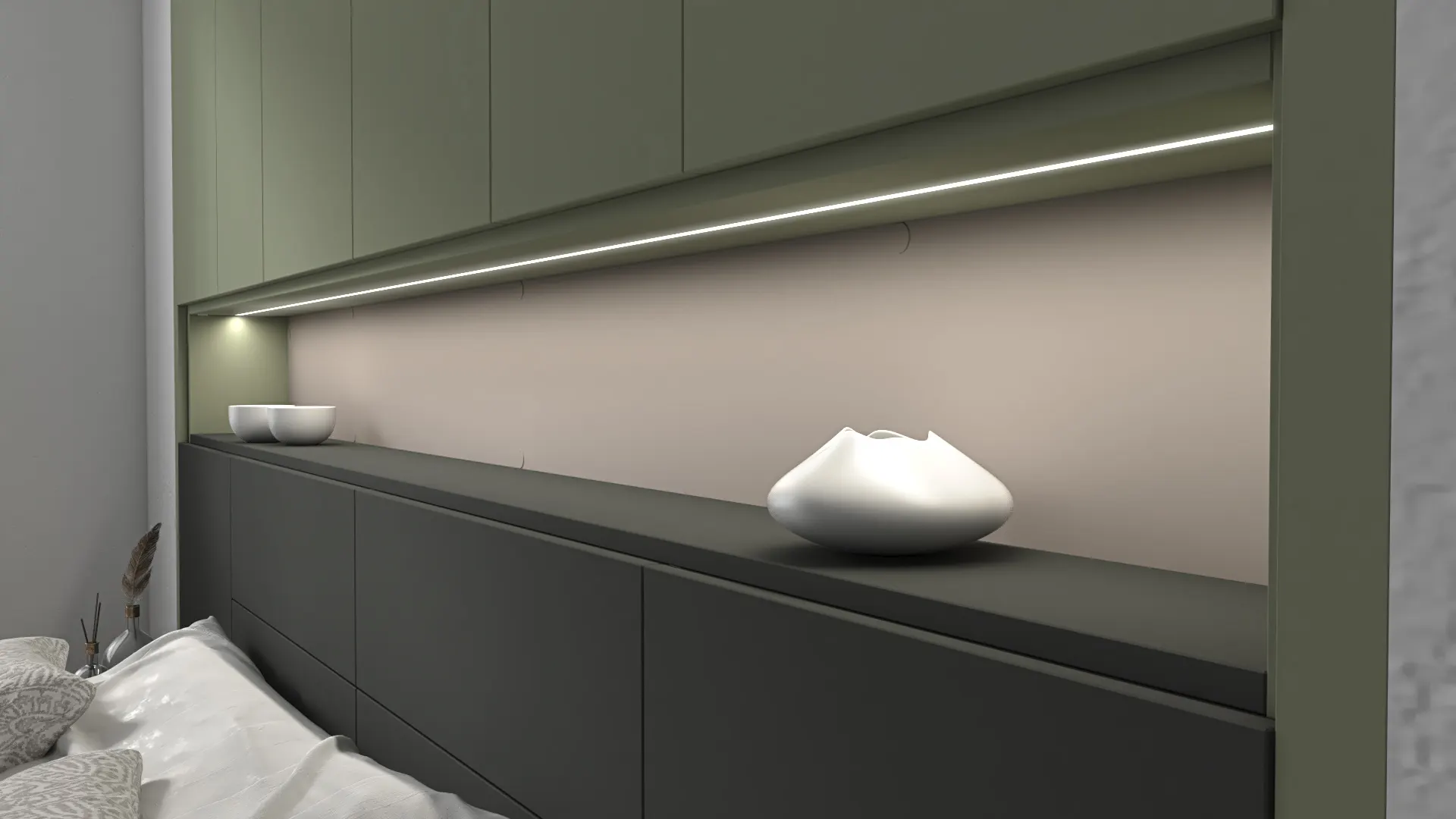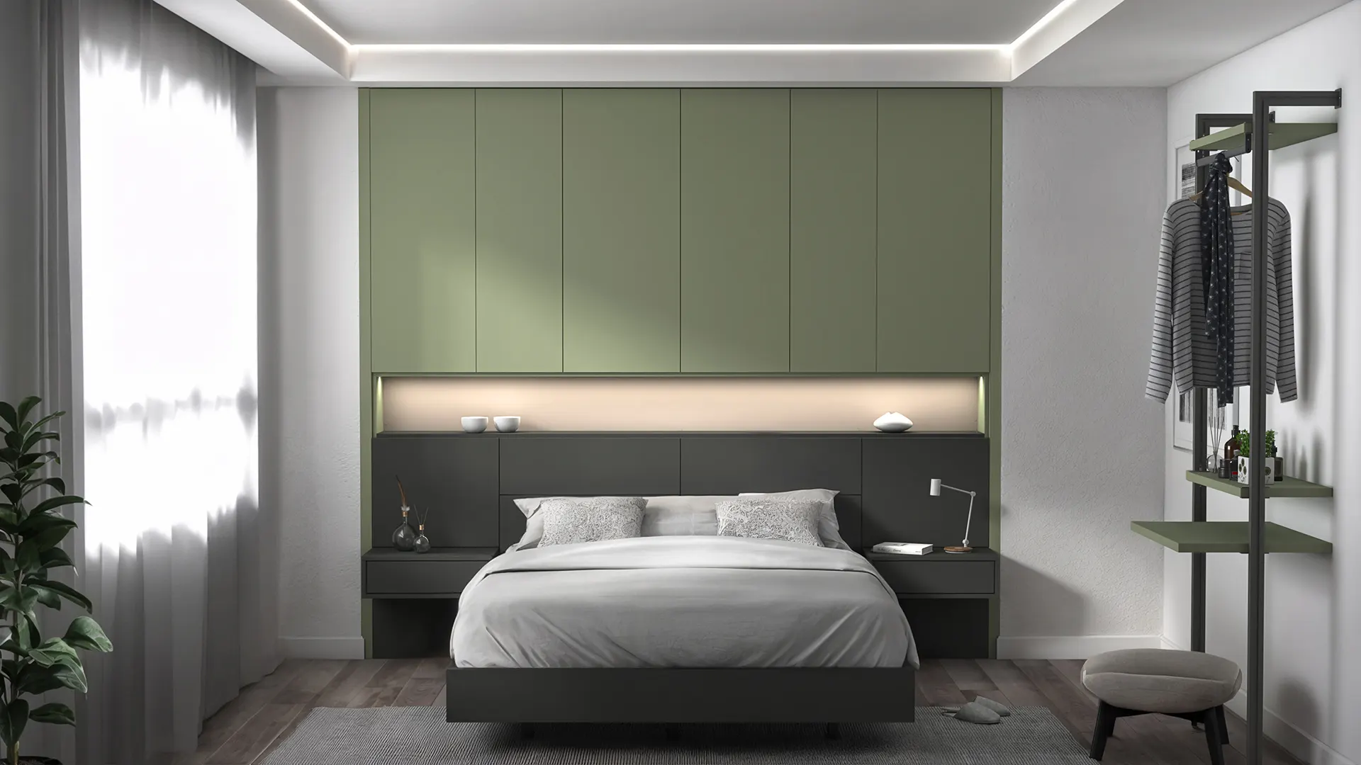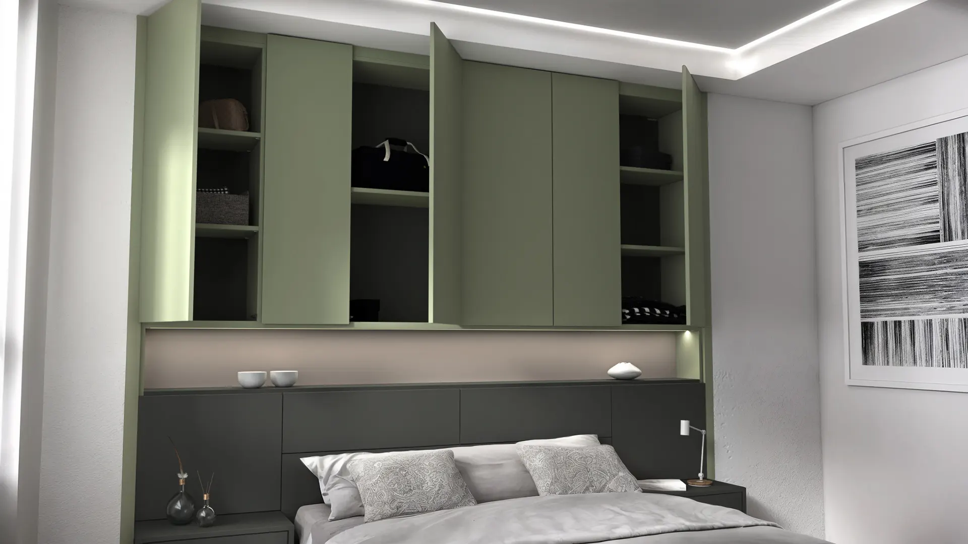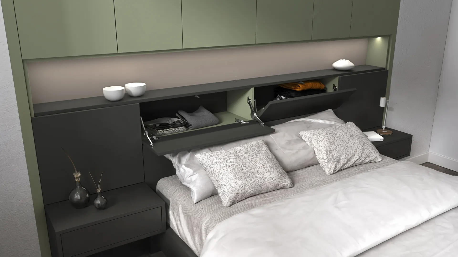 The built-in storage bed features an extended headboard with ambient LED lighting, integrated wall cabinets, and a decorative niche that adds both depth and visual interest. Floating single-drawer nightstands create a clean, uncluttered look while keeping essentials within reach. The wall-mounted storage units and Aerro hanging system with shelfprovide efficient wardrobe-style organization without occupying valuable floor space.