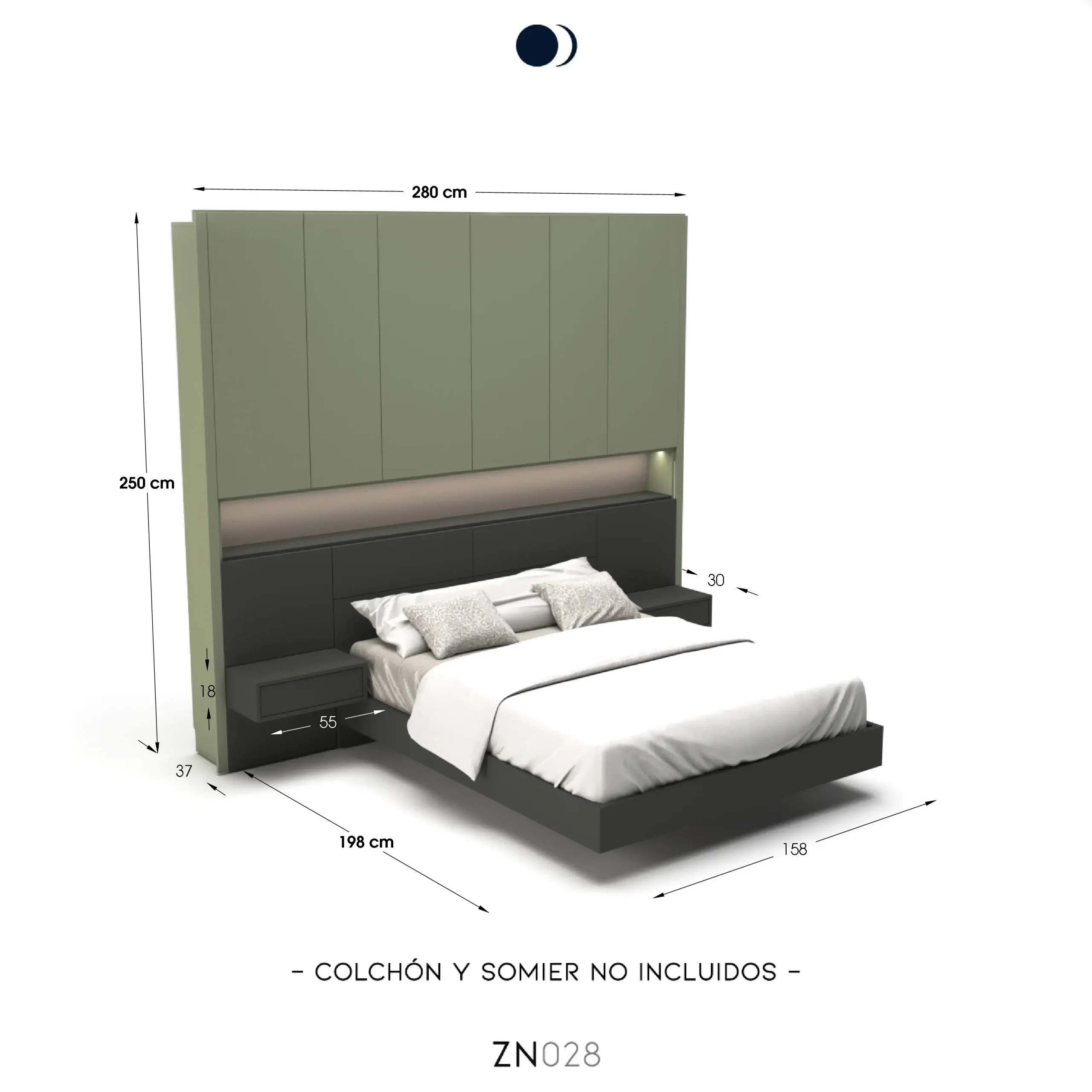 - Storage wall / Headboard: W110″ x D14.5″ x H98.5″