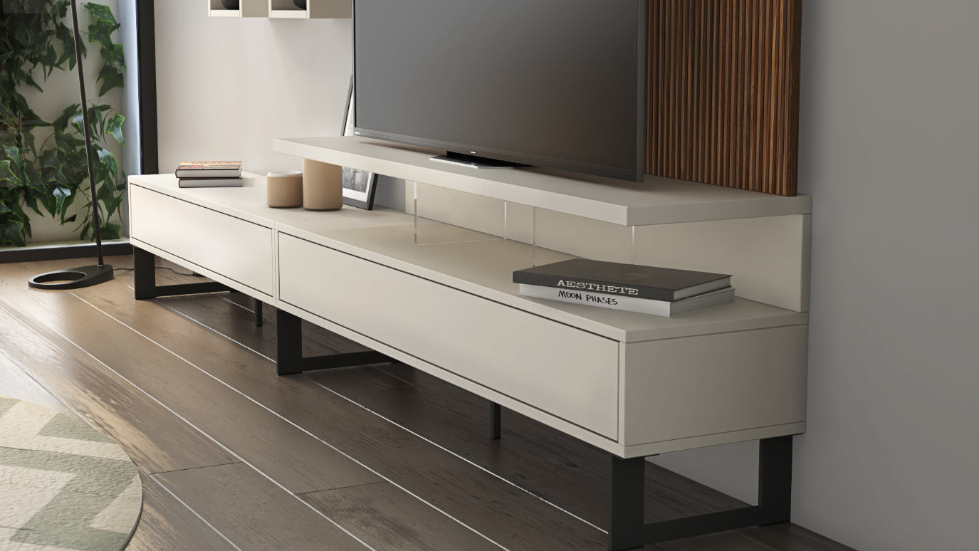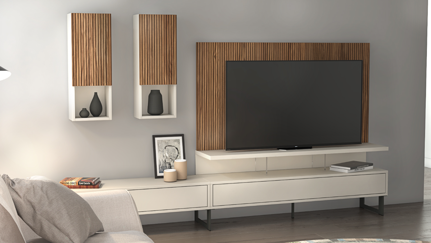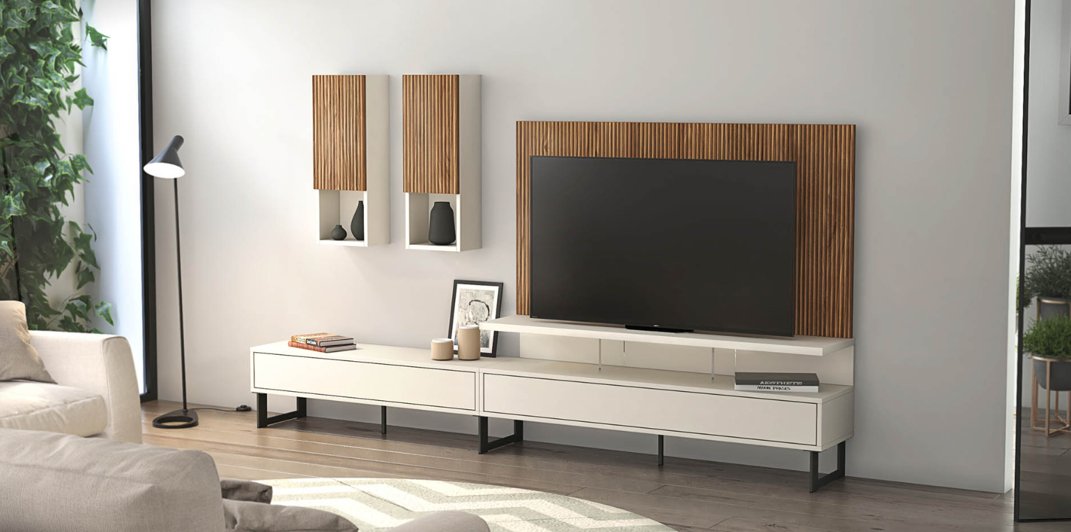 Composition: Long TV Stand: Wall Mount Vertical Storage Units (Set of 2): This set not only serves as a functional foundation for your entertainment area but also as a statement piece that seamlessly blends with various interior designs. The Collection Alba is perfect for those looking to organize and elevate their home entertainment setup stylishly.