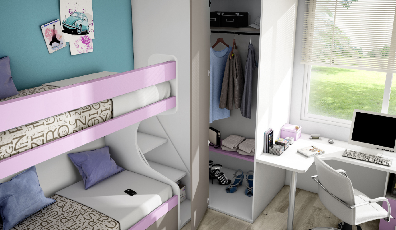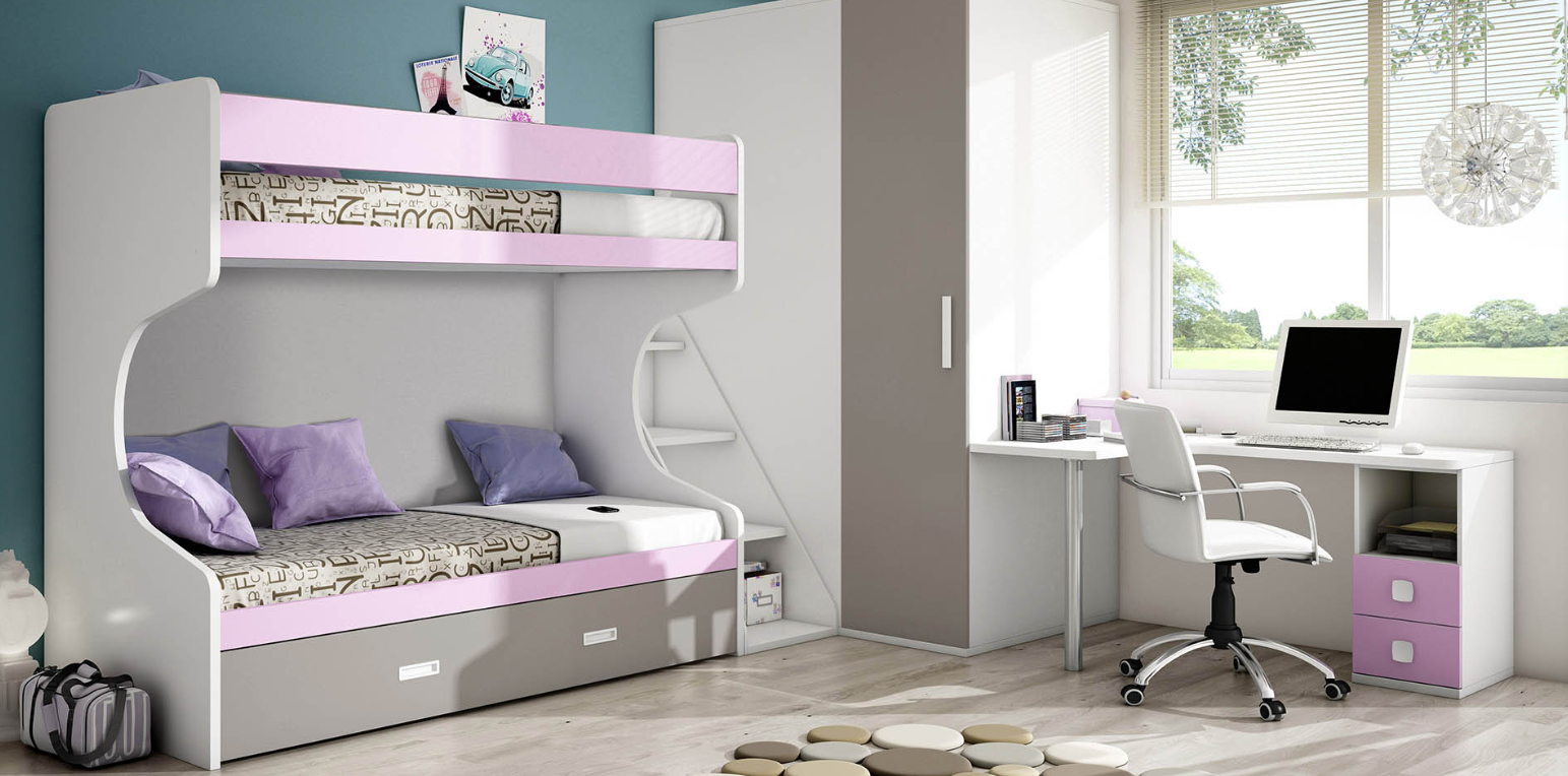 Key Features: Adventurous Spirit: Crafted in Blanco with accents in Mineral Grey and Lila, this collection is designed for young adventurers with a taste for modern design. The Albacete Aventureros collection is tailored for the space-conscious, delivering a blend of style, functionality, and efficiency. The Albacete Aventureros Youth Bedroom Collection captures the essence of adventure and exploration, offering a space-saving solution without compromising on style or functionality. Designed with the young adventurer in mind, this collection features a bunk bed with trundle, a corner wardrobe, and a comprehensive study area, all in a cohesive and modern design. The strategic use of color and smart storage solutions make the Albacete Aventureros collection an ideal choice for creating a versatile and inviting bedroom that supports the active and imaginative lifestyle of its inhabitant.