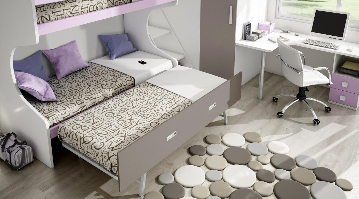 Space-Efficient Bunk Bed: A bunk bed with a trundle offers three sleeping areas in a compact design, maximizing floor space.