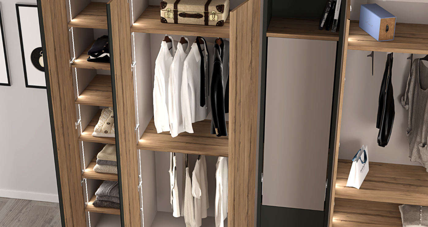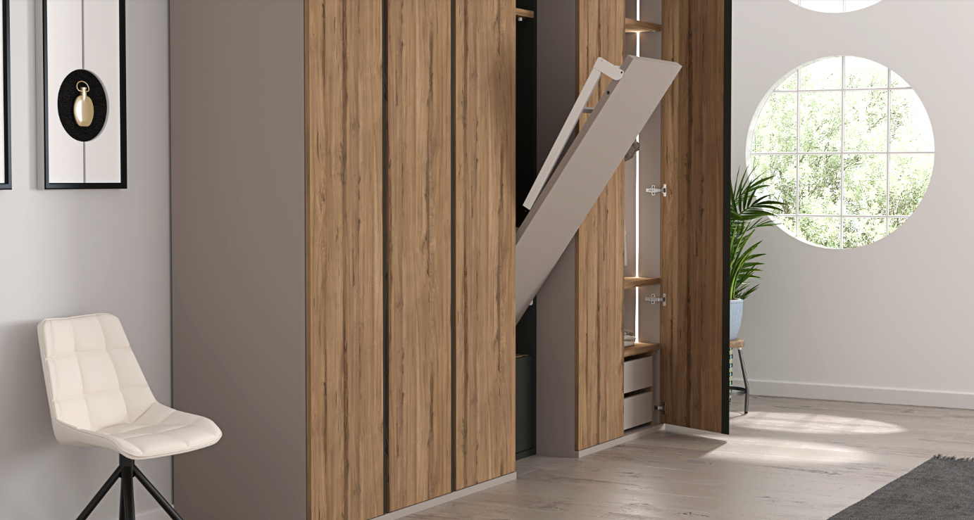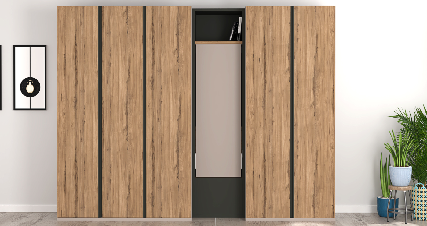 Featuring natural Olmo Sabi front doors, a contemporary Mineral Grey body, and refined Pizarra accents and back panels, Albarracín offers a balanced blend of warmth and modern sophistication. The five-door wardrobe provides generous storage with full-height shelving, hanging rods, a two-drawer unit, and additional shelving for versatile organization.