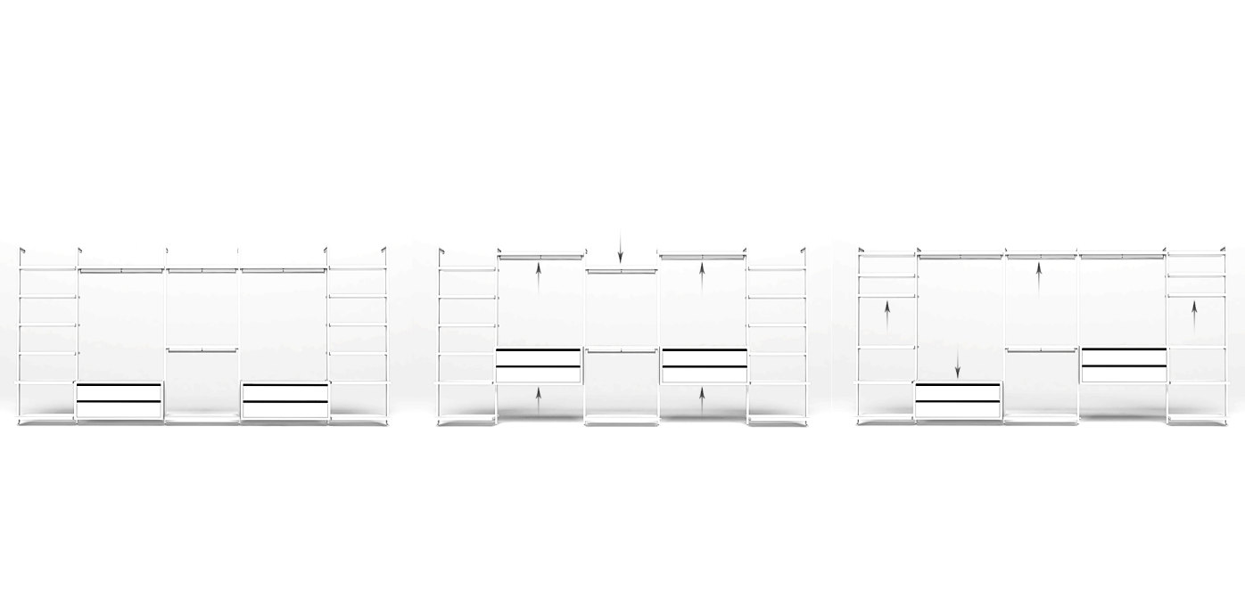 Finished in pure Blanco and supported by sleek white aluminium profiles, the wardrobe creates a light, floating appearance that enhances brightness and visual openness. Adjustable shelves, hanging rods, and integrated drawer units can be repositioned in height, allowing the layout to adapt for comfort, ergonomics, and accessibility over time.