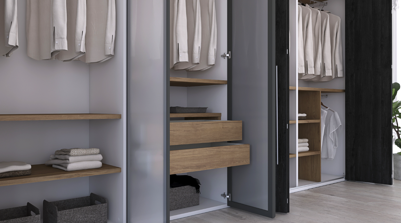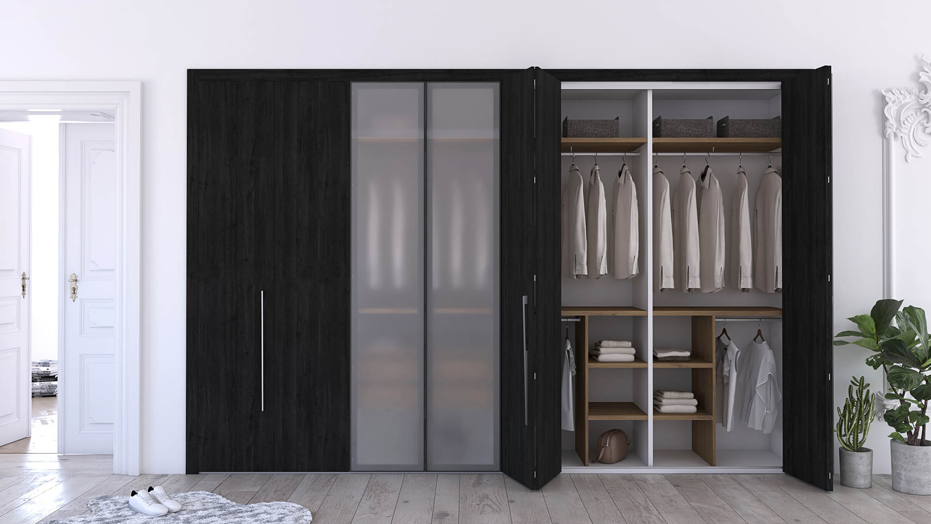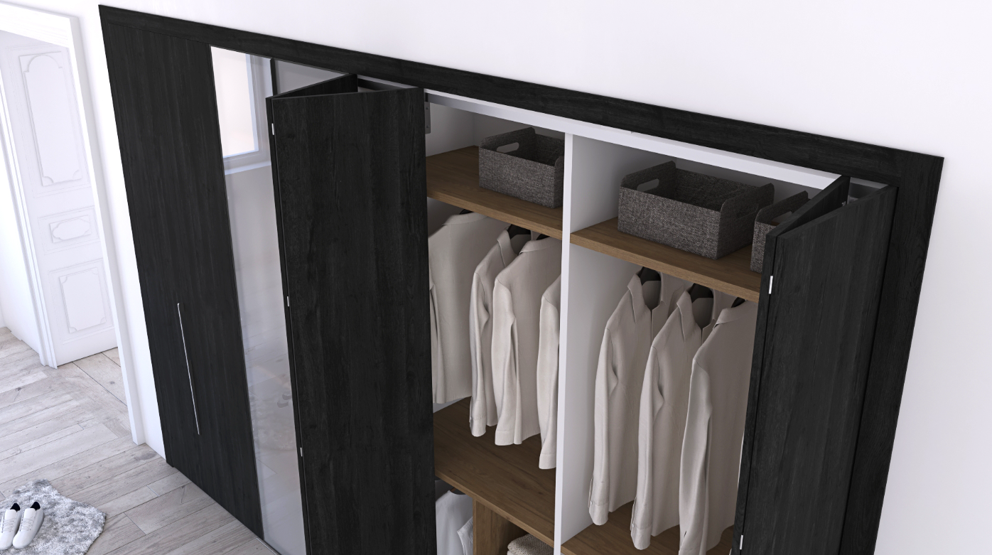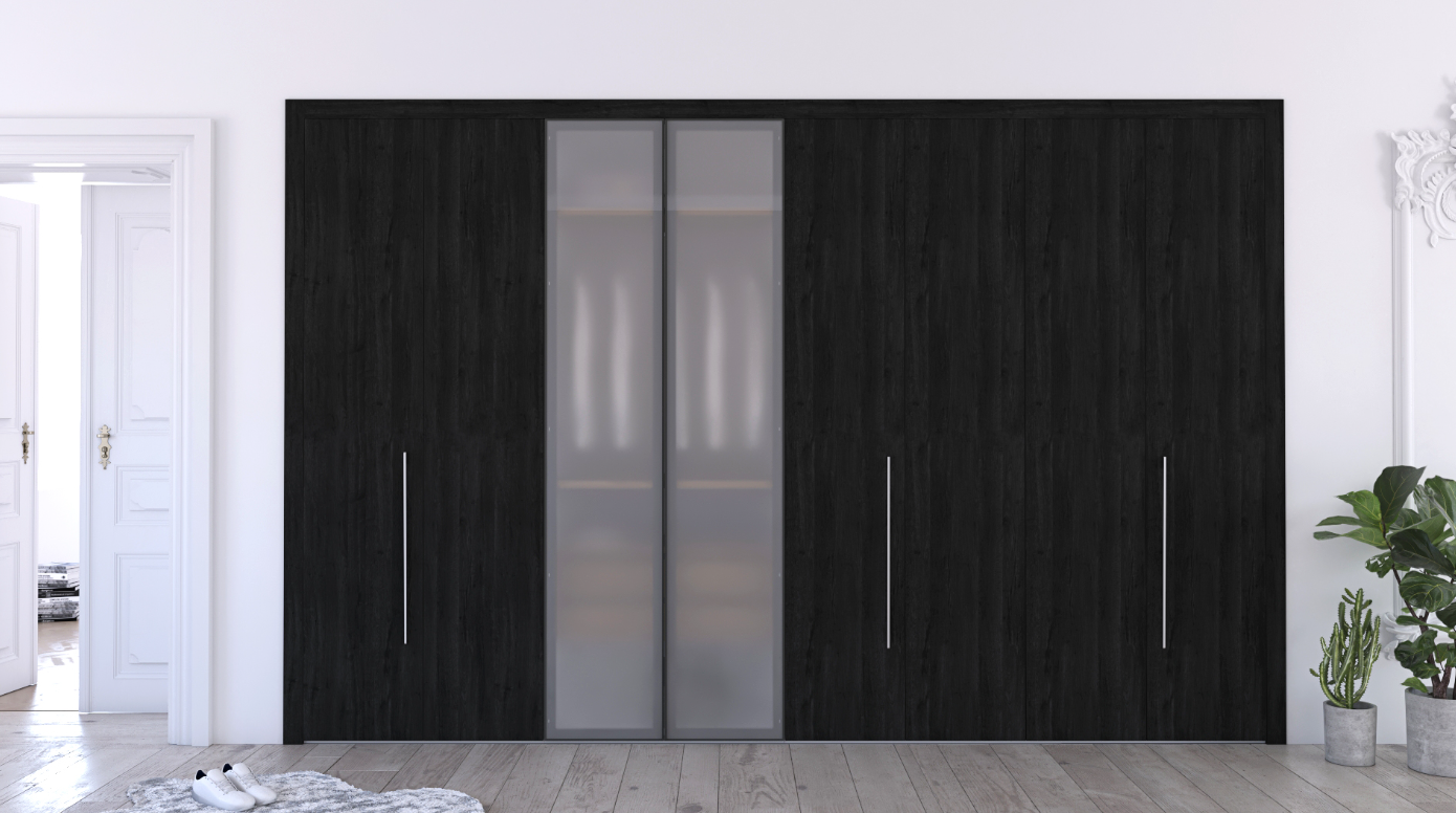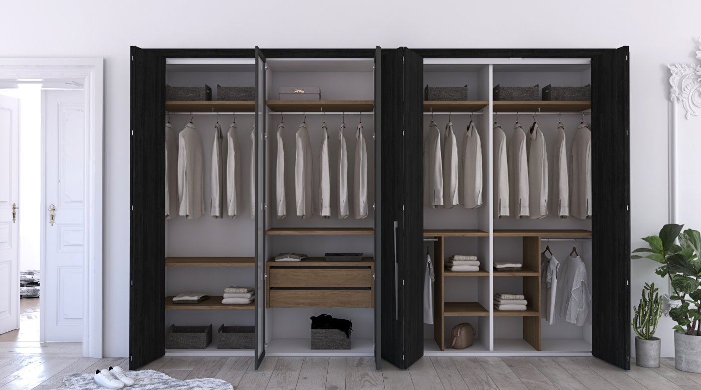 Finished with striking Roble Azabache doors contrasted against a crisp Blanco body, and enhanced by warm Roble Denver shelves and drawers, the Alegria wardrobe creates a sophisticated balance of depth, brightness, and natural texture. The composition features three sets of bifold doors for space-efficient access, along with two central non-transparent glass doors framed in black aluminium, adding a modern architectural accent.