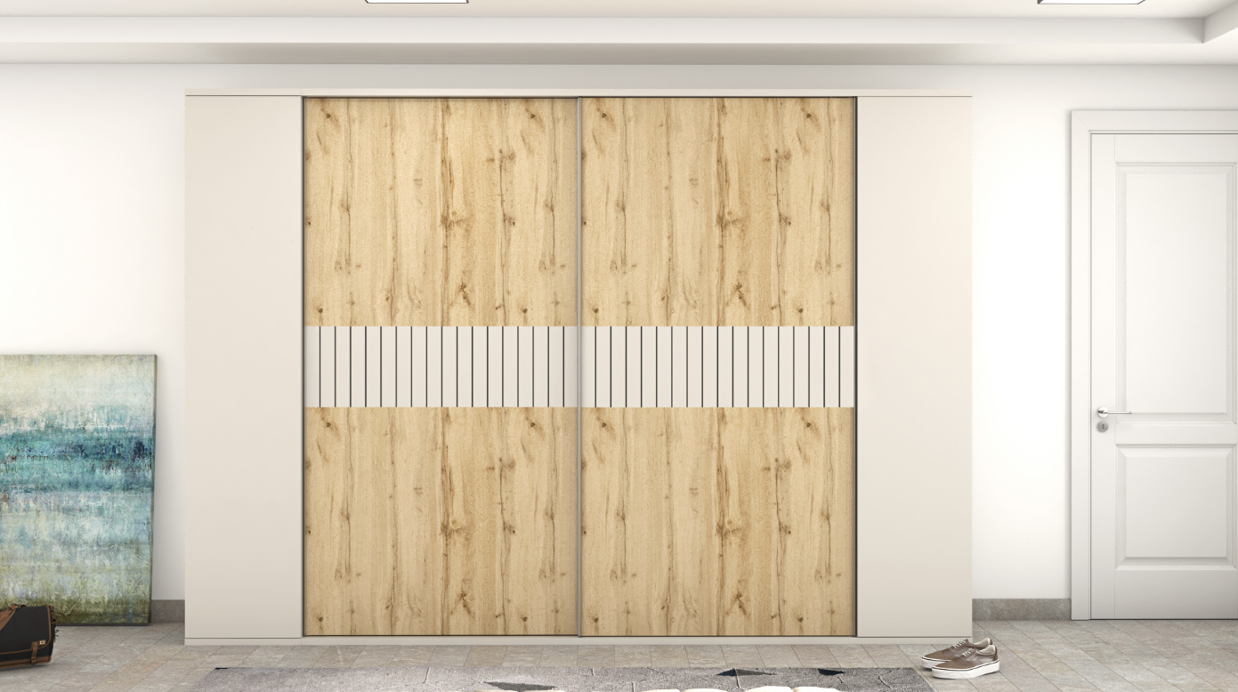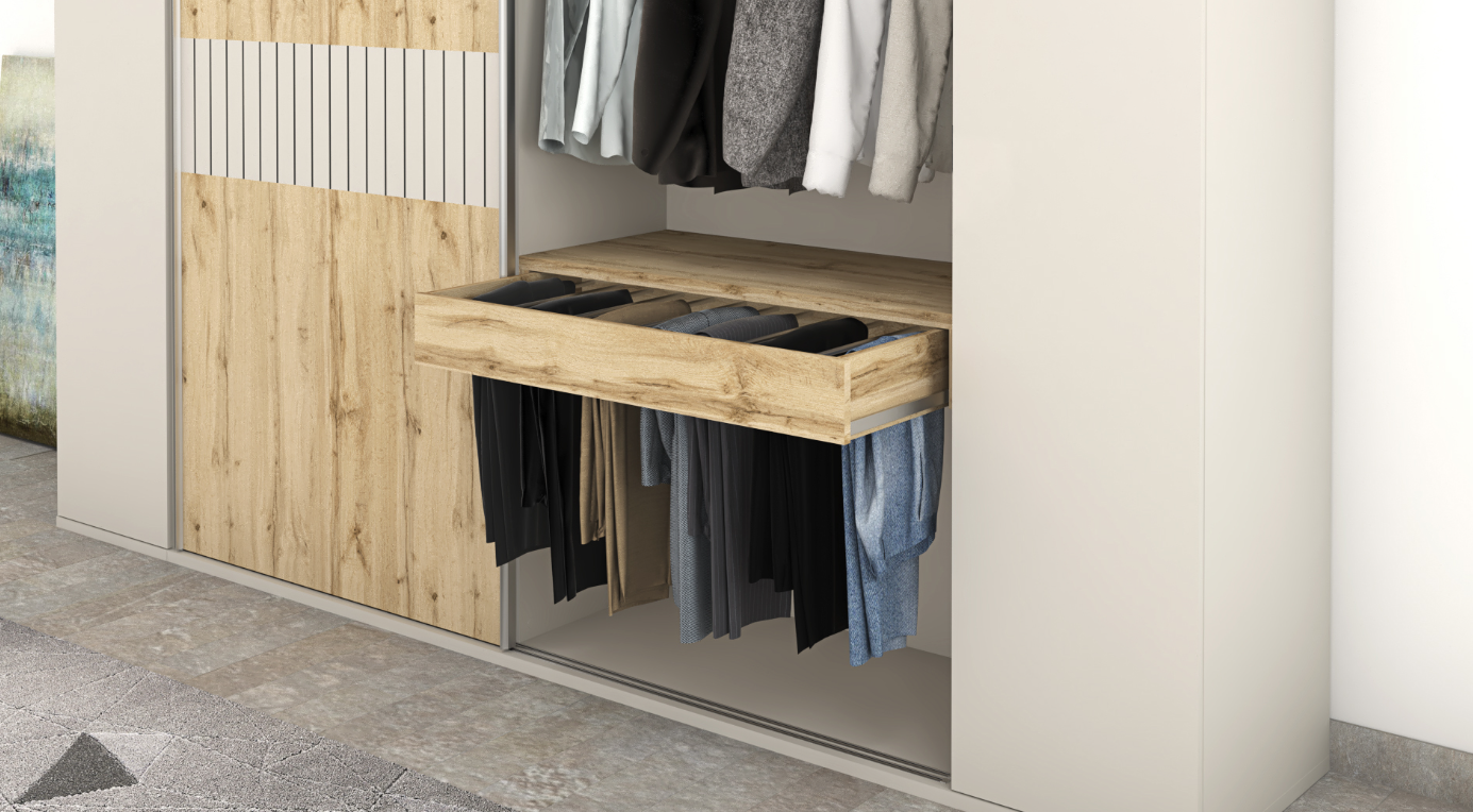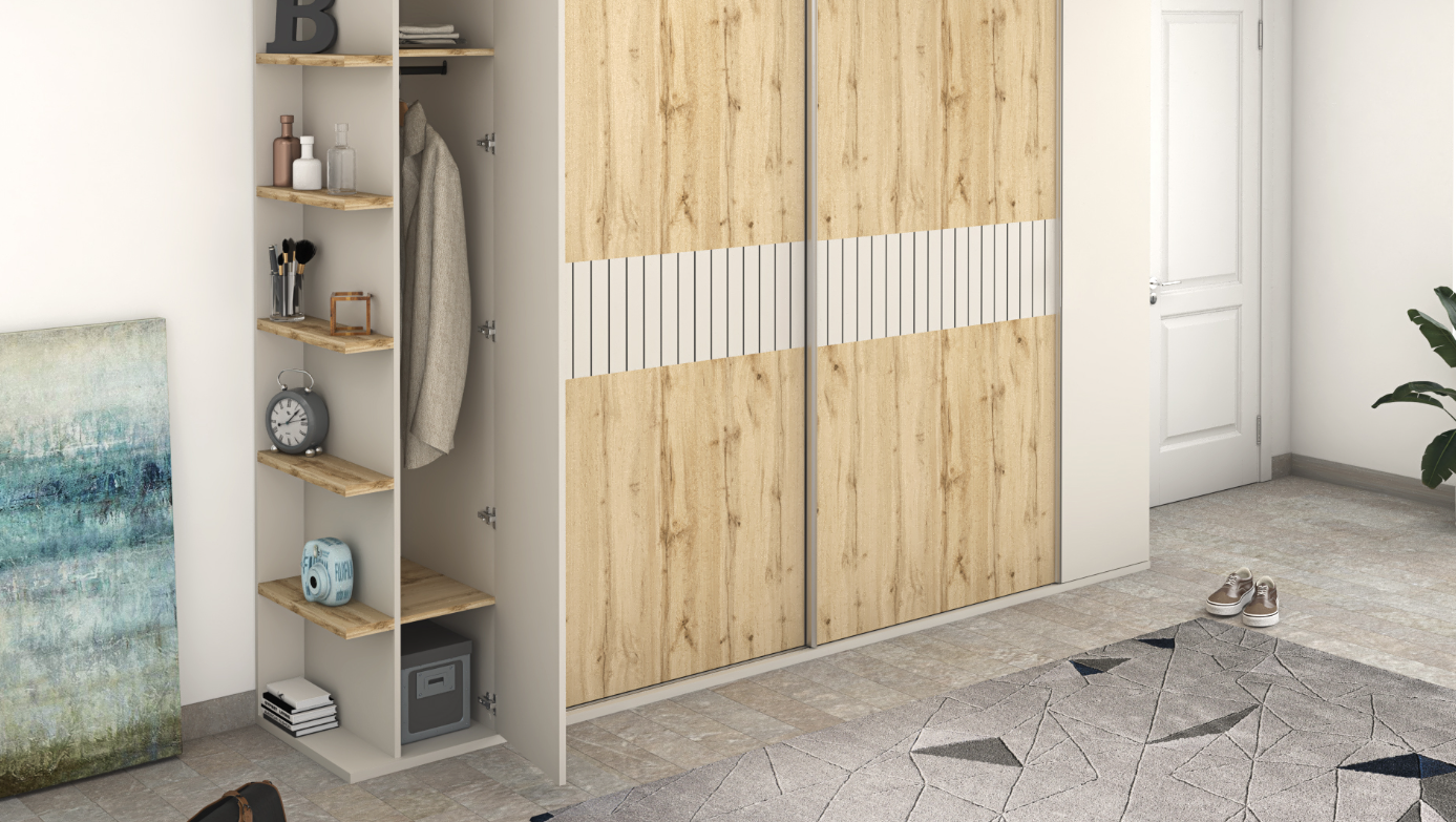 Finished in warm Roble Hercules and accented with elegant Gris Coco and Gris Coco Ranurado panels, the Almagro wardrobe creates a balanced contrast between natural texture and modern neutrality. The configuration includes two large sliding doors for space-efficient access, complemented by two hinged doors on each side for additional storage flexibility.