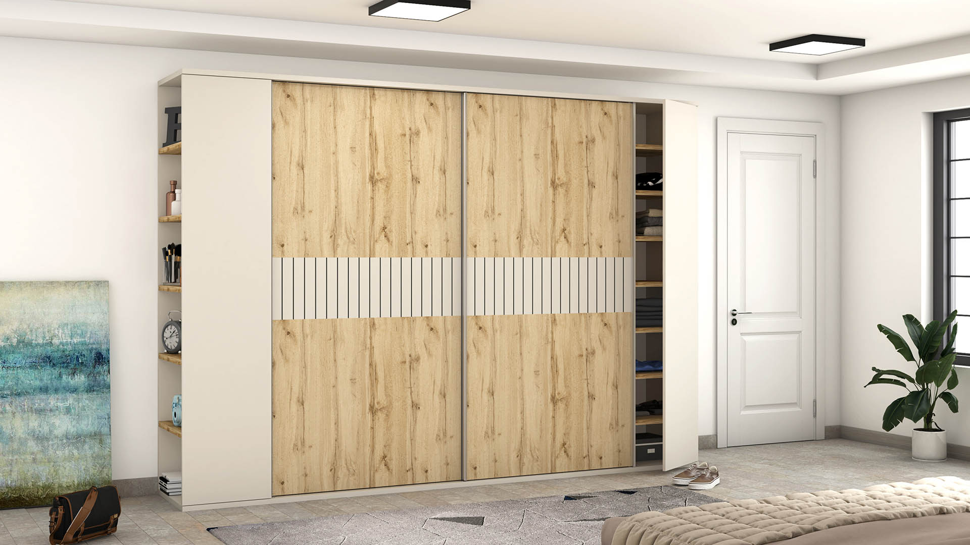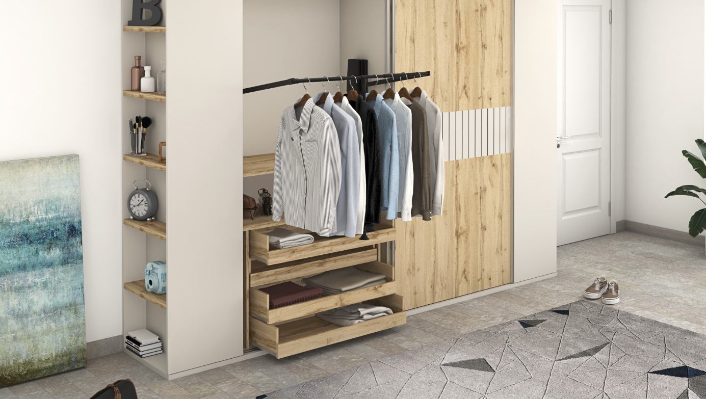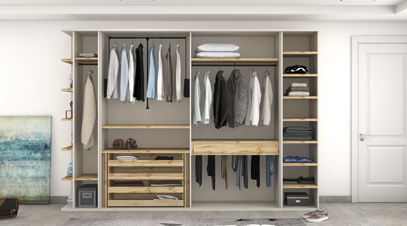 Finished in warm Roble Hercules and accented with elegant Gris Coco and Gris Coco Ranurado panels, the Almagro wardrobe creates a balanced contrast between natural texture and modern neutrality. The configuration includes two large sliding doors for space-efficient access, complemented by two hinged doors on each side for additional storage flexibility.