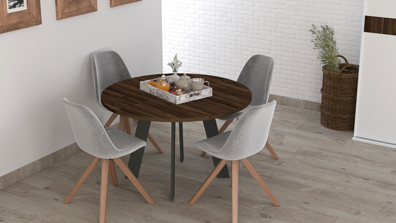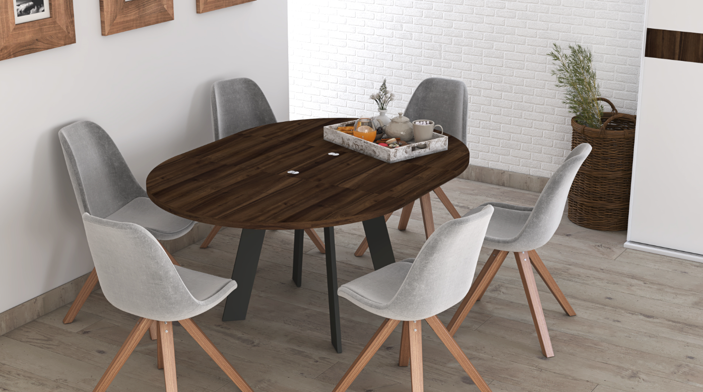 Complementing the wardrobe is a round extendable dining table featuring a Nogal Valentina tabletop and Blanco base. Its extendable design provides flexibility for everyday use or entertaining guests, making it a versatile addition to contemporary interiors.