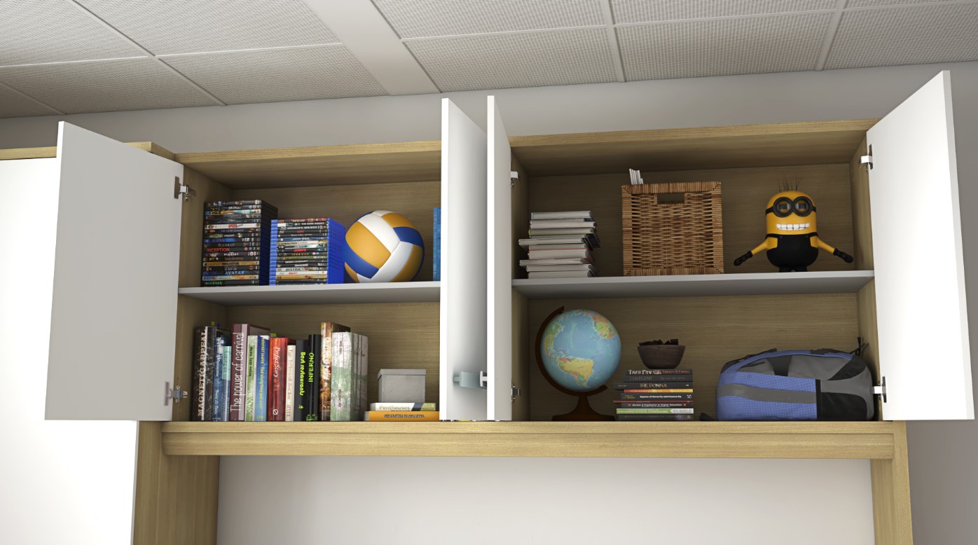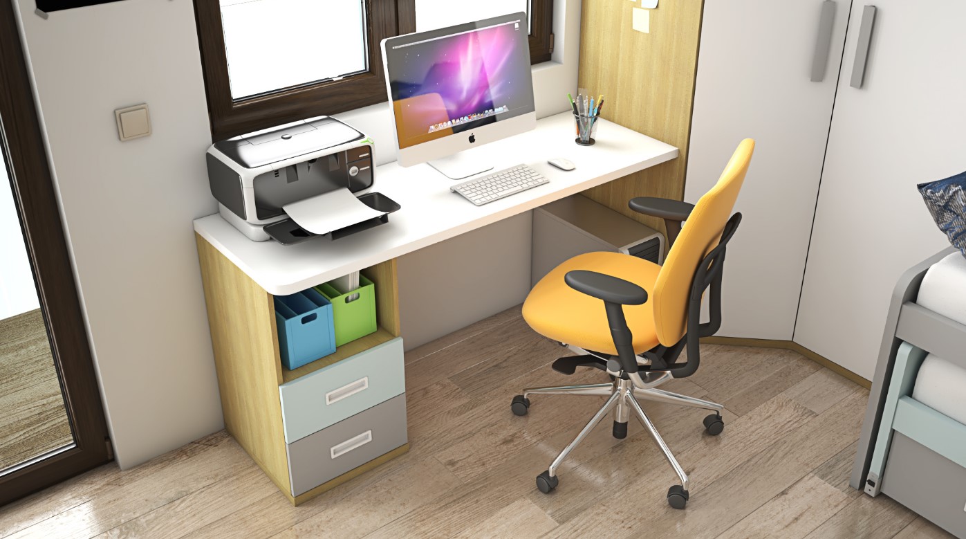 Functional Study Area: Includes a Blanco desk top complemented by a storage cabinet in Azul Nube and Gris Claro, designed to inspire creativity and productivity.