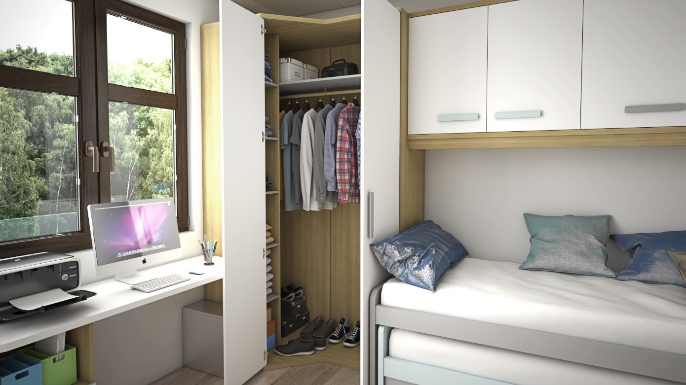 Ample Storage Solutions: A two-door corner wardrobe and a bed hutch unit with 4 doors provide generous space to organize clothing, bedding, and personal items efficiently.