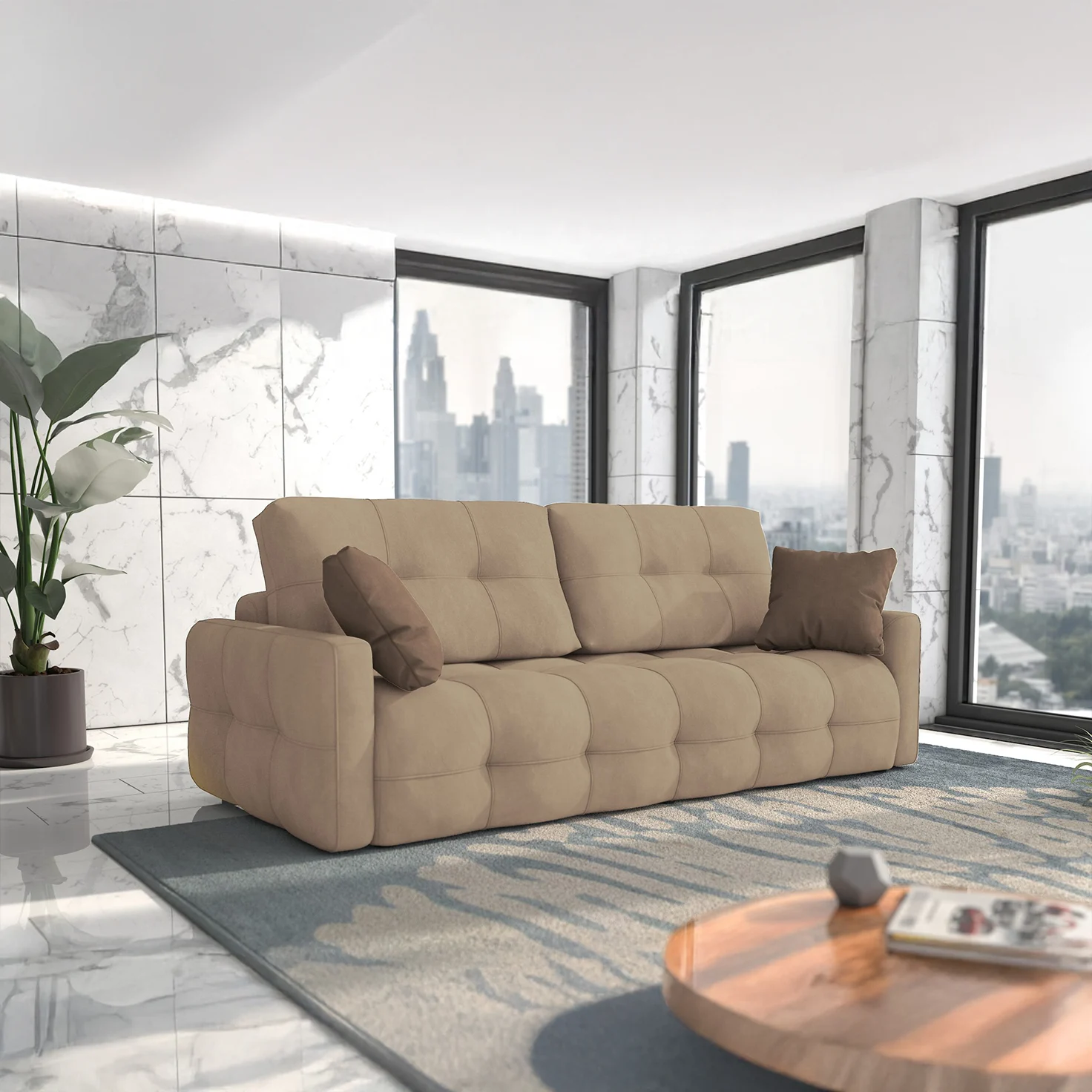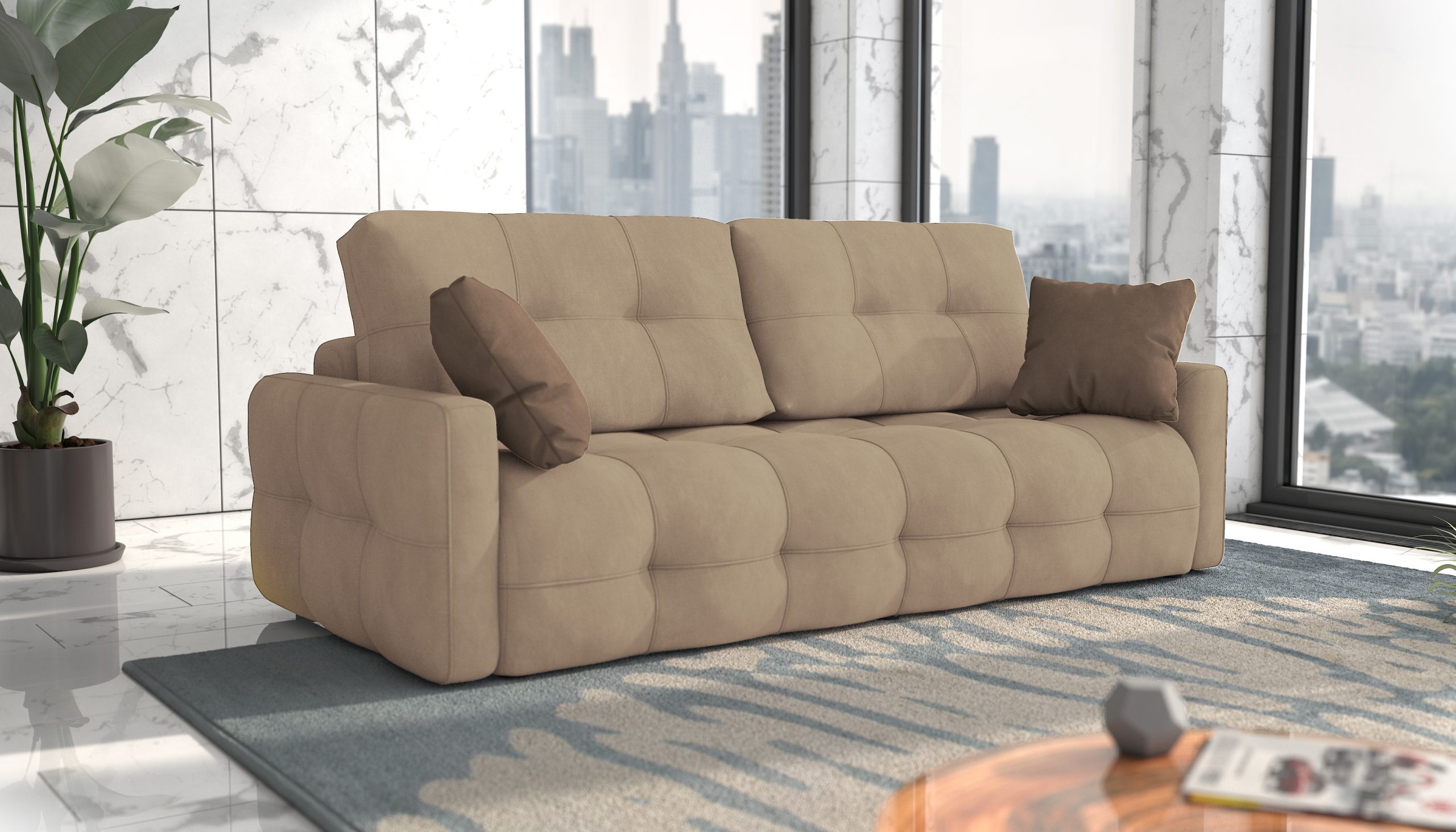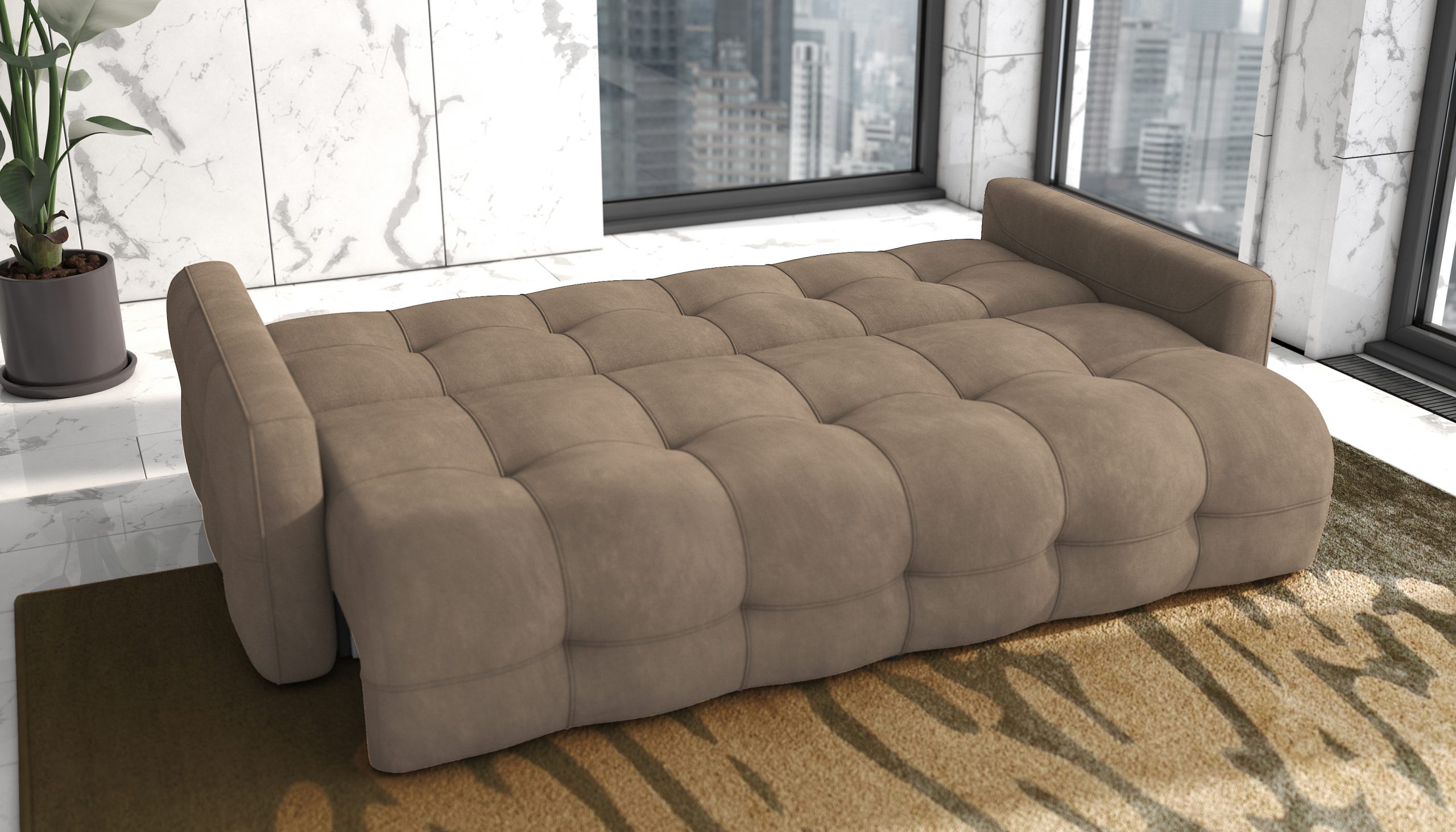 The Astrid modern and contemporary sofa bed is a stylish and functional piece of furniture that is perfect for any home. The tufted design adds a touch of elegance and sophistication, while the slim armrests create a sleek and modern look.