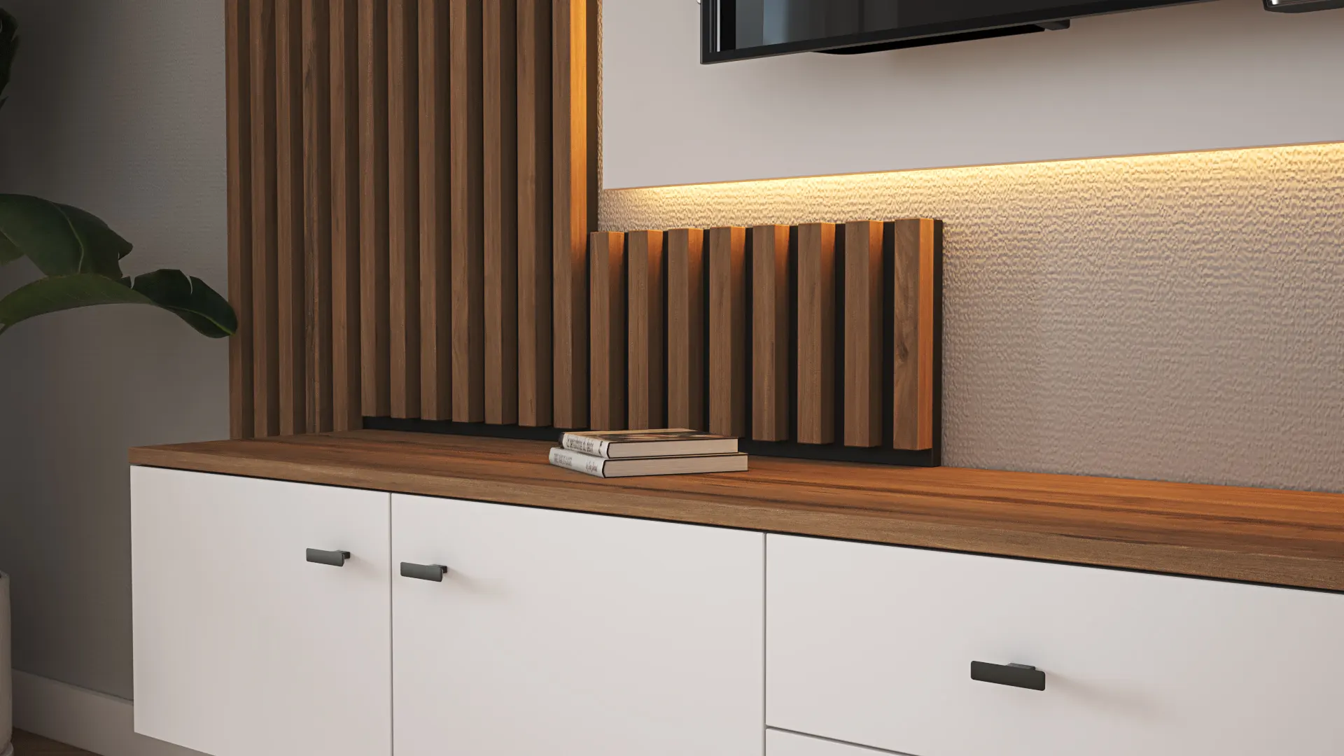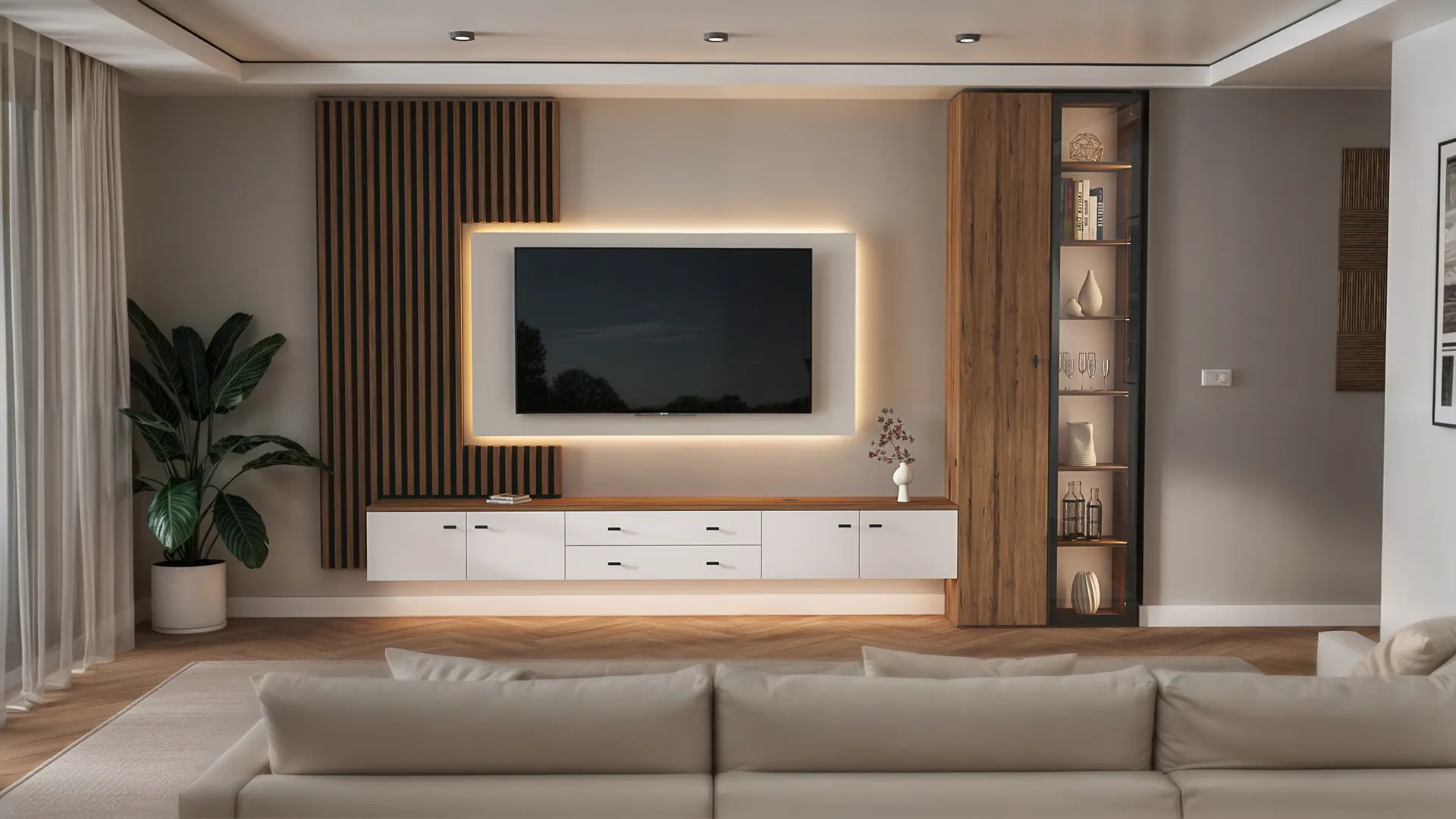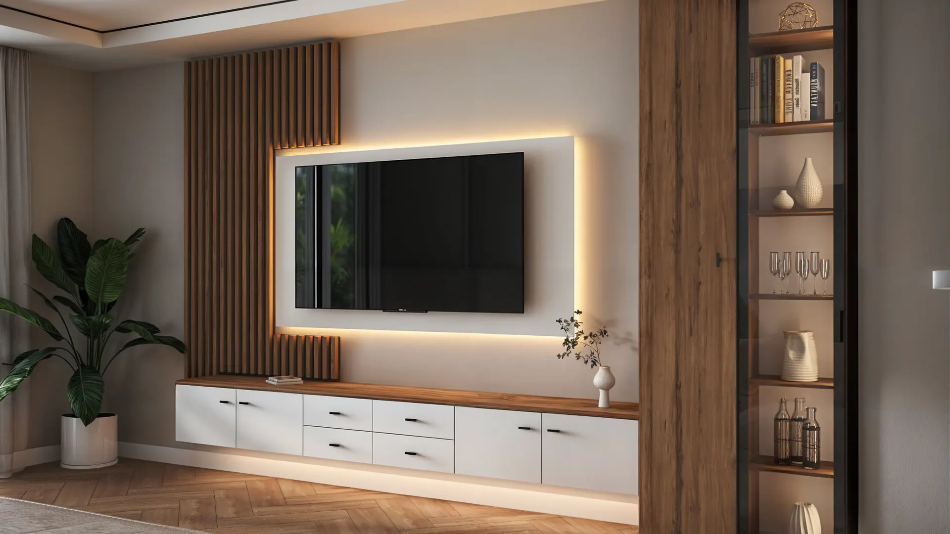 A sleek TV panel includes built-in LED lighting and is paired with an offset accent plank panel on the left side, combining architectural presence with a soft ambient glow.