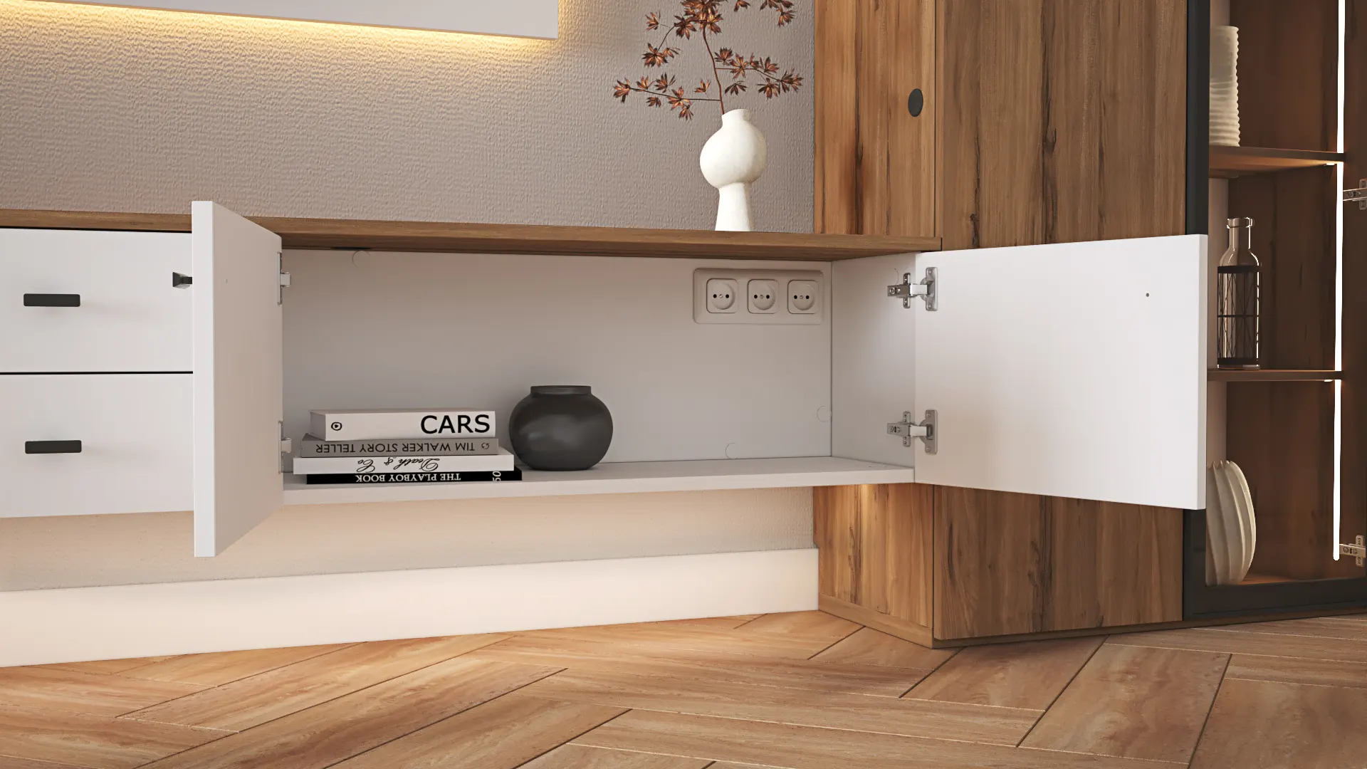 The Aurora Collection radiates modern elegance with a touch of natural serenity. Anchored in the warm grain of Olmo Sabi and elevated by crisp White and Negro accents, this wall-mounted ensemble redefines contemporary sophistication. With its integrated lighting, sleek lines, and floating elements, Aurora blends function and atmosphere—offering a beautifully balanced centerpiece for today’s refined living spaces.