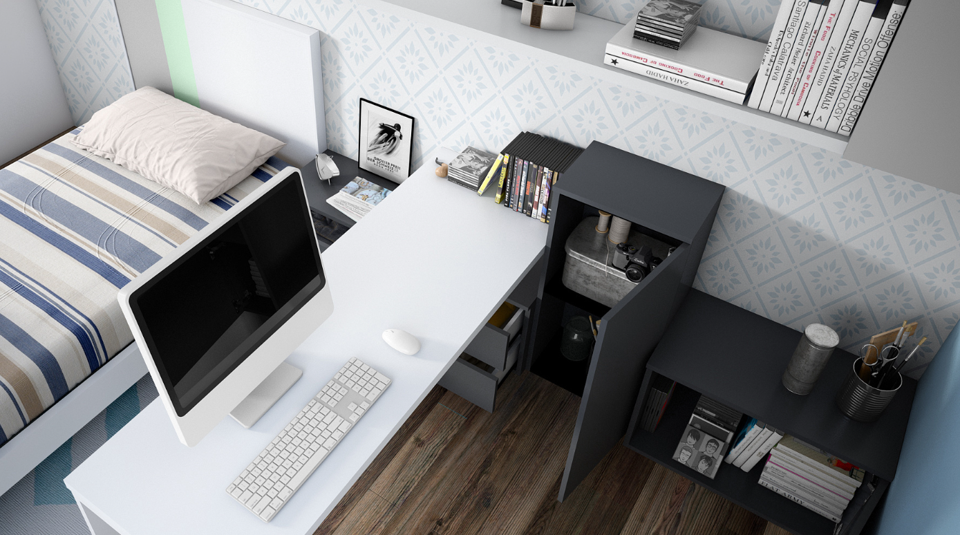 From the innovative bed design to the non-traditional study area and the concept of aerial storage modules, every piece is crafted to enhance the feeling of openness and comfort.