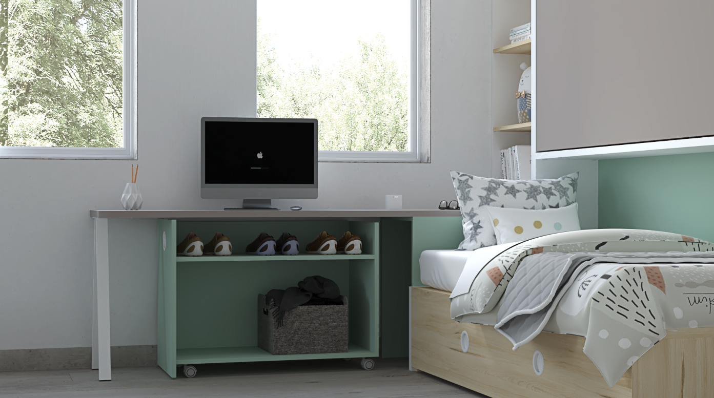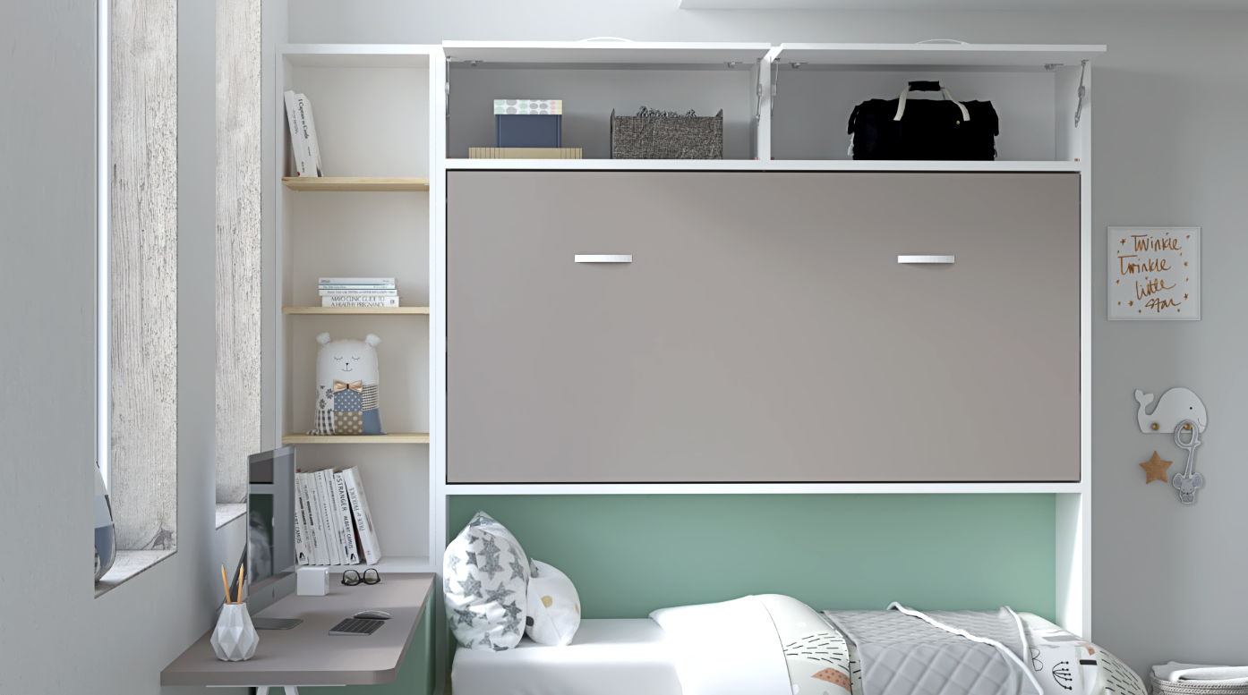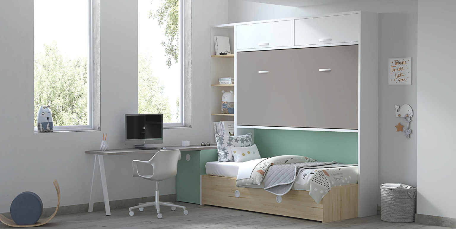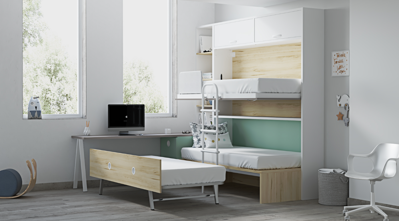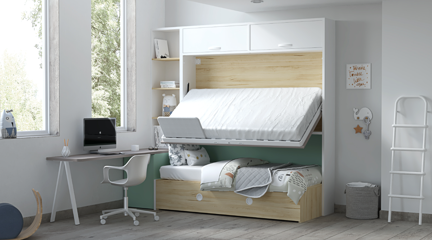 Description: Embrace the vibrant spirit of Barcelona’s famous boardwalks with the Barca Boardwalk Collection. This ingeniously designed collection brings the essence of Barcelona’s lively beaches and stylish modernism into your home, featuring a body in Blanco and tastefully chosen accents in Haya Gala, Mineral Grey, and Verde Talco. It’s a perfect blend of functionality, style, and the joyous lifestyle of one of Spain’s most beloved cities. Key Features: Innovative Bunk Bed Solution: A unique combination of a trundle bed with a horizontal Murphy bed above transforms into a space-saving bunk bed setup, ideal for siblings or sleepovers. The Barca Boardwalk Collection is a tribute to the dynamic and artistic nature of Barcelona, designed for those who appreciate smart living without compromising on design. This collection not only maximizes sleeping and storage areas within limited spaces but also introduces a fresh, coastal vibe to the bedroom. The clever use of color and form echoes the architectural marvels and the sunny beaches of Barcelona, making every day feel like a stroll along the vibrant boardwalk. Whether for a child’s room or a guest space, the Barca Boardwalk Collection transforms any bedroom into a multifunctional, stylish haven that’s ready for relaxation or adventure at a moment’s notice.