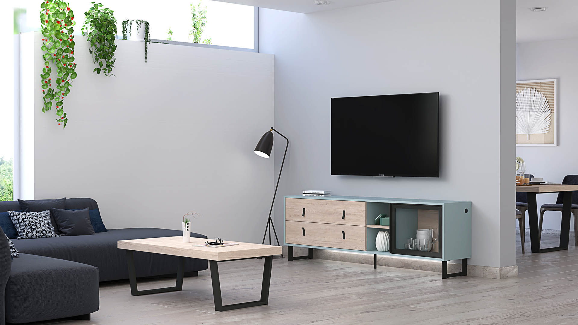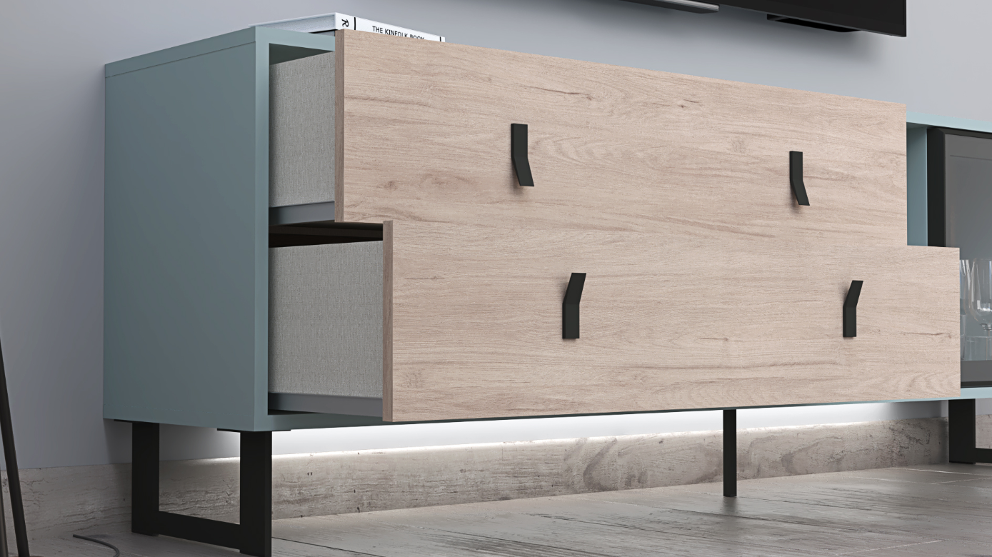 The Beatriz Collection is a celebration of vibrant elegance, featuring the serene beauty of Azul Nube complemented by the natural warmth of Roble Aurora fronts. This collection, designed for those who cherish bold yet refined interiors, introduces a TV stand and coffee table set that balances contemporary design with functional grace, all supported by sleek black metal legs.