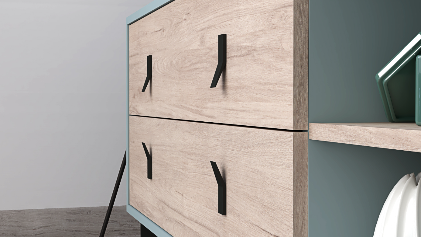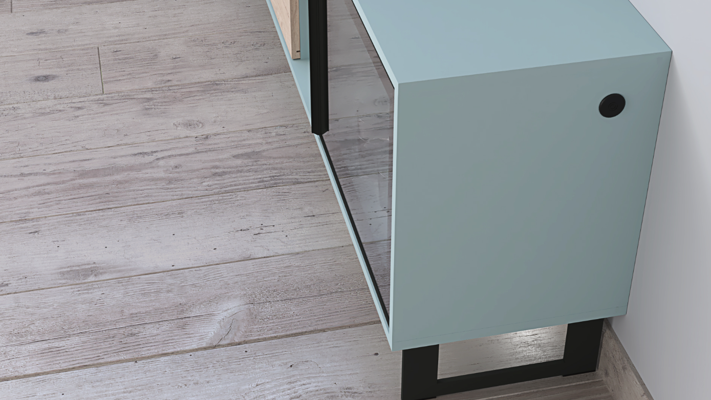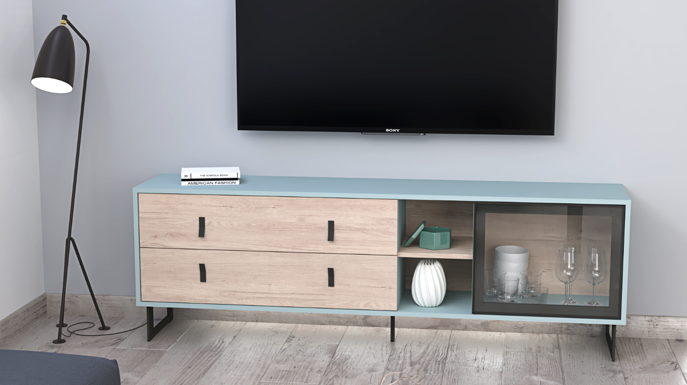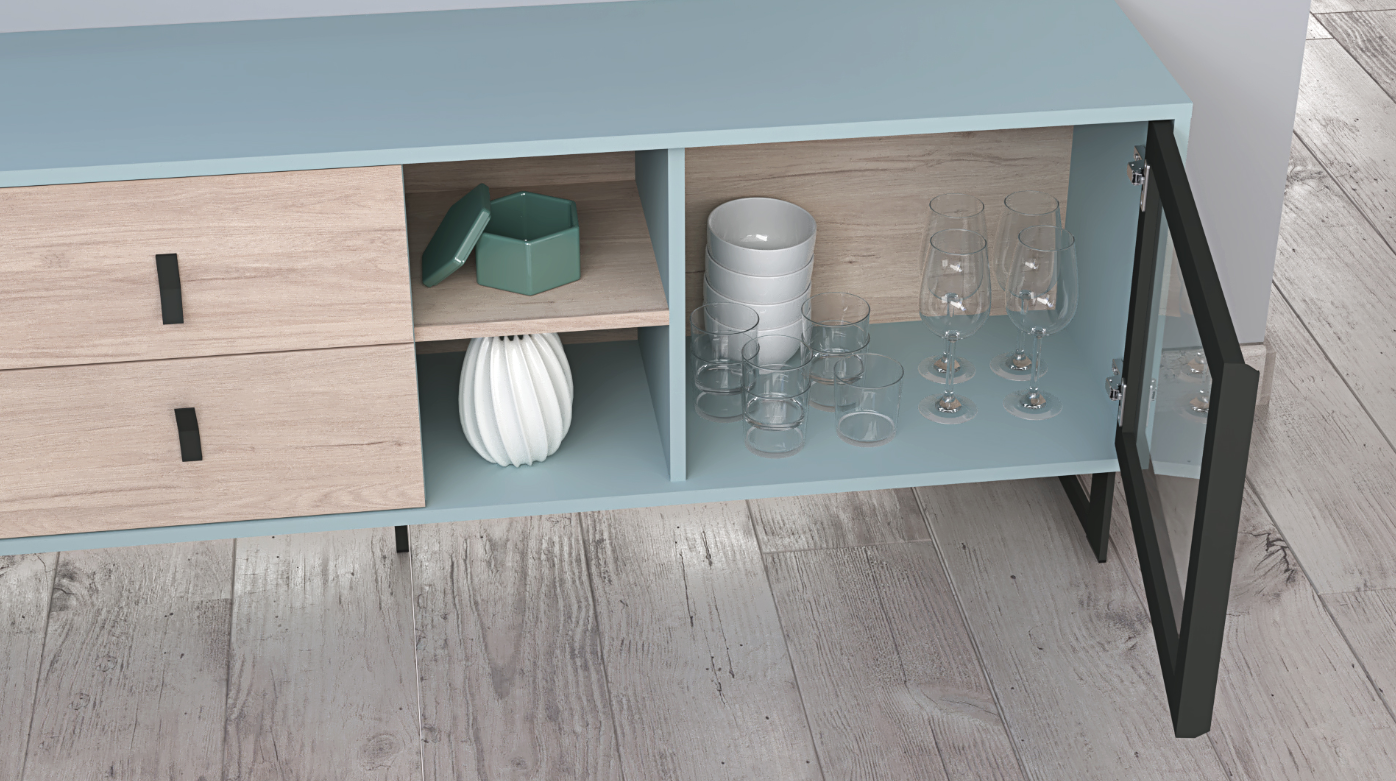 Stylish TV Stand: The centerpiece of the Beatriz Collection, this TV stand is equipped with a glass door that subtly showcases its contents, alongside open shelves for decorative items or electronic components. Two drawers provide ample storage for media accessories, ensuring a clutter-free environment. The Roble Aurora fronts contrast beautifully against the Azul Nube body, creating a visual allure that’s both captivating and soothing.
