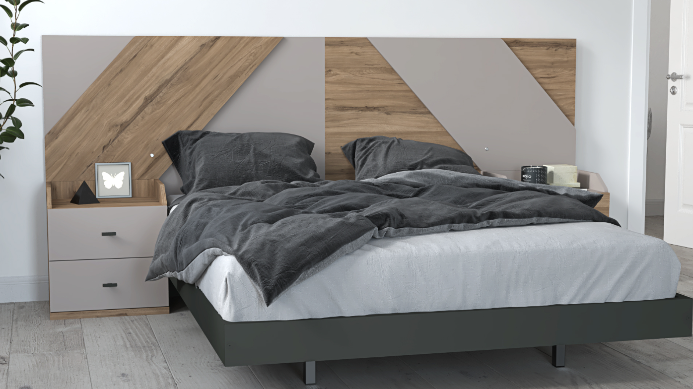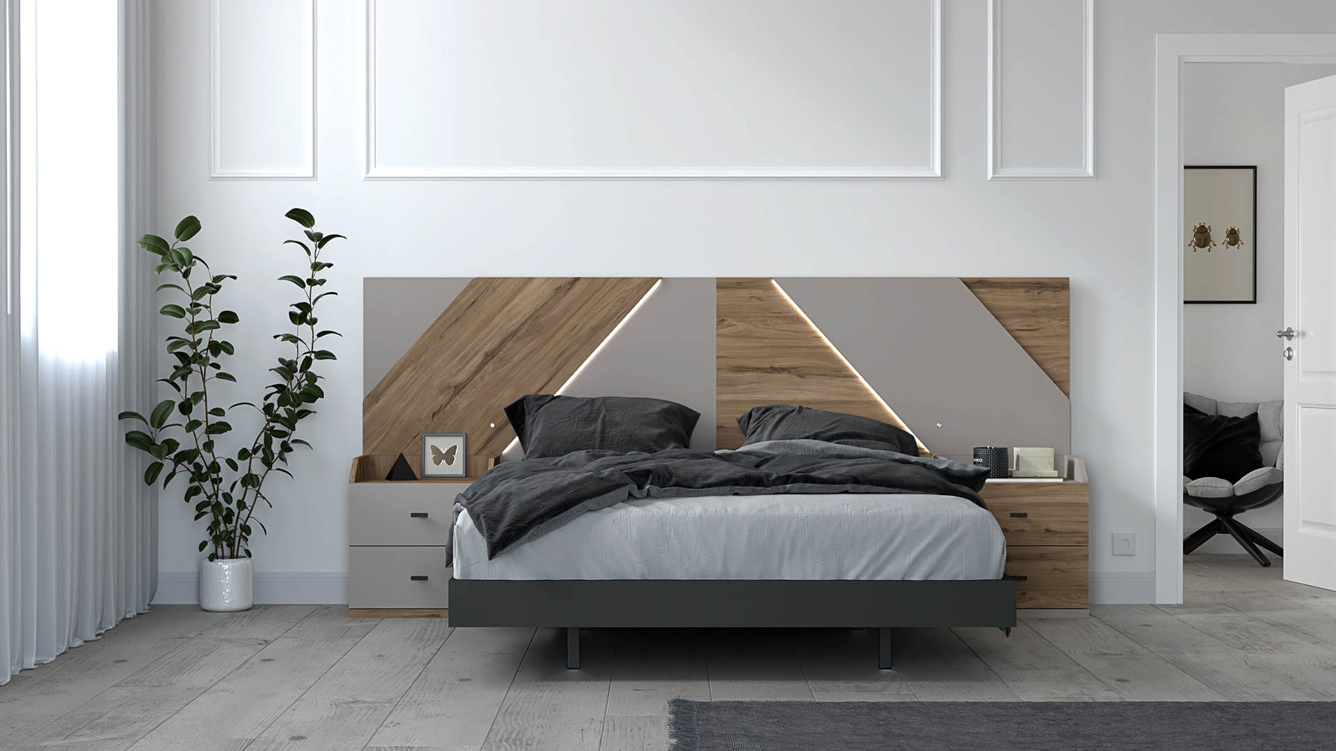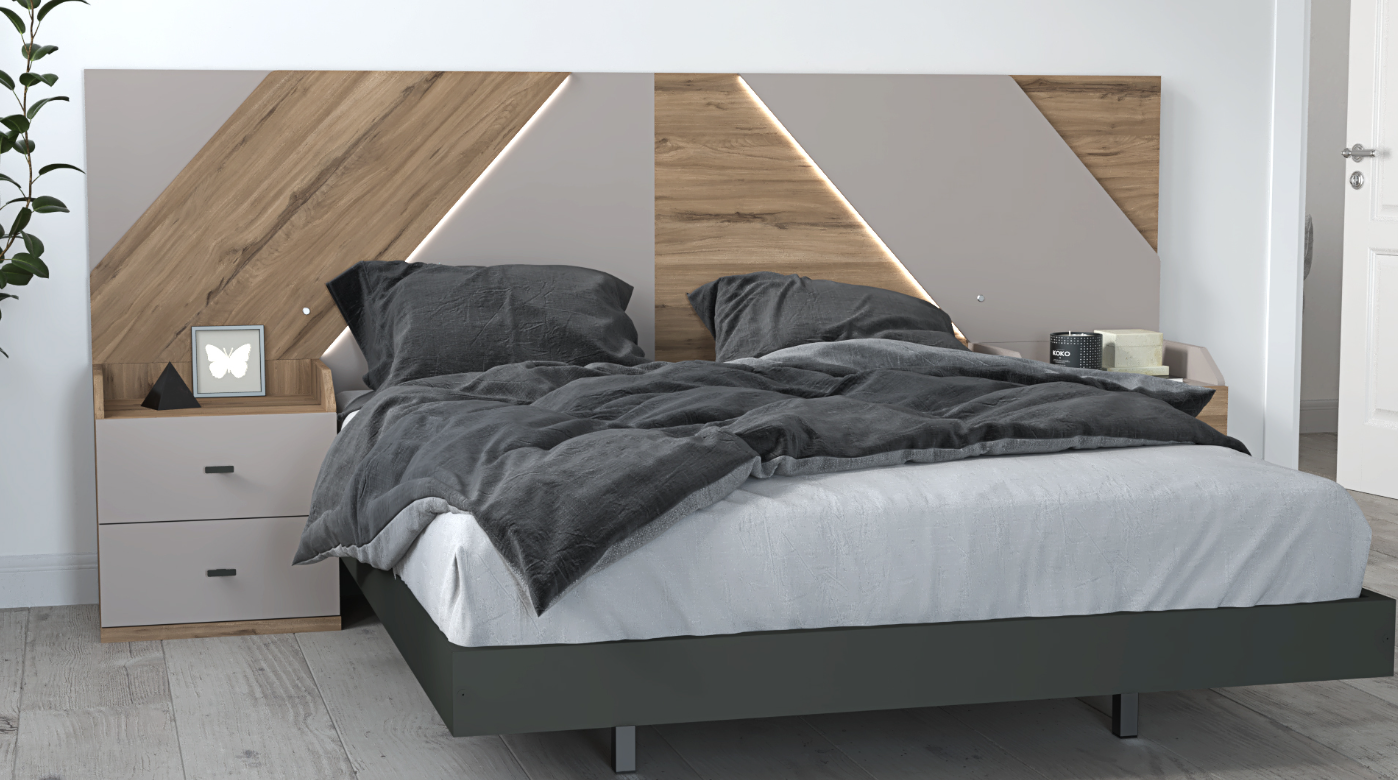 Finished in Gris Claro, Olmo Sabi, and accented with Pizarra, this set delivers a premium contemporary look. The queen bed with extended LED headboard creates soft ambient light, while the two nightstands provide hidden drawers and open cubbies for everyday convenience.