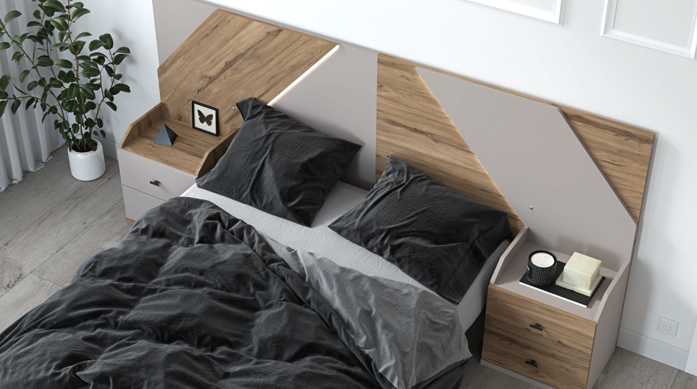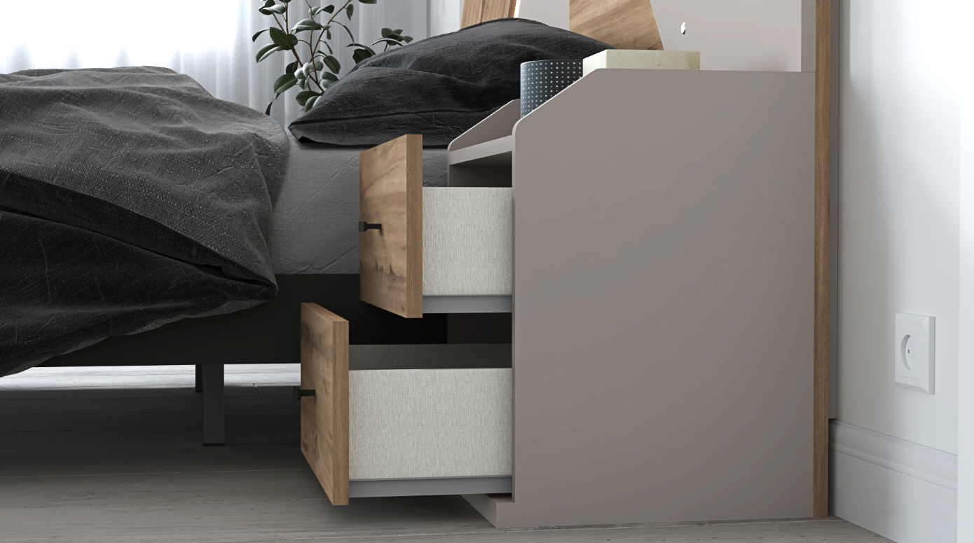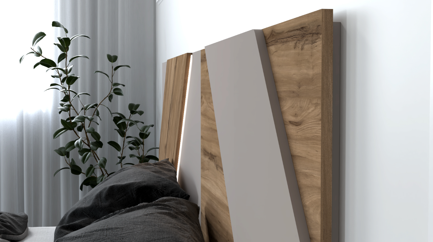 Finished in Gris Claro, Olmo Sabi, and accented with Pizarra, this set delivers a premium contemporary look. The queen bed with extended LED headboard creates soft ambient light, while the two nightstands provide hidden drawers and open cubbies for everyday convenience.