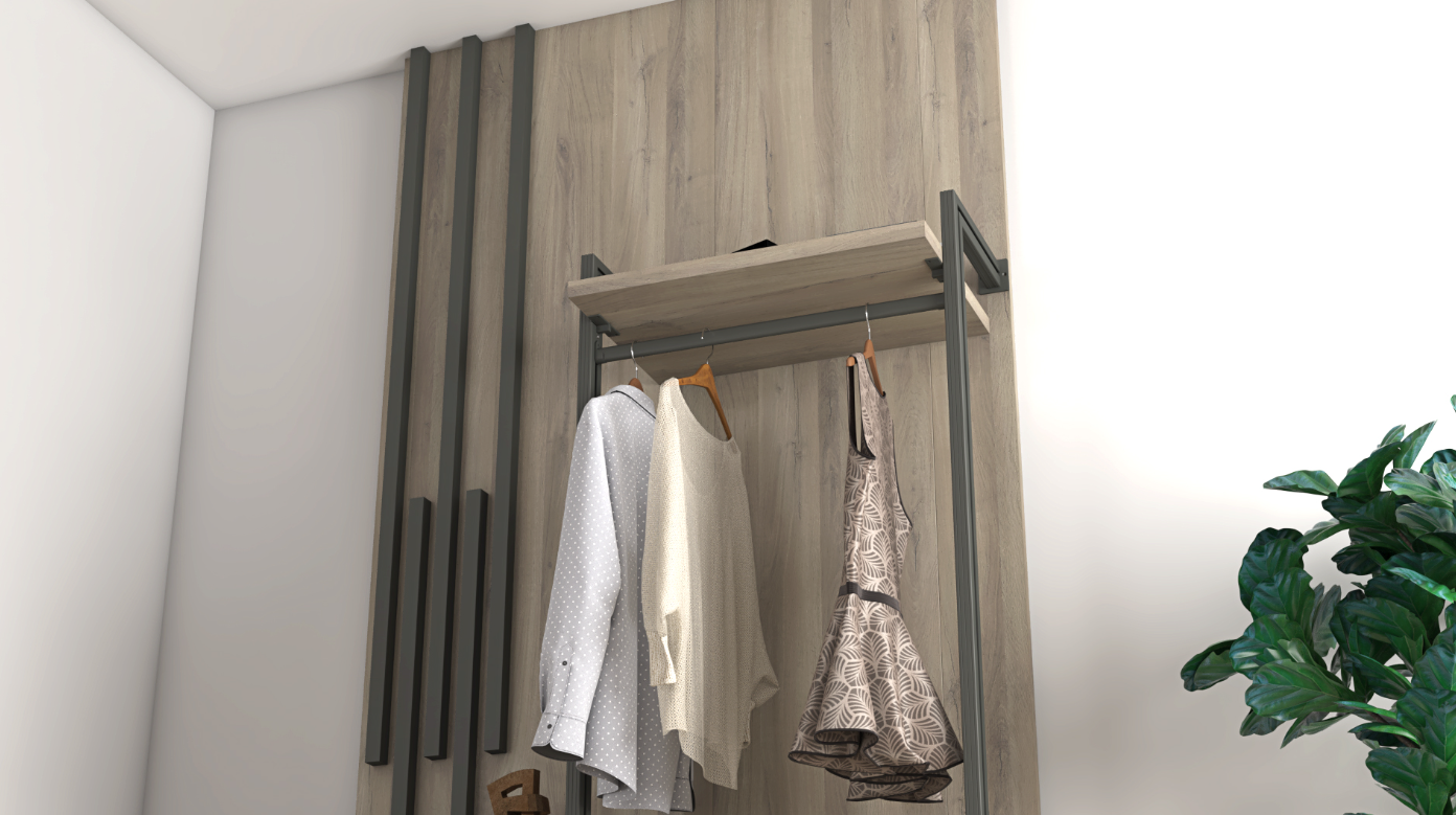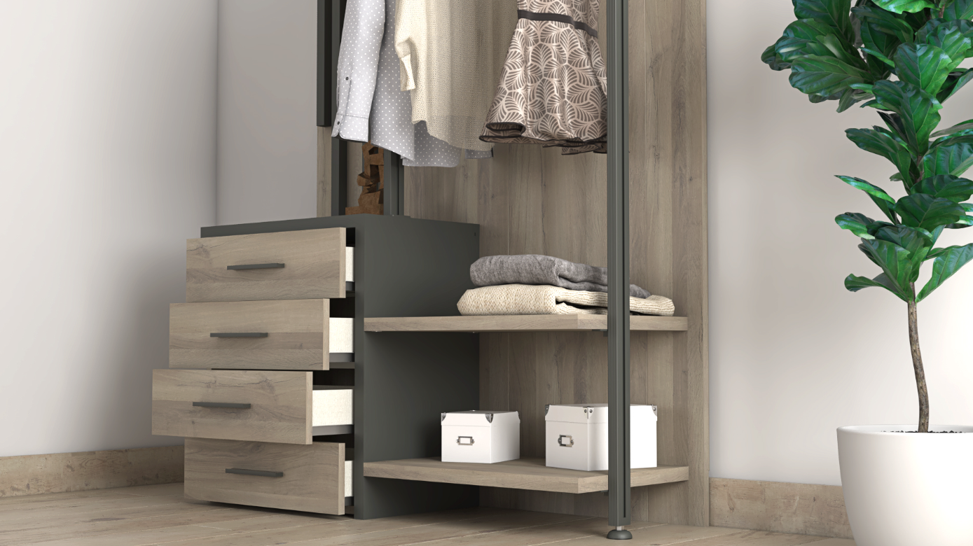 Full Height Decorative Panel Storage: A standout piece, this storage solution includes a 4-drawer chest and open shelves on an aluminium profile, complete with a hanging rod and additional open shelves, offering versatile storage options in an industrial style.