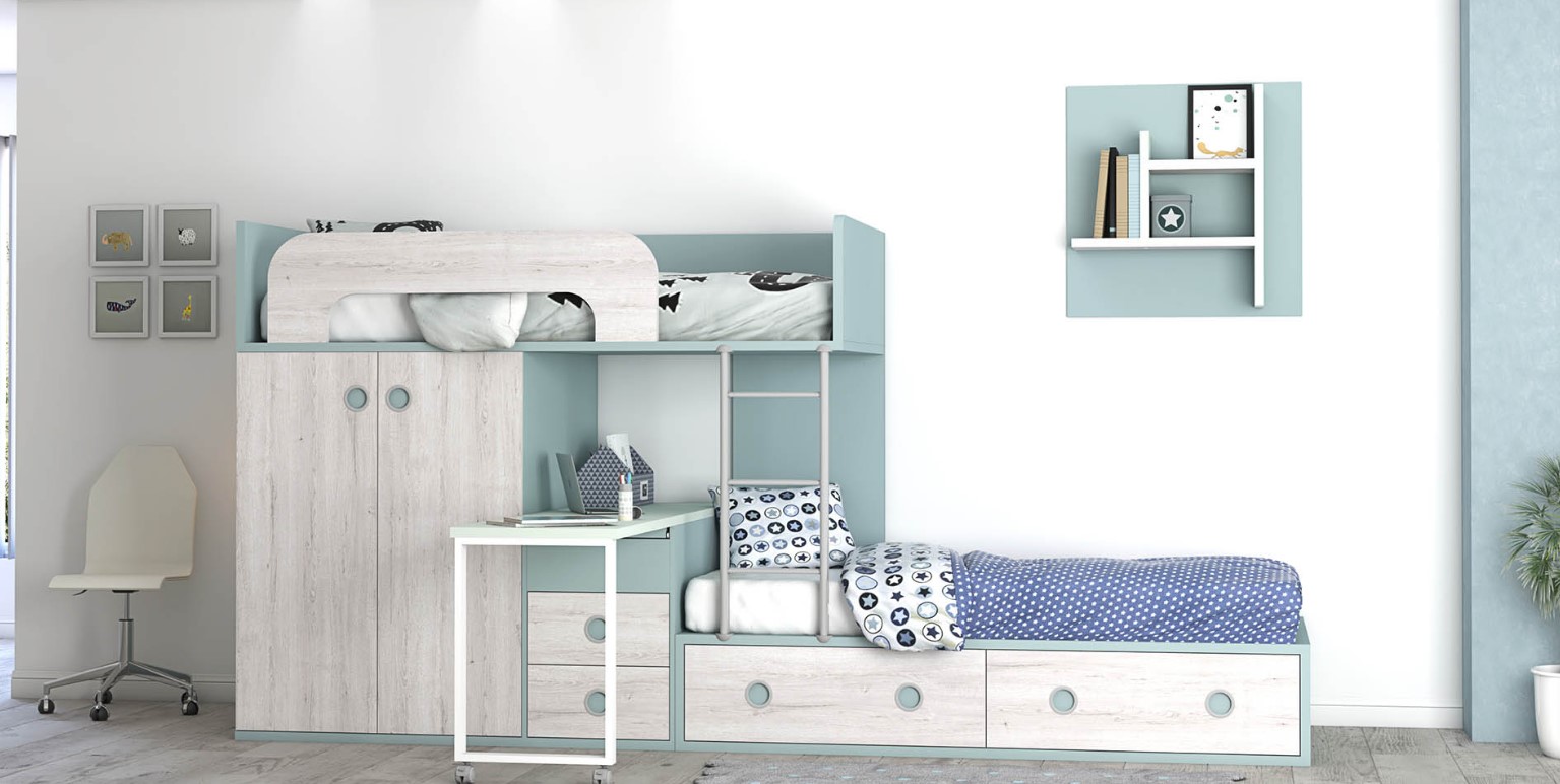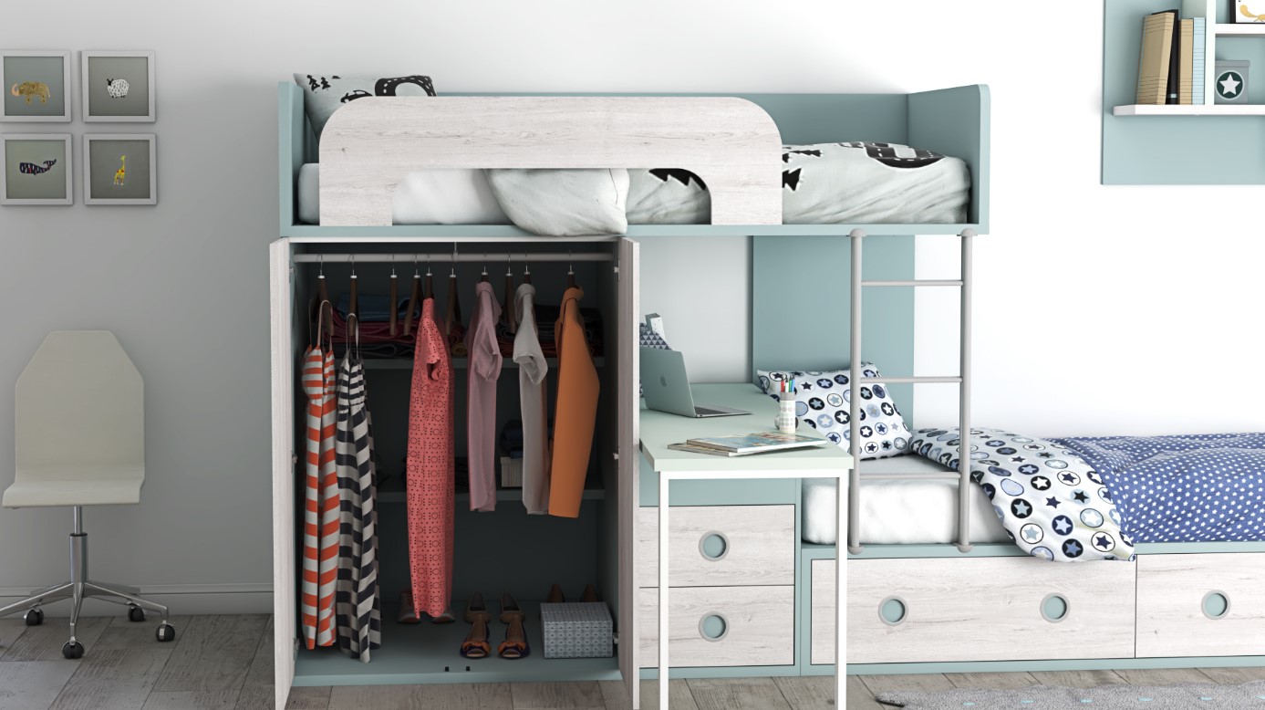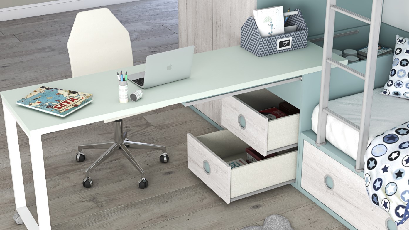Bunk Bed with Storage Solutions: At the core of the Cádiz Caracola collection, the bunk bed serves as a beacon of efficient design and cozy retreat. Equipped with two spacious storage drawers, it provides ample space for stowing away treasures and essentials, keeping the room tidy and serene. The integration of storage within the bed design ensures that functionality and elegance sail in unison. The Cádiz Caracola collection invites you to infuse your space with the serene yet vibrant essence of the coast. Each piece, from the multifunctional bunk bed to the space-saving desk and the capacious wardrobe, is crafted to elevate your daily living with a splash of color, a wave of functionality, and a breeze of inspiration.