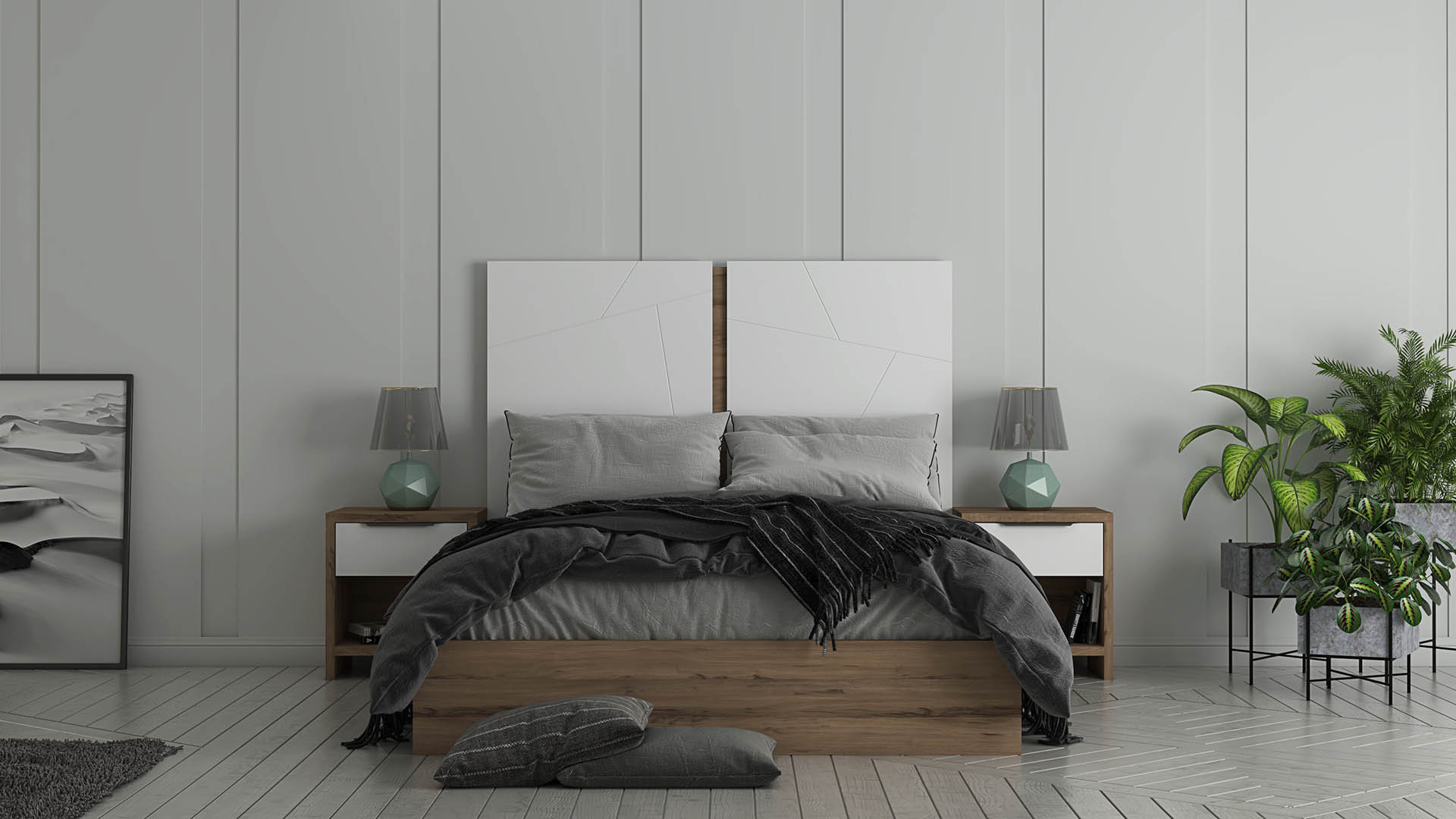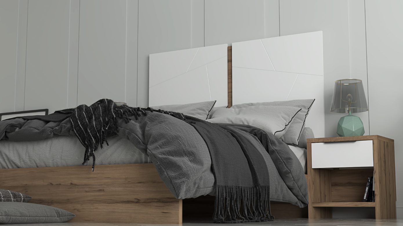 Queen Bed: The bed features a striking Blanco headboard, providing a clean and bright focal point that beautifully contrasts with the Olmo Sabi body for a sleek, contemporary look.