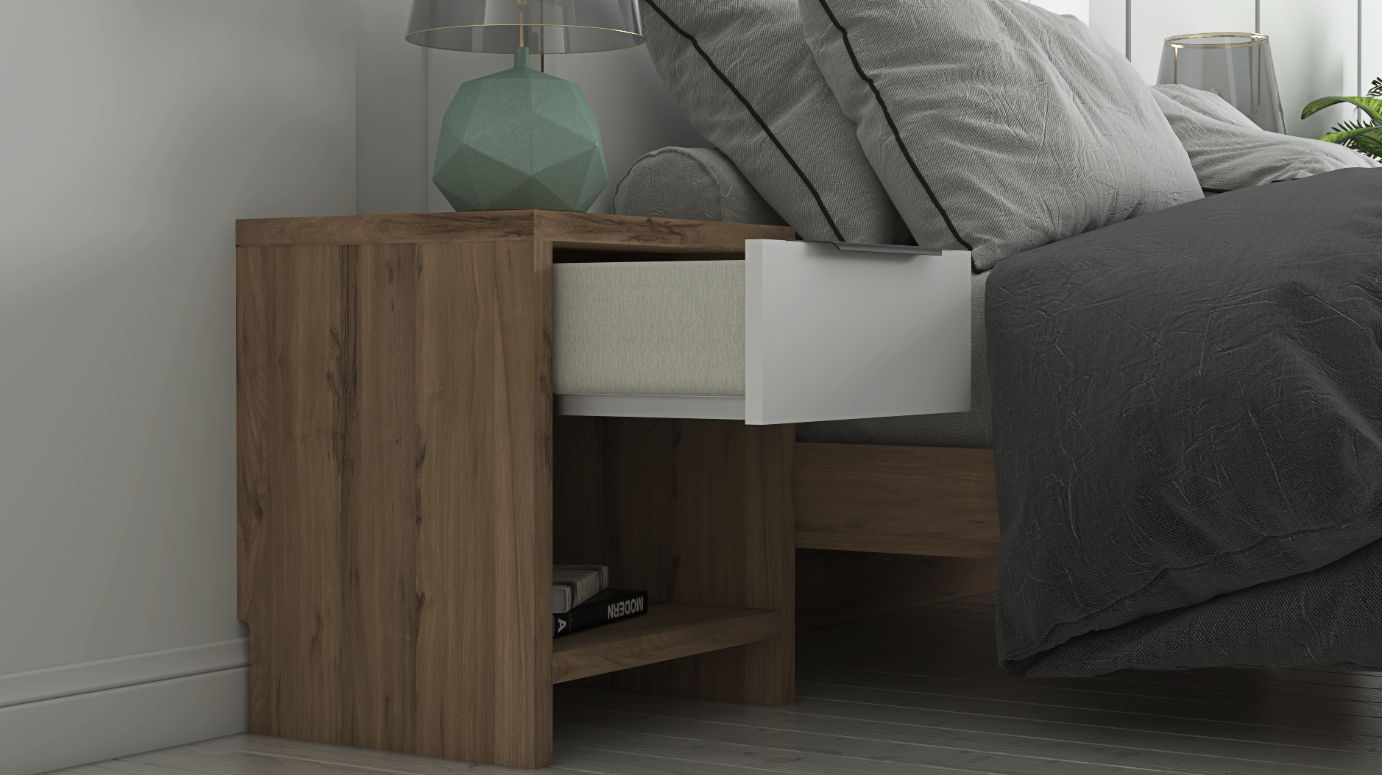Two Nightstands: Each nightstand mirrors the bed’s color scheme with a top drawer in Blanco and an open bottom shelf in Olmo Sabi, offering convenient bedside storage and display space.