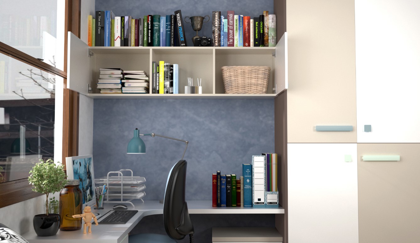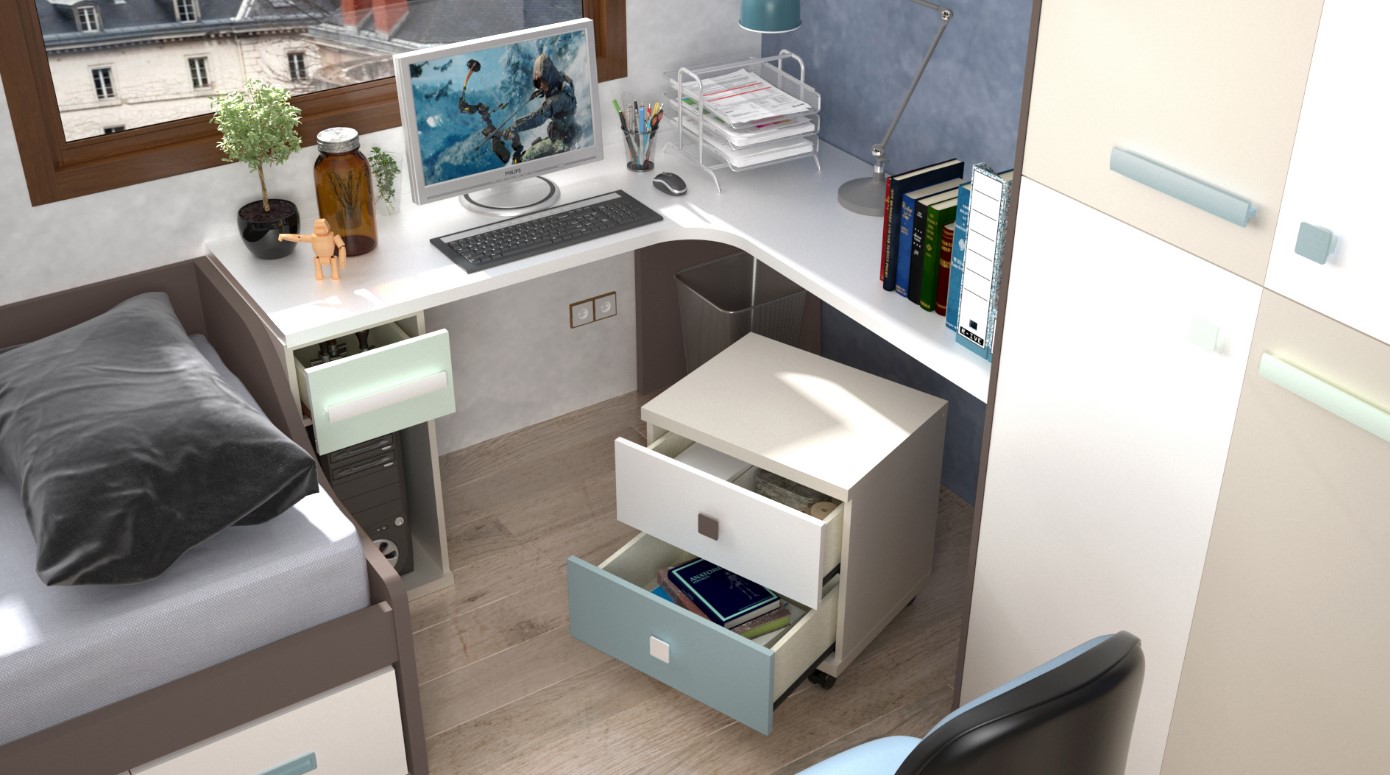 Versatile Study Area: A corner desk with a large surface and a storage cabinet on wheels ensures ample space for study and creativity, adaptable to any room layout.