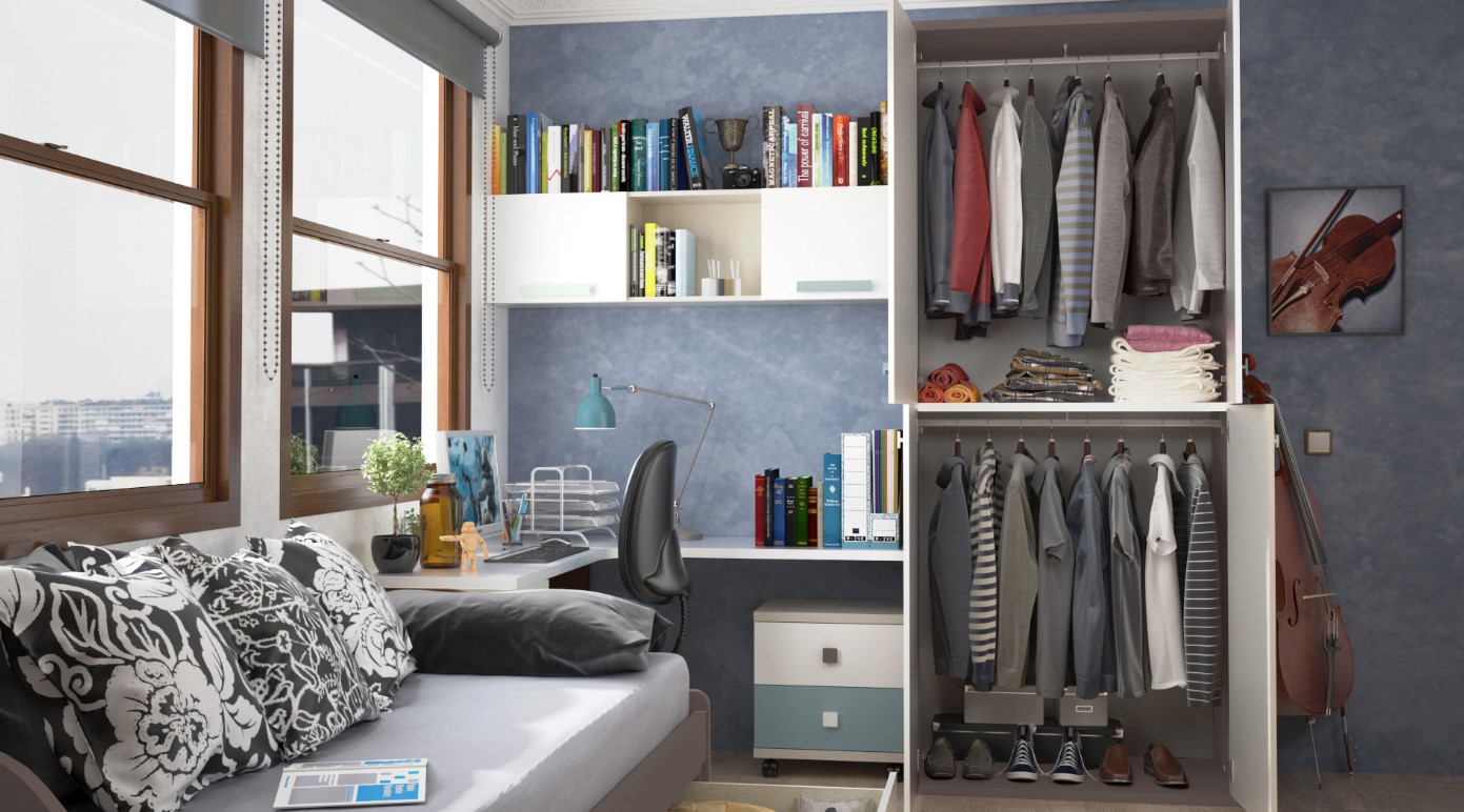 Ample Storage Options: Features a wall-mounted shelf with 2 doors for additional storage and a uniquely designed 2-door wardrobe, divided internally into four sections for organized clothing storage.