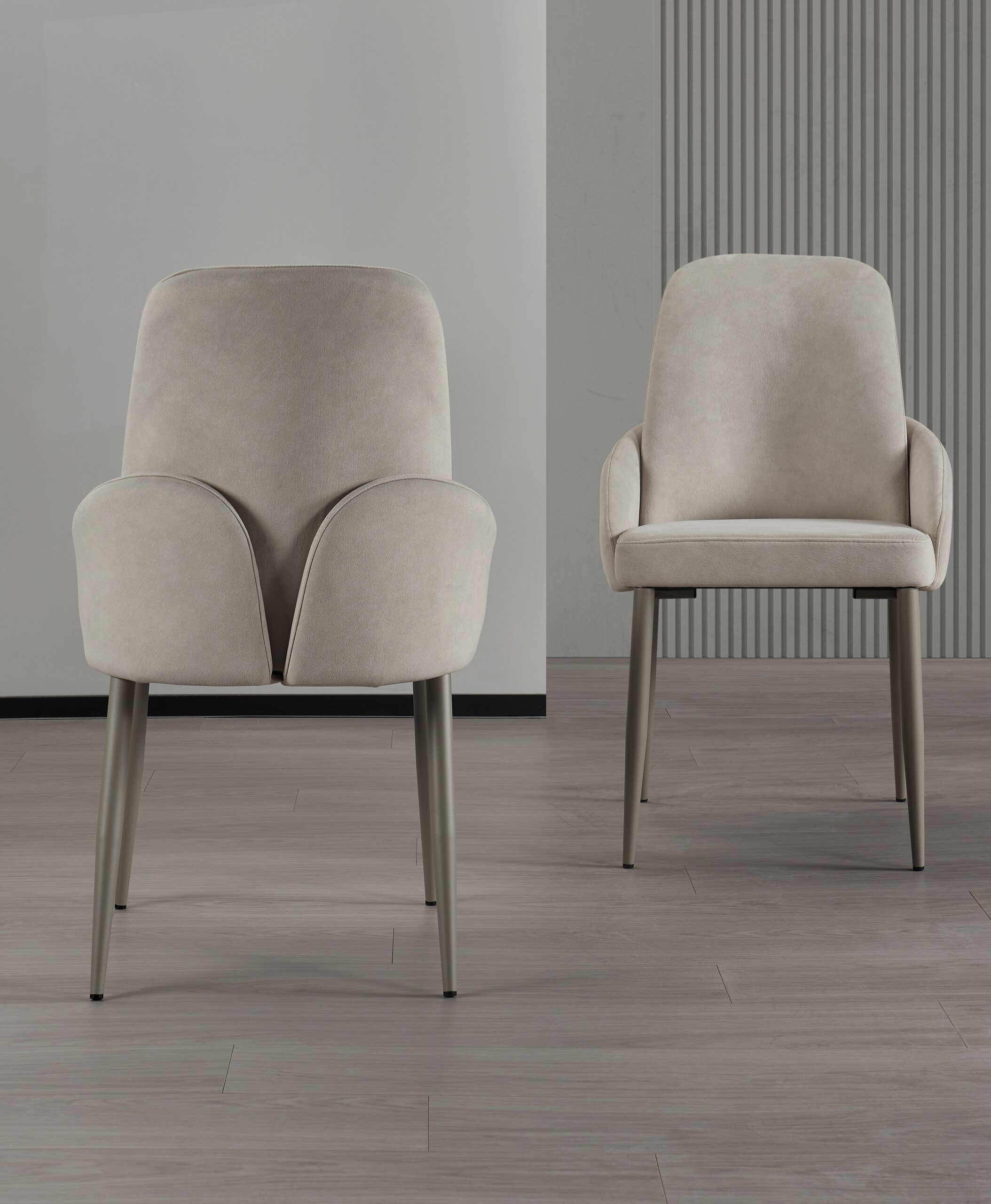 The Duvane Chair is wrapped in luxurious champagne light grey microfiber fabric. This choice of upholstery doesn’t just look exquisite—it offers a velvety soft texture that remains highly durable and easy to maintain, perfect for daily use and hosting guests.