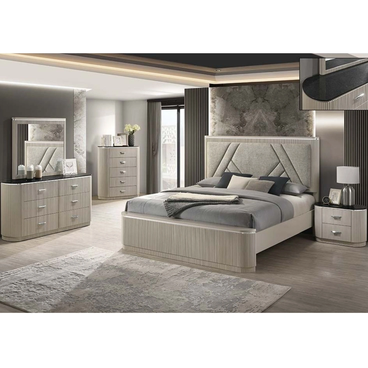 The Elvane collection is defined by its unique light beige ribbed design, featured across both the bed frame and case goods. This architectural texture adds a layer of visual interest and tactile elegance that sets it apart from standard bedroom furniture.