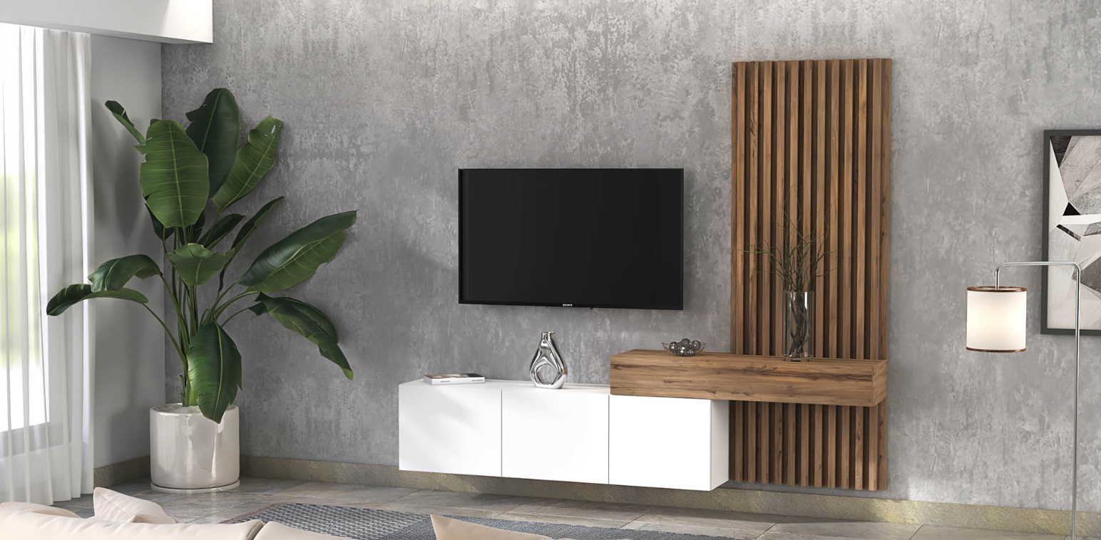- The accompanying wall panels and top unit, finished in the warm and inviting Olmo Sabi, provide a beautiful contrast to the TV stand, adding depth and warmth to the overall design.