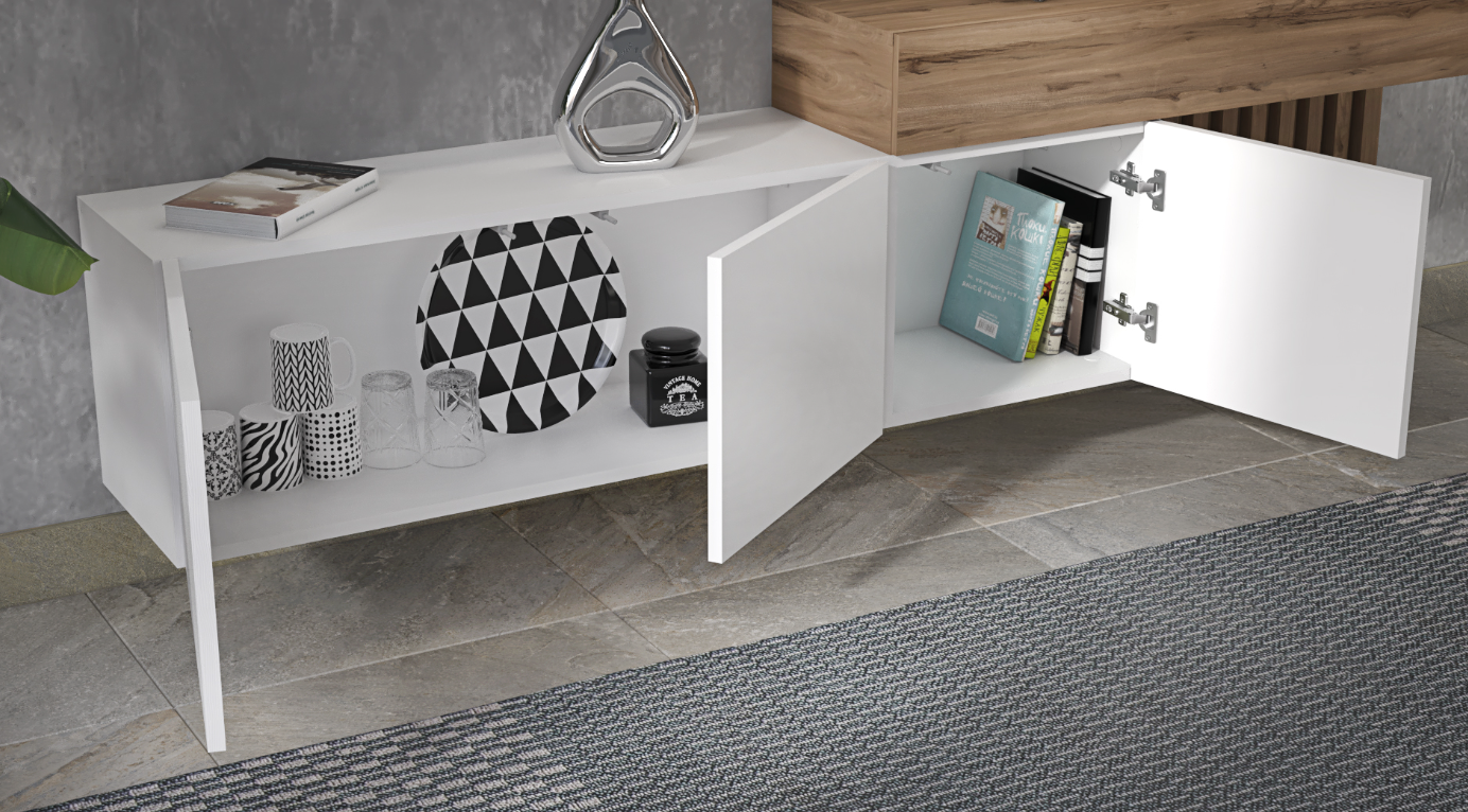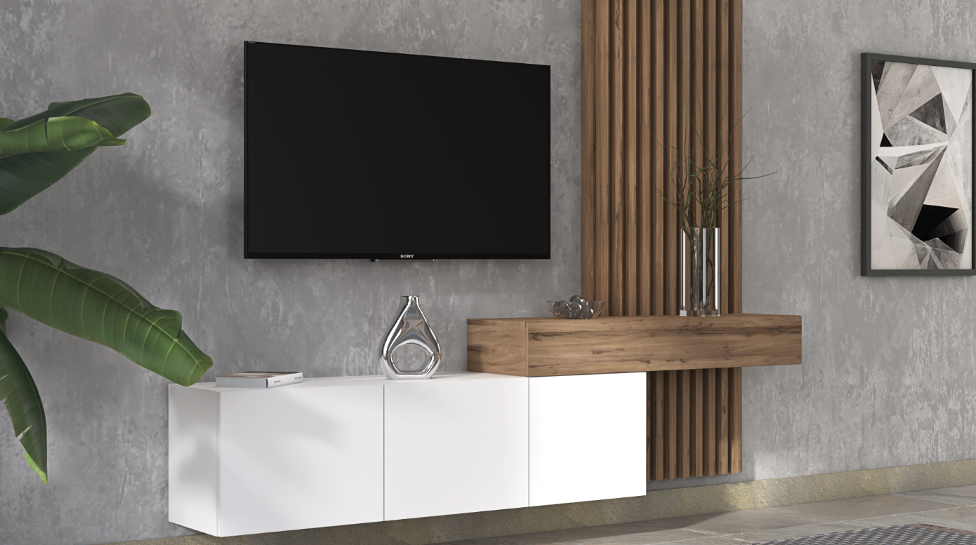 - Crafted with a luxurious Blanco Atlas finish, this wall-mounted TV stand embodies modern elegance, creating a floating effect that enhances the sense of space.