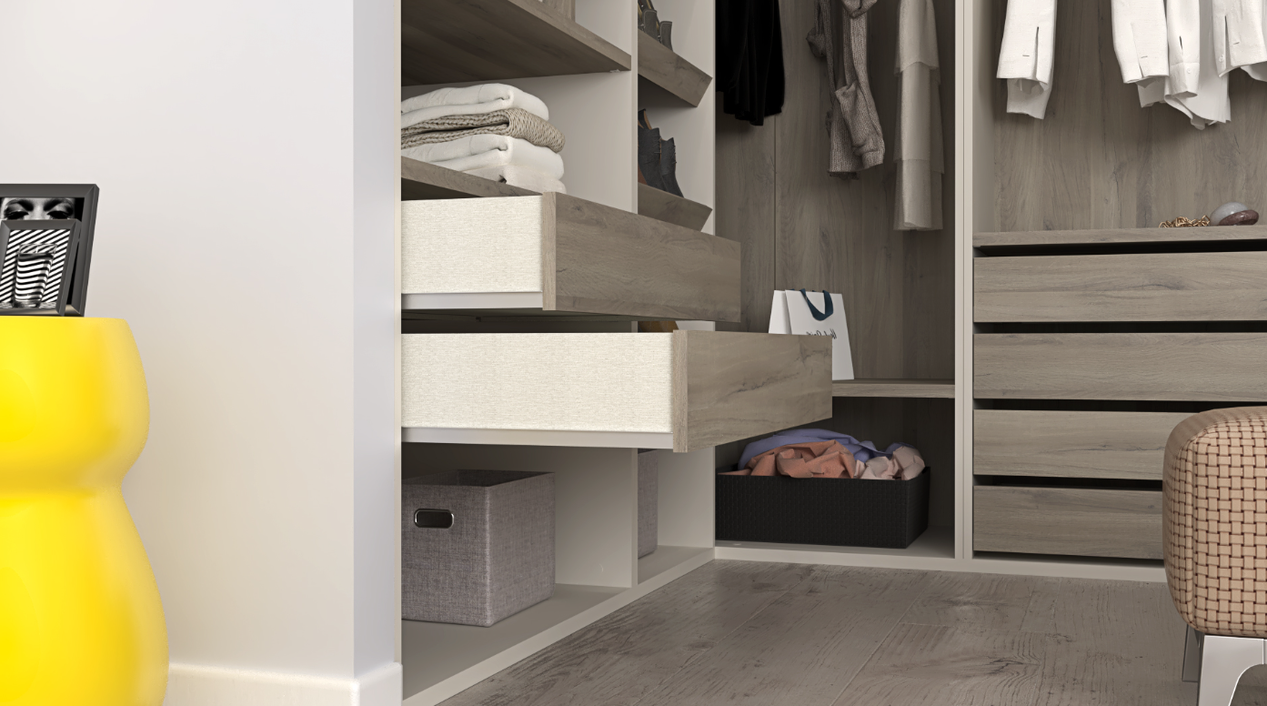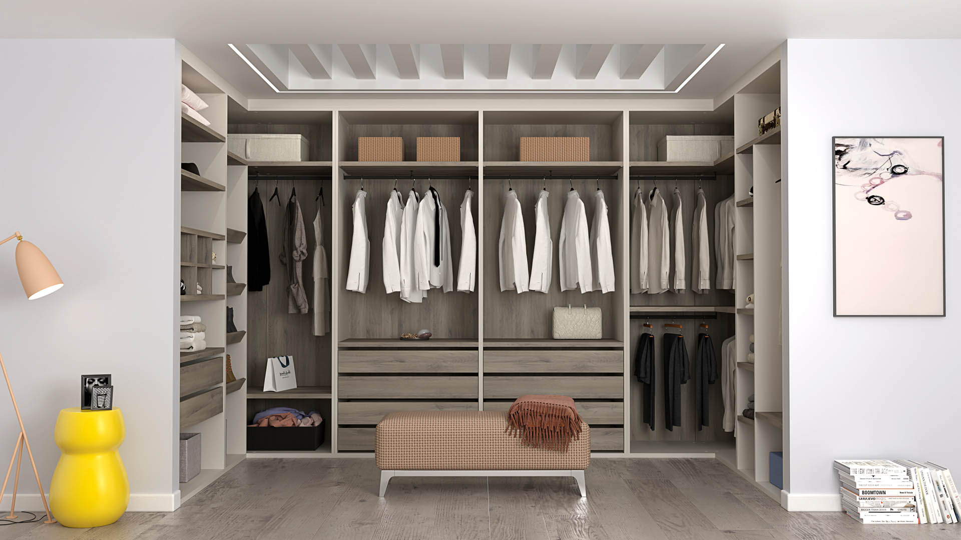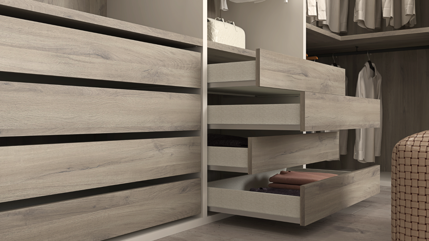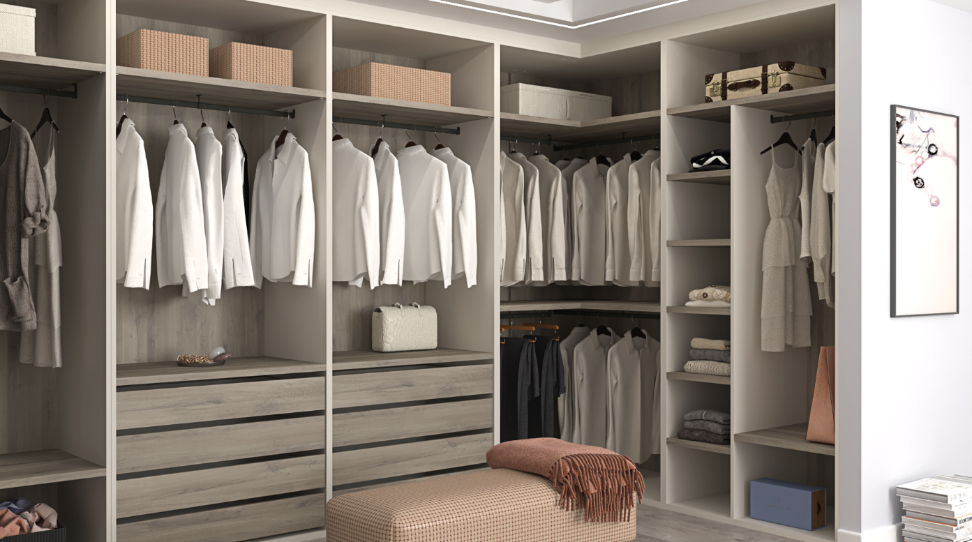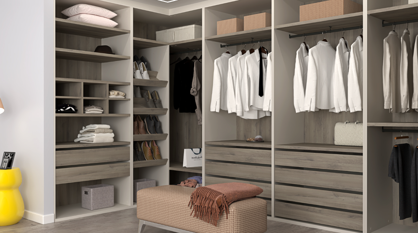 Finished in modern Gris Coco with rich Iron Oak accents across shelving, drawers, and back panels, the Frigiliana collection delivers a balanced contrast of sophistication and warmth. The layout includes dual integrated four-drawer chests, dedicated shoe-organizer shelving, multiple hanging rods at varied heights, and full-height shelving for folded garments, boxes, and accessories.