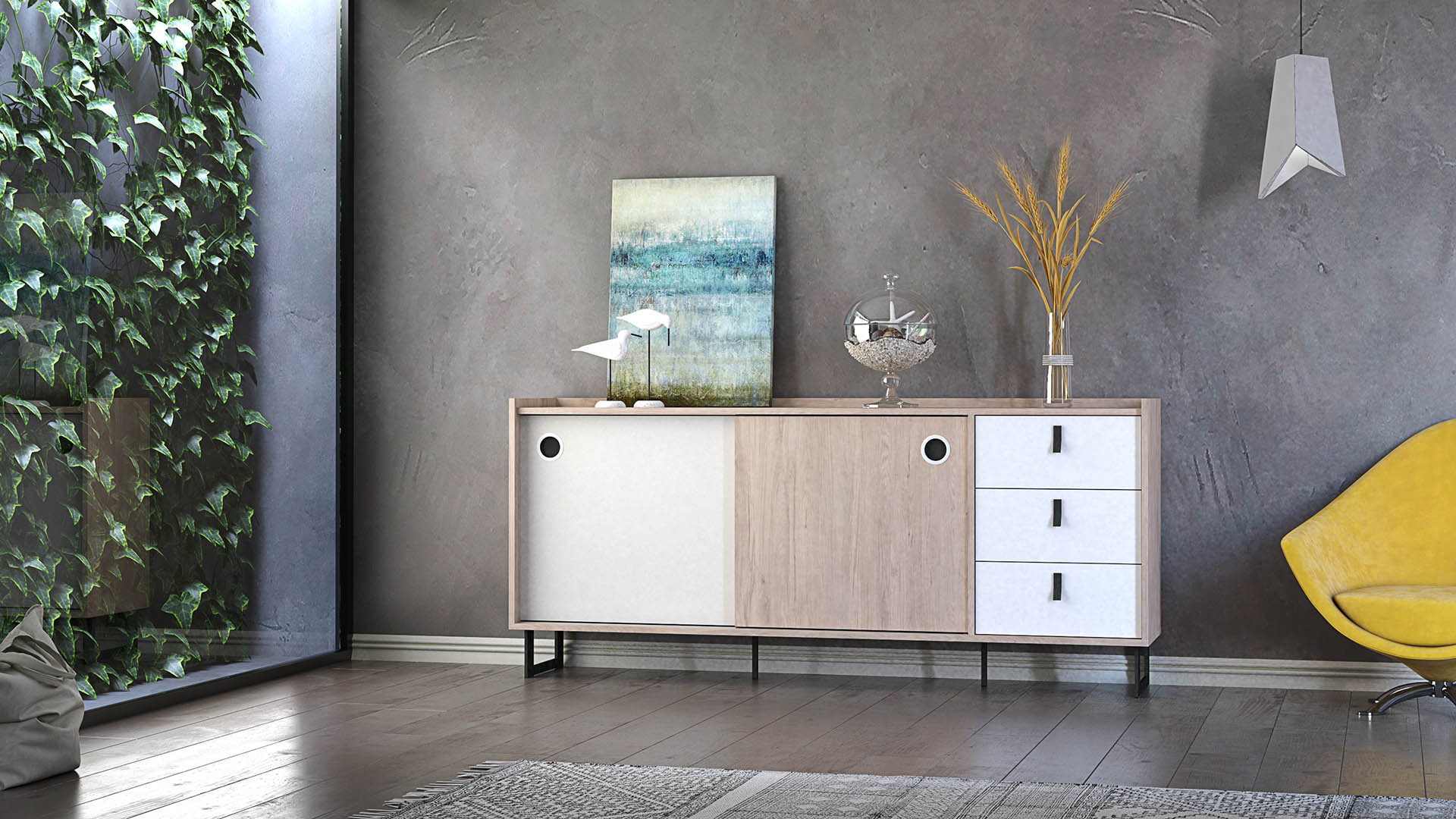 Metal Legs: Resting on sturdy metal legs, the Credenza Gracia is elevated to create an airy and open feel. The metal legs not only provide strong support but also add a touch of industrial chic to the design, enhancing its modern character.