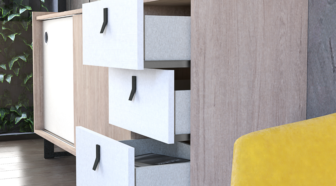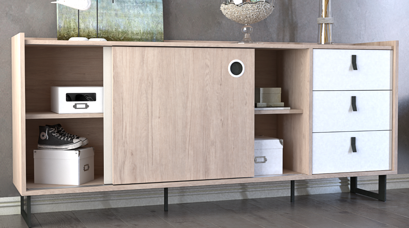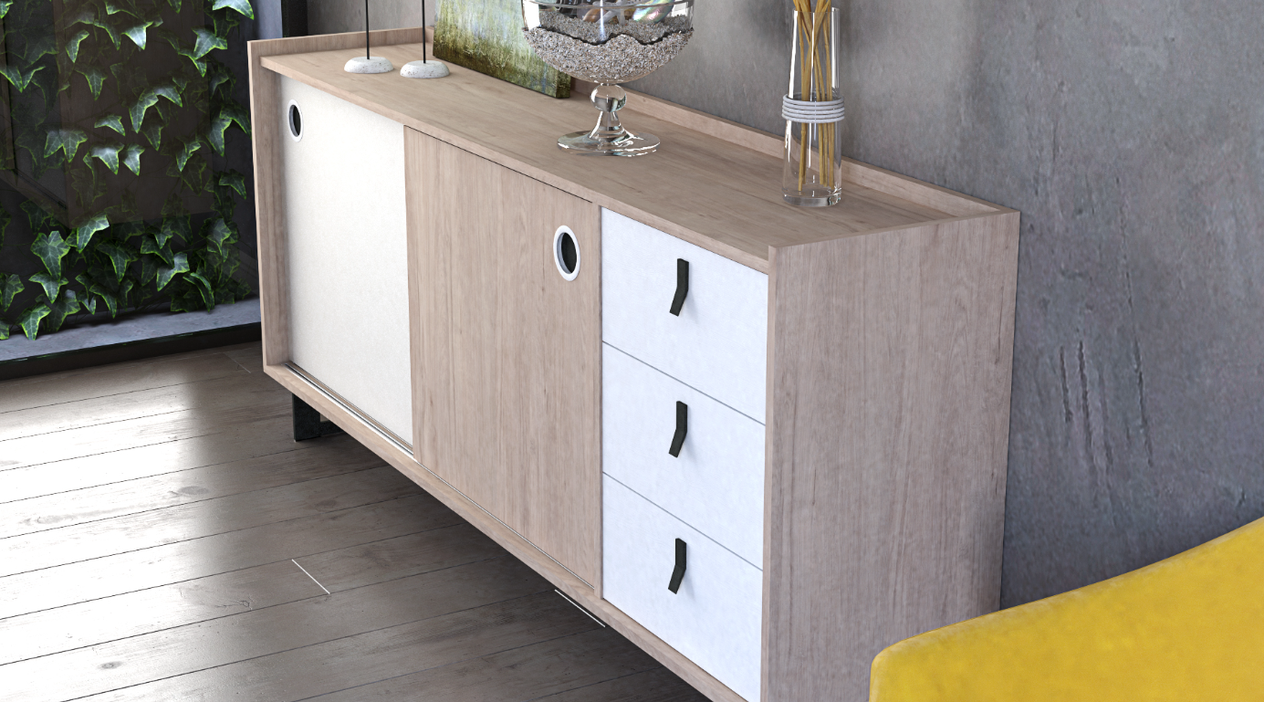 Blanco Atlas and Gris Coco Accents: Accented with panels in Blanco Atlas and Gris Coco, the credenza features a modern color palette that enhances its contemporary appeal. These accents add depth and dimension, creating a visually appealing contrast against the Roble Aurora.