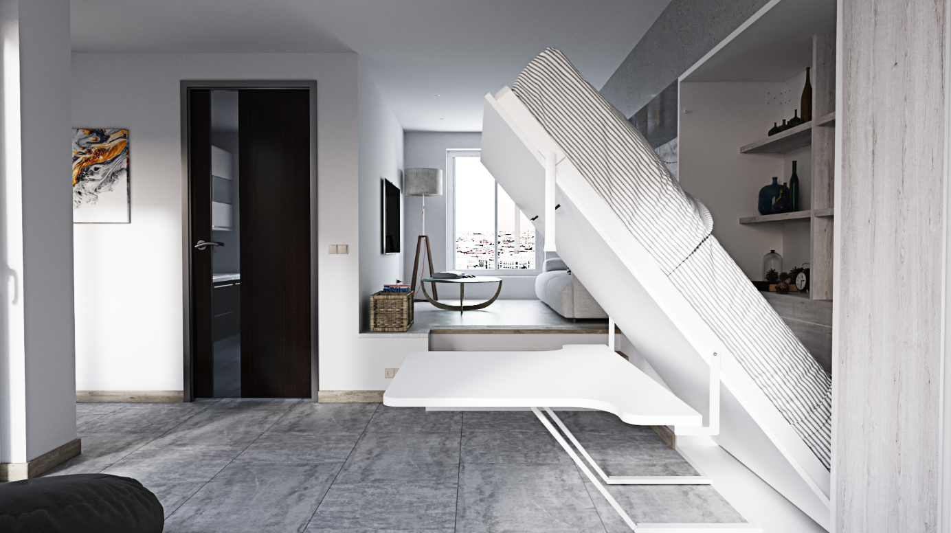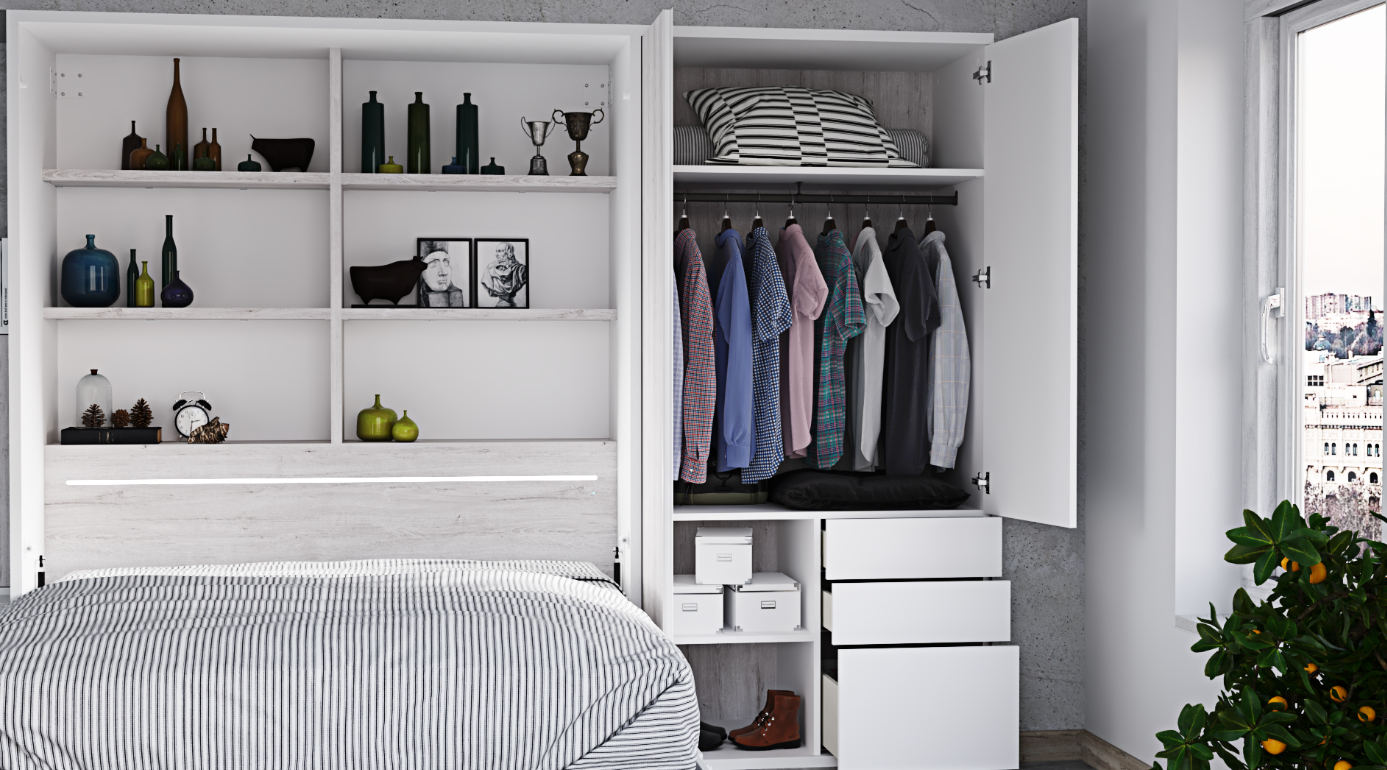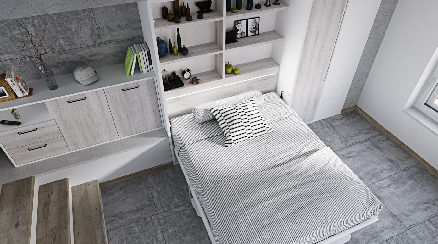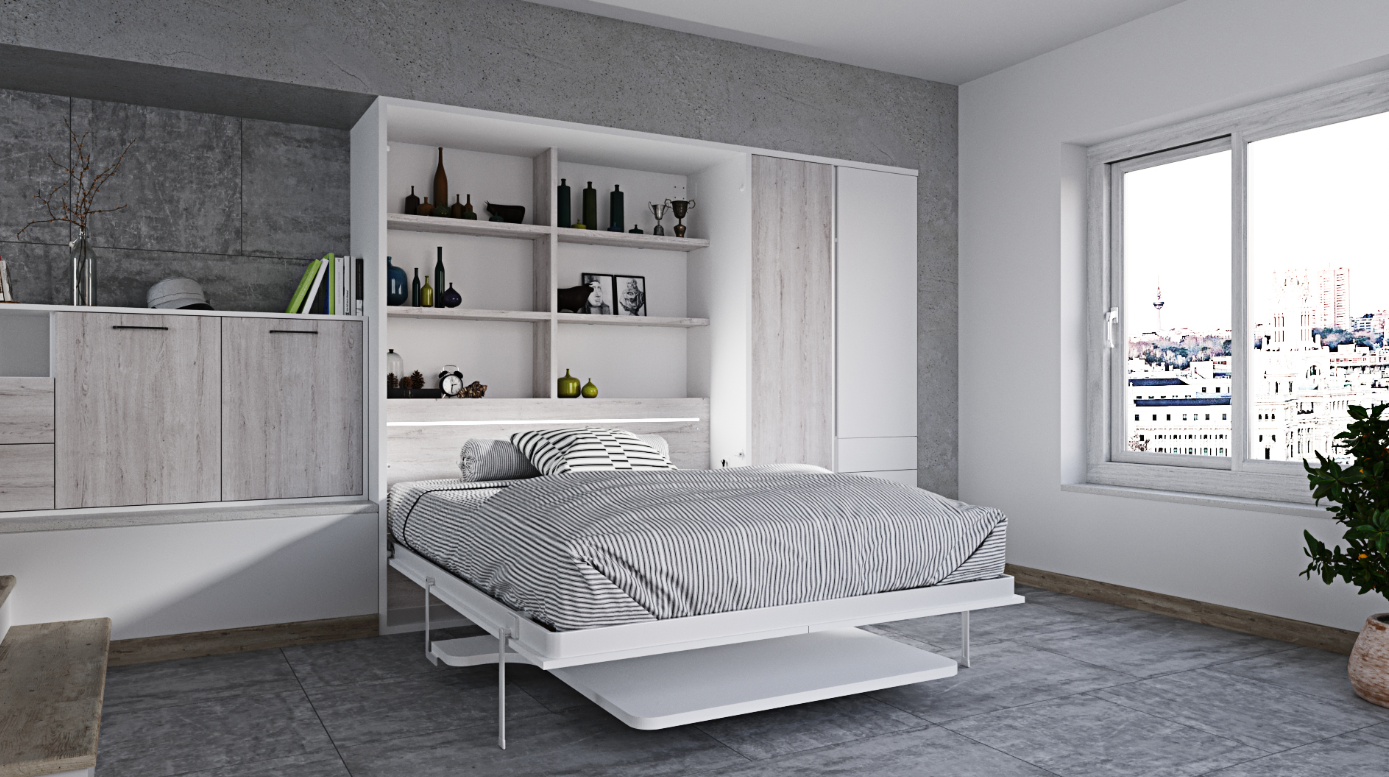 Elegant Design and Functional Lighting: The Murphy bed unit is enhanced with built-in LED lights, adding ambiance and functionality to the bedroom setting. The lighting design not only illuminates the space but also highlights the beauty of the furniture.