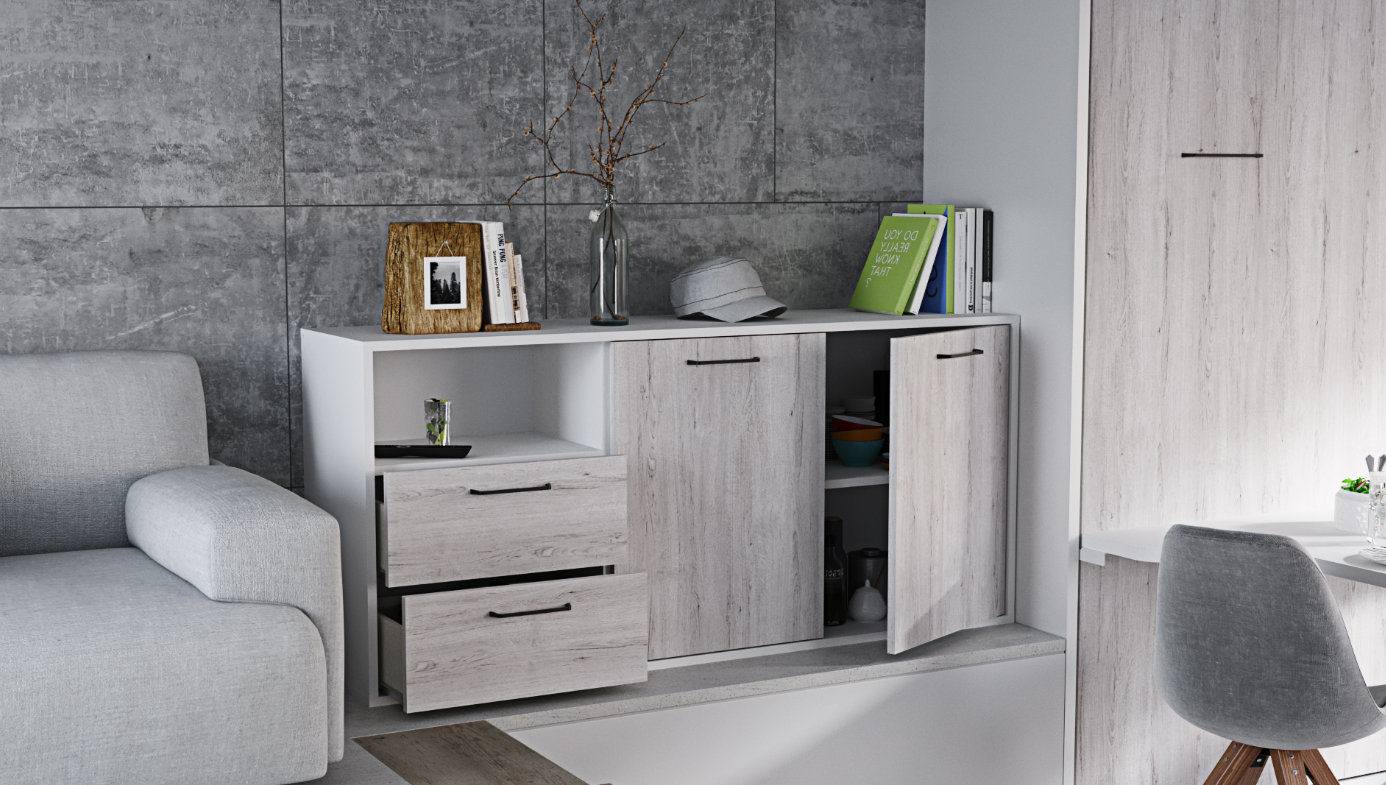 Versatile Storage Credenza: This piece combines practicality with elegance, featuring two small drawers and an open shelf for easy access, plus two doors for concealed storage. It’s perfect for keeping daily essentials organized and within reach.