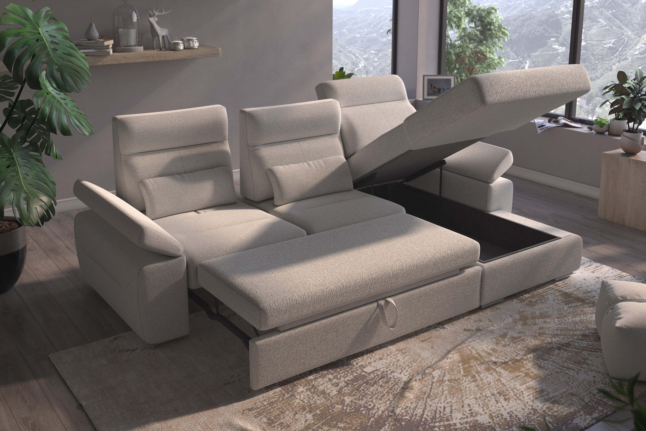 The spacious chaise features built-in storage, perfect for blankets, pillows, or seasonal essentials, while the integrated pull-out sofa bed transforms the sectional into a comfortable sleeping area in seconds. Built on a solid wood and eco-engineered wood frame with Nosag steel spring suspension, the Granada delivers long-lasting durability and superior seating support.