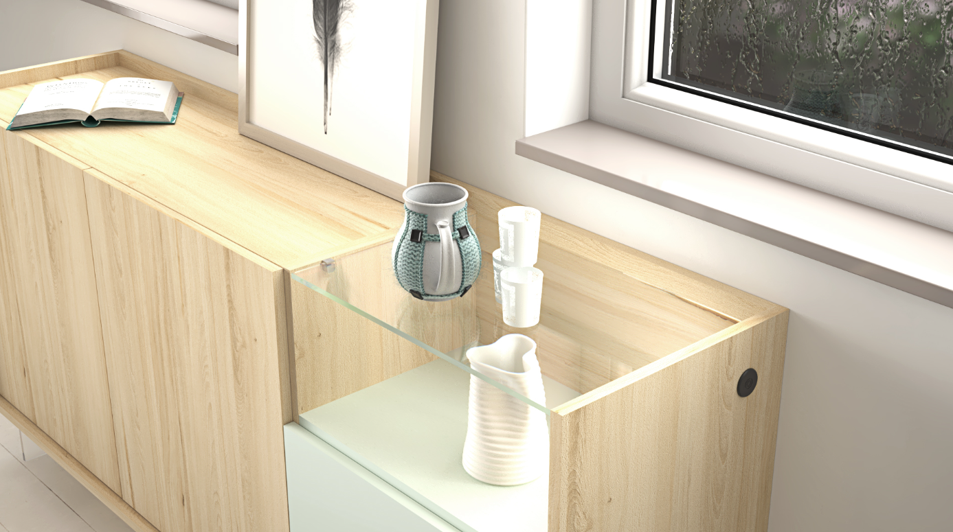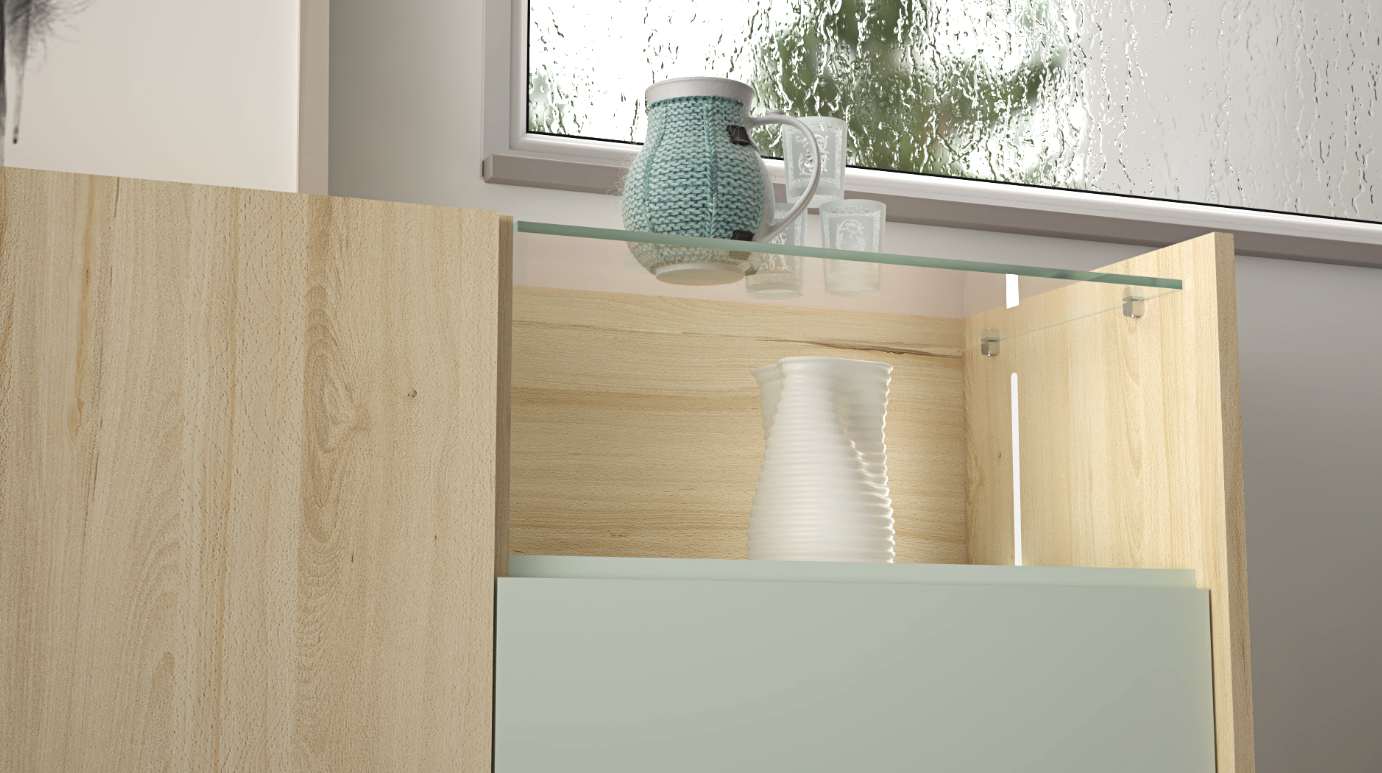Integrated LED Lighting: Below the glass insert, an open shelf illuminated by LED lights offers the perfect showcase for decorative items, enhancing the ambiance of any room.