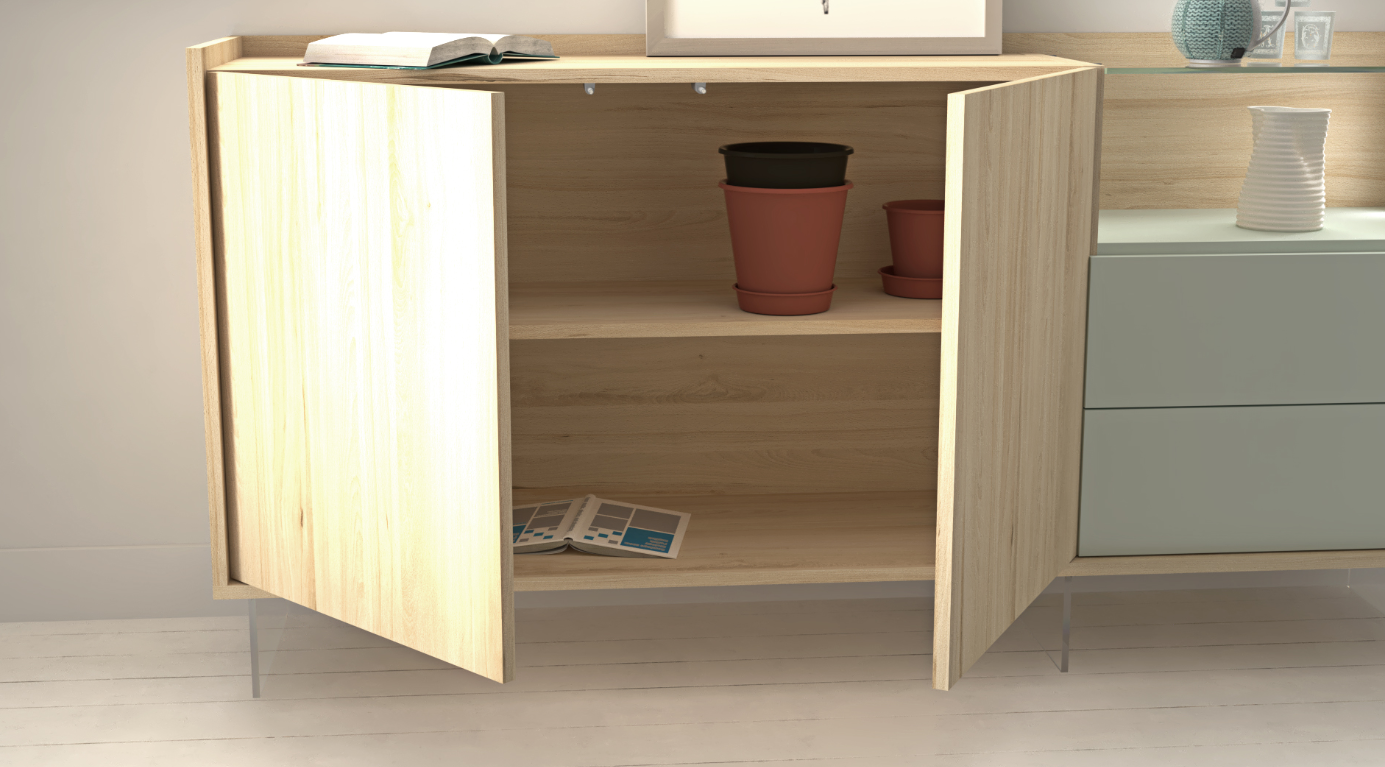 Ample Storage: Equipped with two doors and two small drawers in a contrasting Verde Nube, this credenza offers generous storage space for electronics, media accessories, or personal items, keeping your space organized and clutter-free.