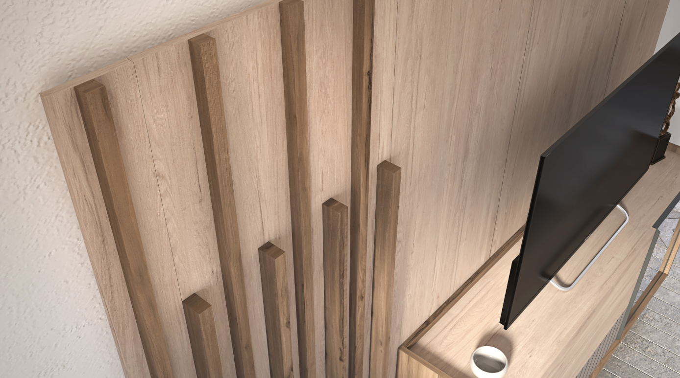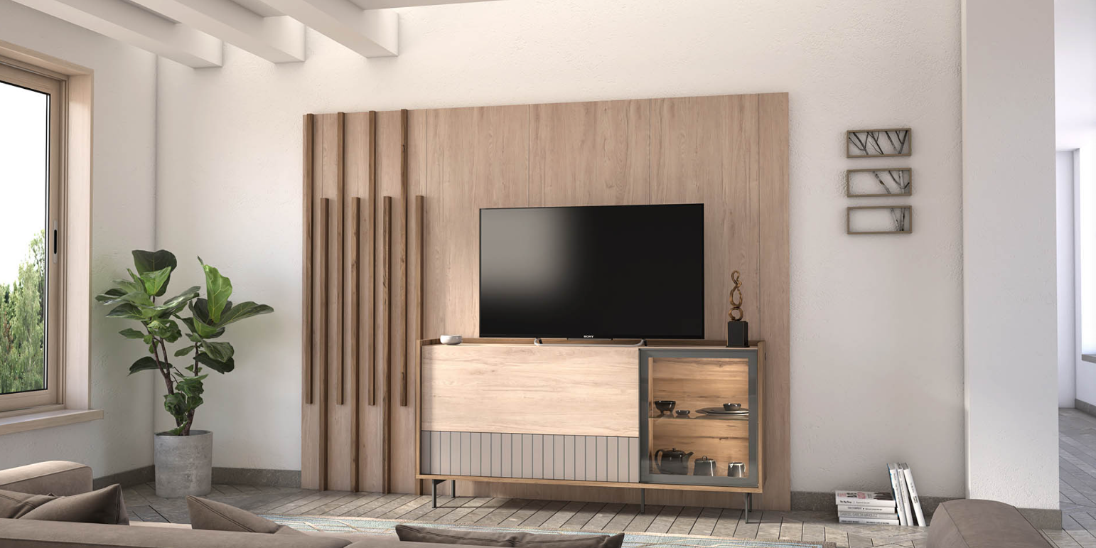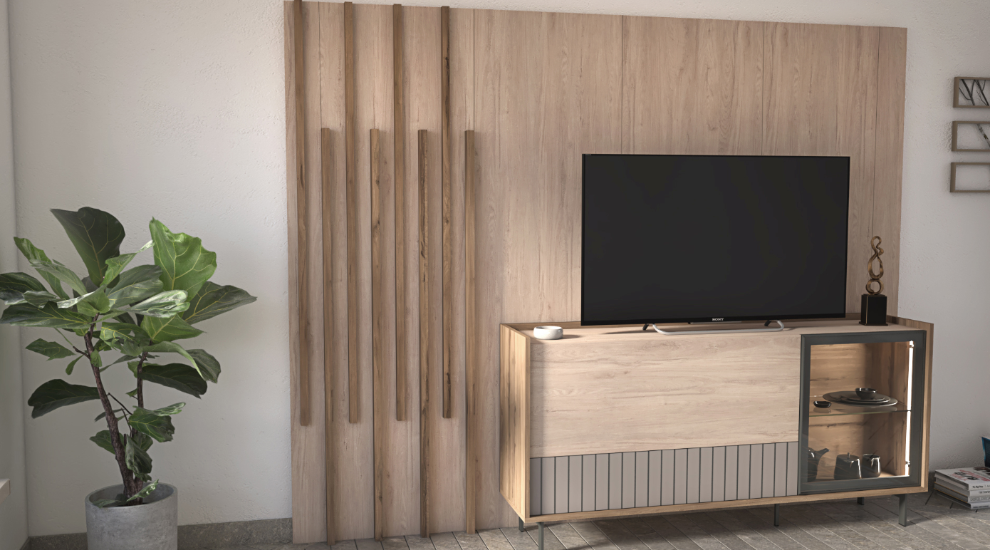 • Crafted in the inviting hues of Roble Aurora and Olmo Sabi, this panel provides a warm and inviting backdrop for the entertainment area.