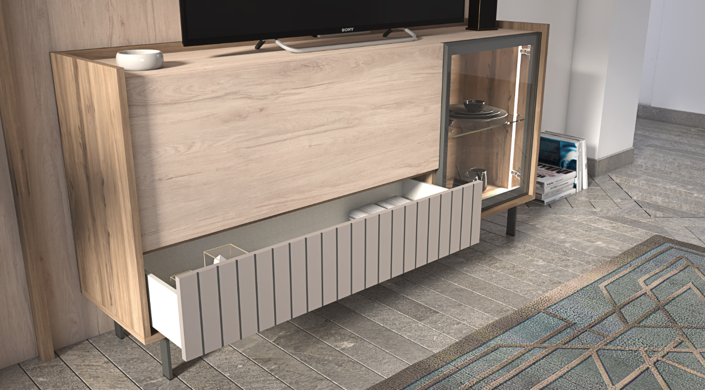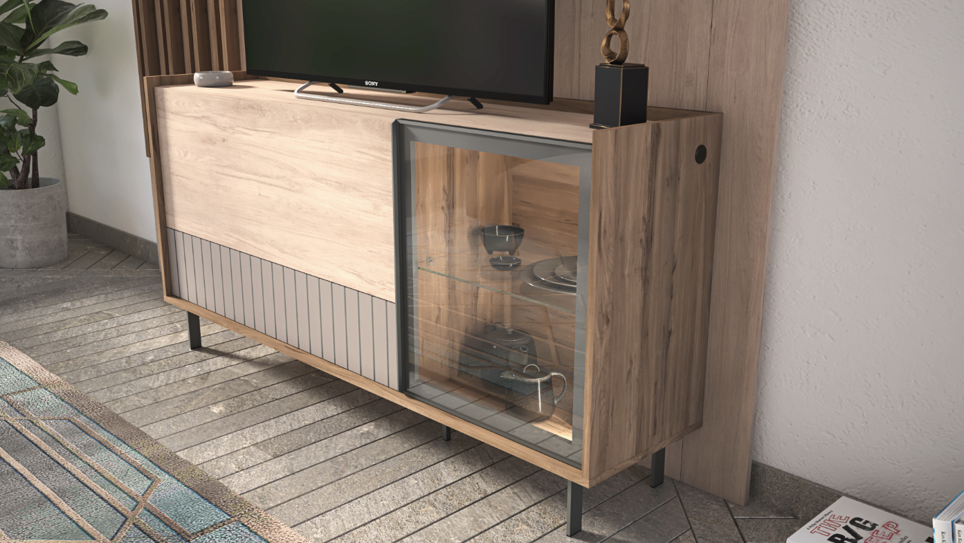 The Hugo TV Unit is a showcase of contemporary elegance, designed to bring both warmth and sophistication to your entertainment space. Characterized by its main colors of Roble Aurora and Olmo Sabi, and accented with the chic Mineral Grey and textured Mineral Grey Ranurado, this unit offers a rich palette that complements modern living environments. Ideal for those aiming to create a statement in their home, the Hugo collection merges rich textures with smart storage solutions.