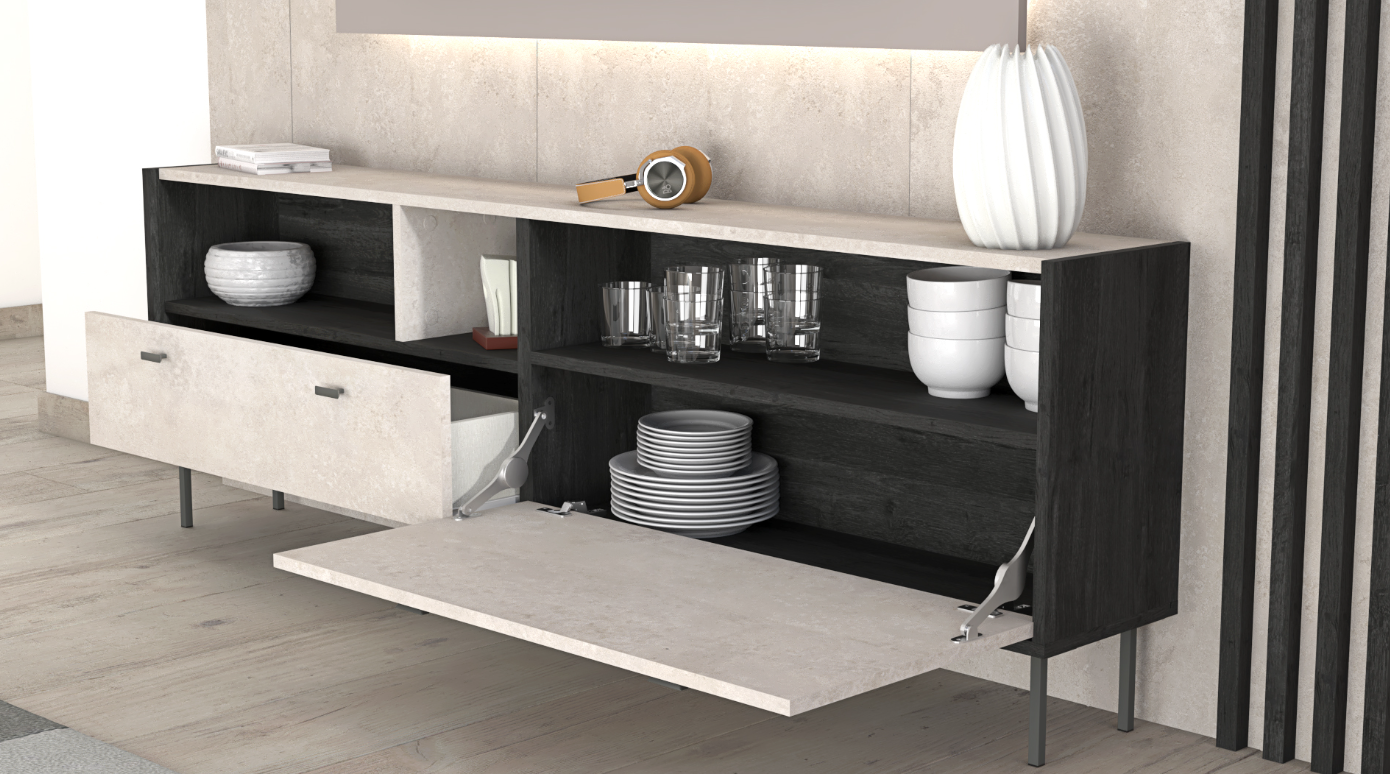 - The body of the stand in Roble Azabache, complemented by Luna Nueva fronts and accent stripes, establishes a bold presence that commands attention.