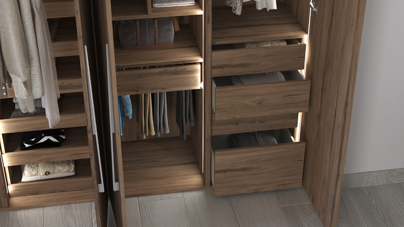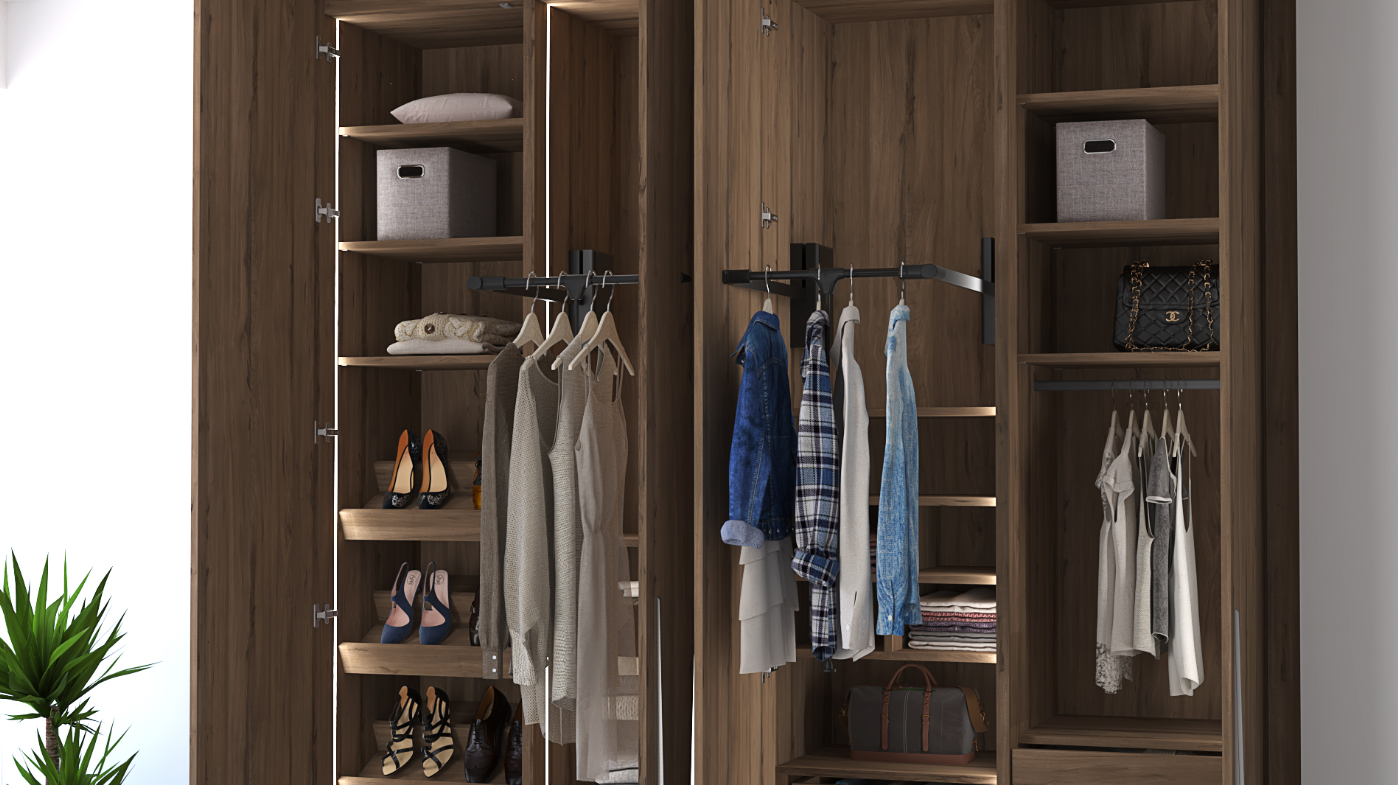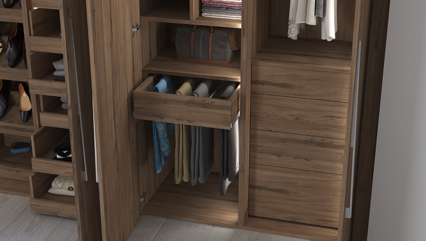 Finished entirely in warm Olmo Sabi, the wardrobe brings a calm, sophisticated presence to the bedroom. Its interior is thoughtfully equipped with integrated LED lighting, multiple storage drawers, a dedicated pants organizer, built-in shoe racks, versatile hanging rods including a retractable rod, and an integrated chest of drawers for enhanced organization.