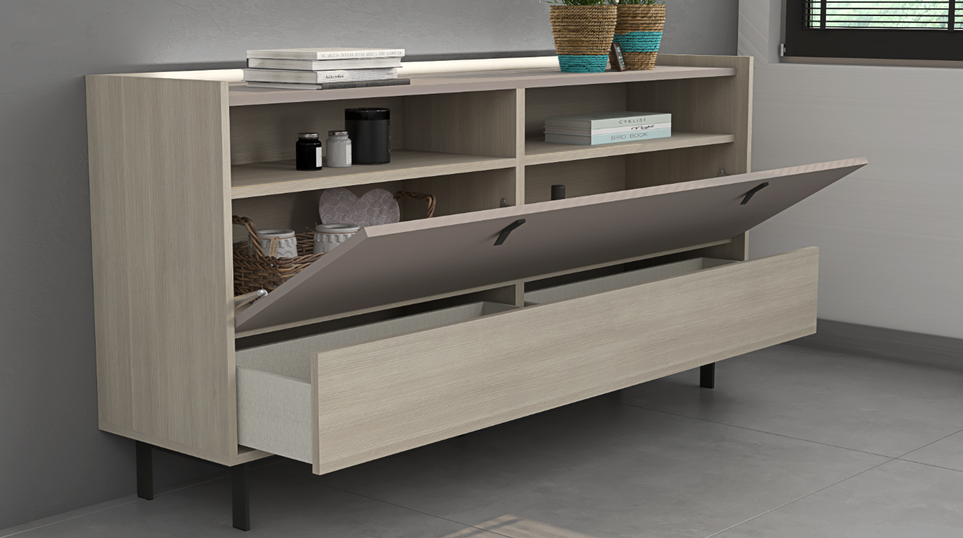 Versatile Credenza: Features a spacious interior illuminated by LED lighting, hidden behind a large Mineral Grey folding door, perfect for storing and displaying items. Below, a large double drawer in Olmo provides ample space for keeping essentials organized. Like the curio cabinet, the credenza is supported by black metal legs, ensuring stability and adding a contemporary flair.