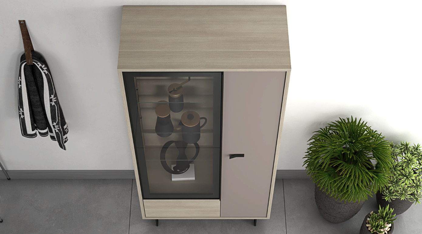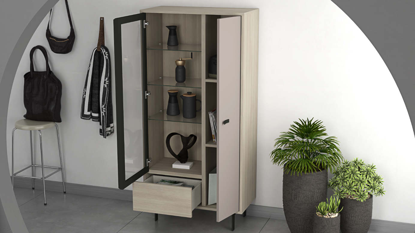 Elegant Curio Cabinet: Showcasing glass shelvings behind a glass door for your most cherished items, complemented by a Mineral Grey regular door and a small bottom drawer in Olmo for additional storage. The cabinet stands on sleek black metal legs, adding a touch of modernity to the piece’s natural aesthetic.