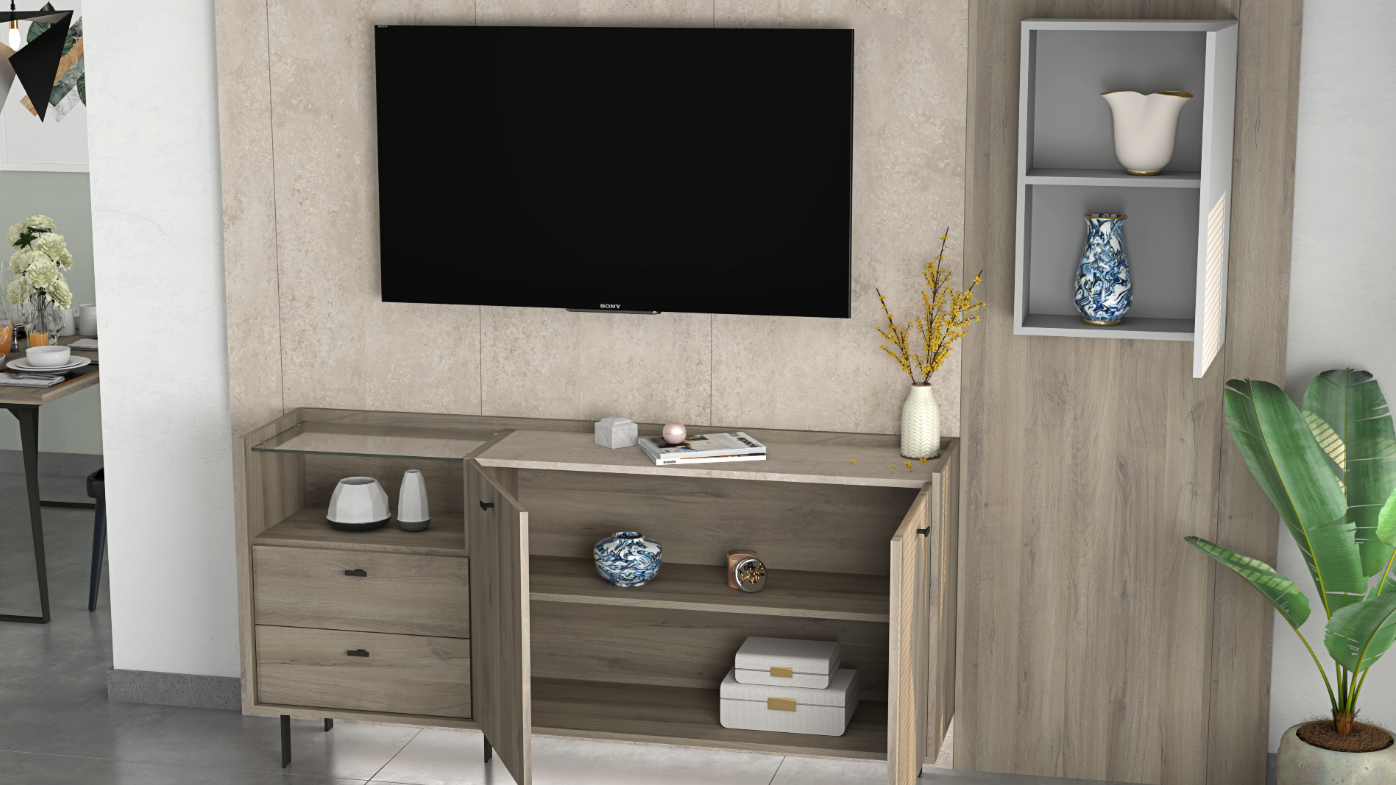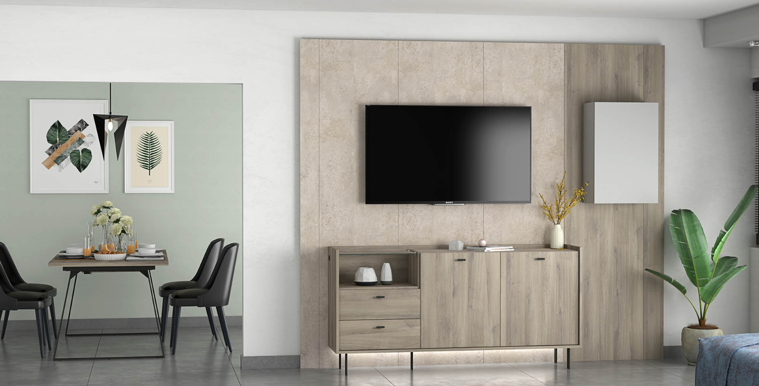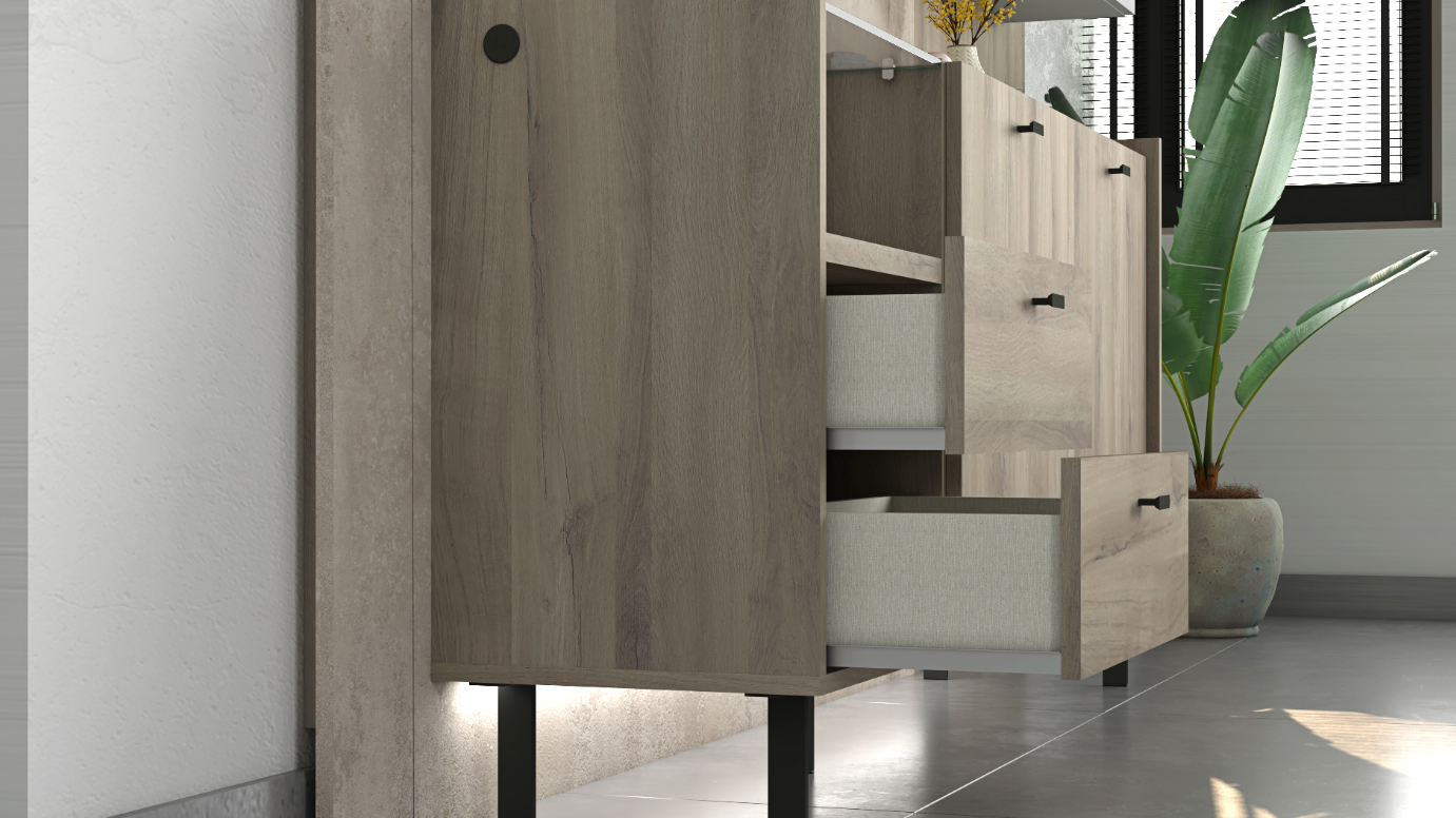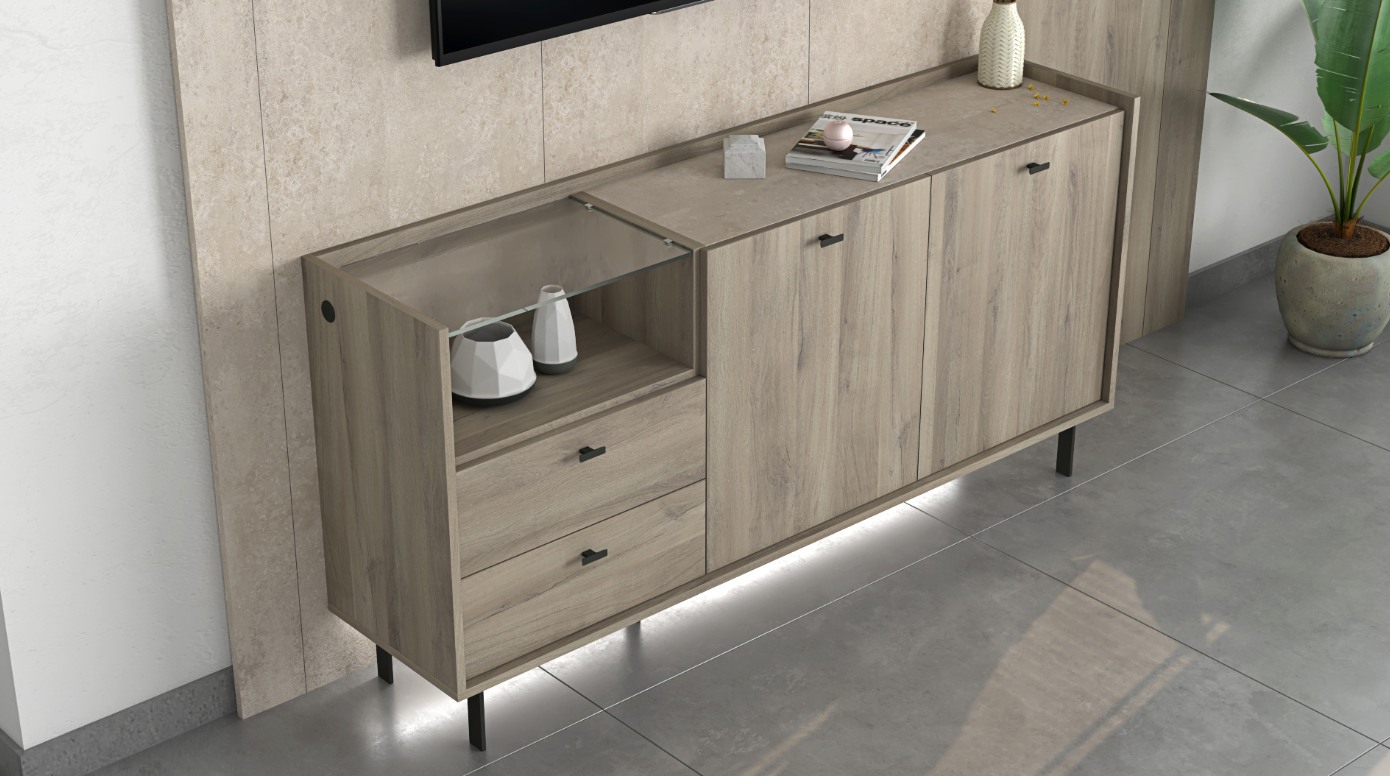 The Collection Lucia offers a sophisticated blend of style and functionality, designed to enrich both your living and dining areas. With its main color in the robust Iron Oak, accented tastefully with Luna Nueva and Gris Claro, this collection embodies elegance and versatility. It seamlessly integrates into modern homes, providing both aesthetic appeal and practical solutions.