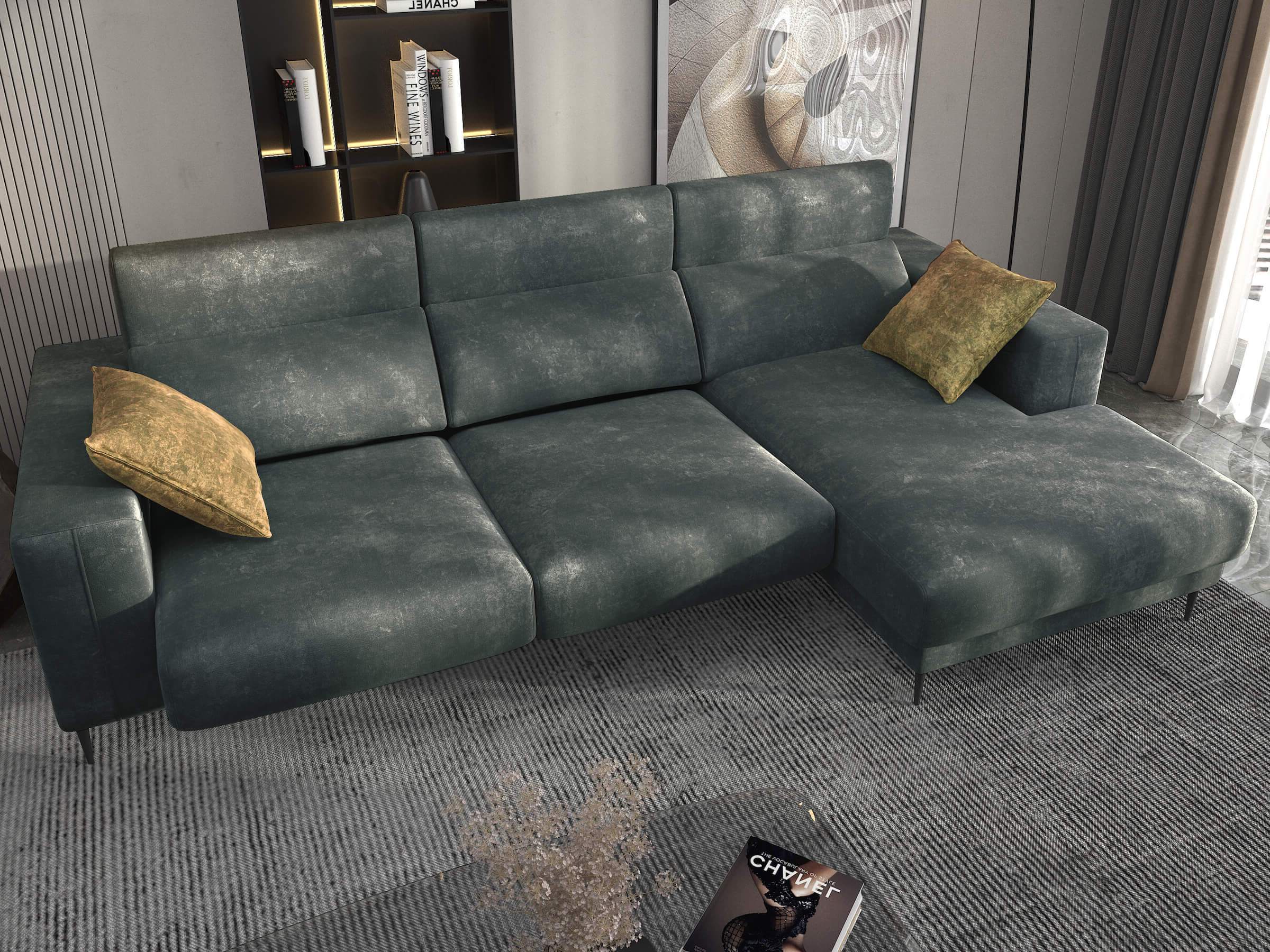 Upholstered in the distinctive Esmeralda fabric (Polpo 10), this sectional adds character and depth while remaining versatile and timeless. The seating is designed for lasting comfort, enhanced by adjustable headrests and sliding seatsthat allow you to personalize both seating depth and relaxation position.